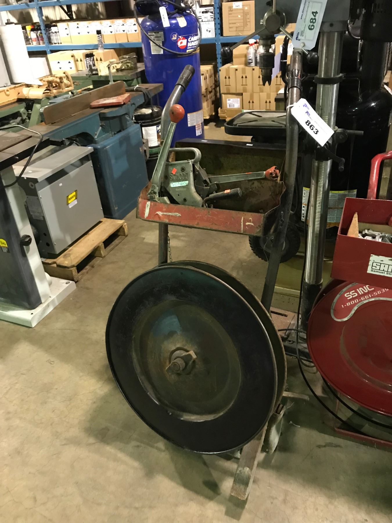 RED & BLACK PORTABLE BANDING CART WITH SIGNODE COMBINATION STRAPPING TOOL
