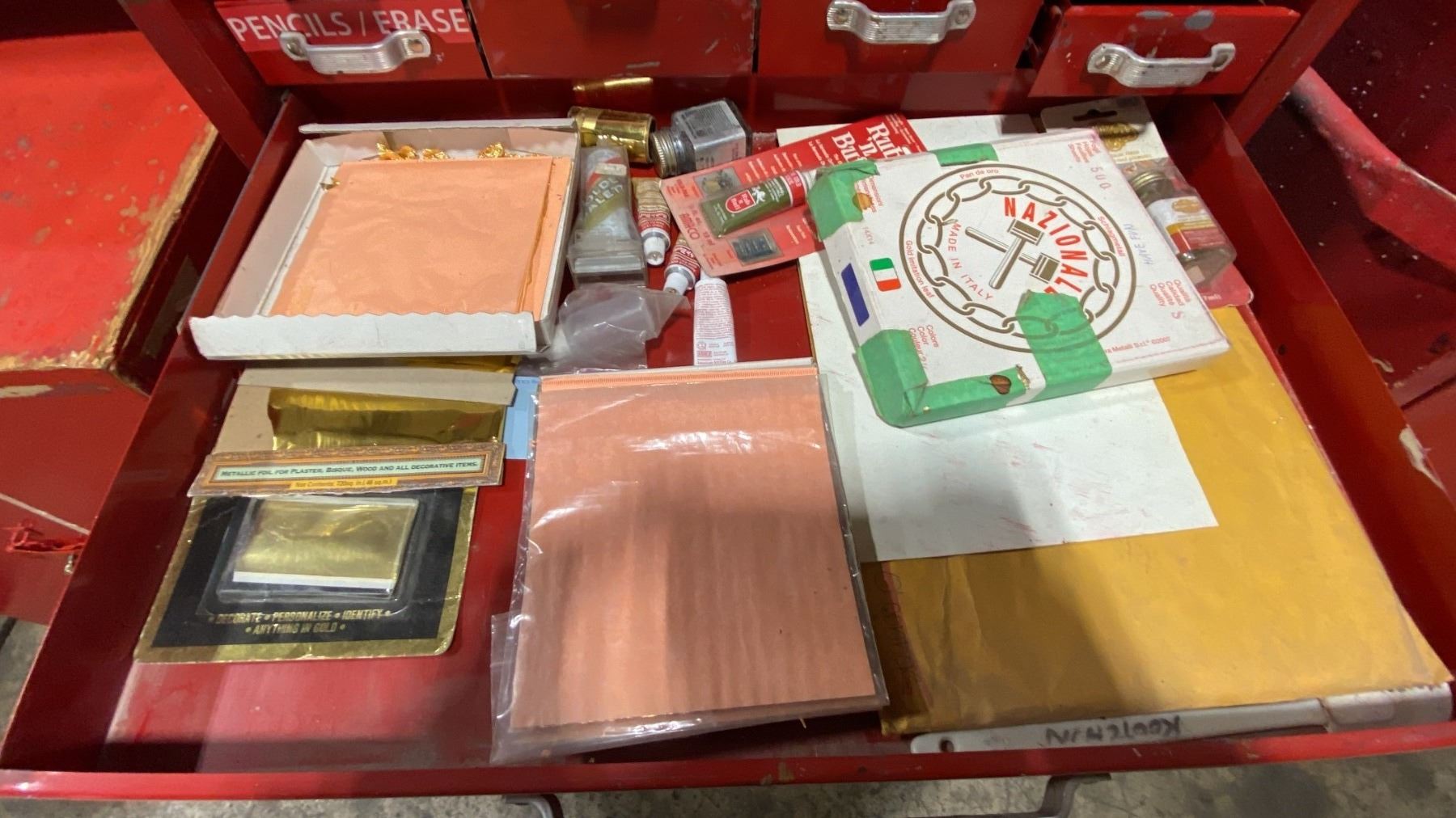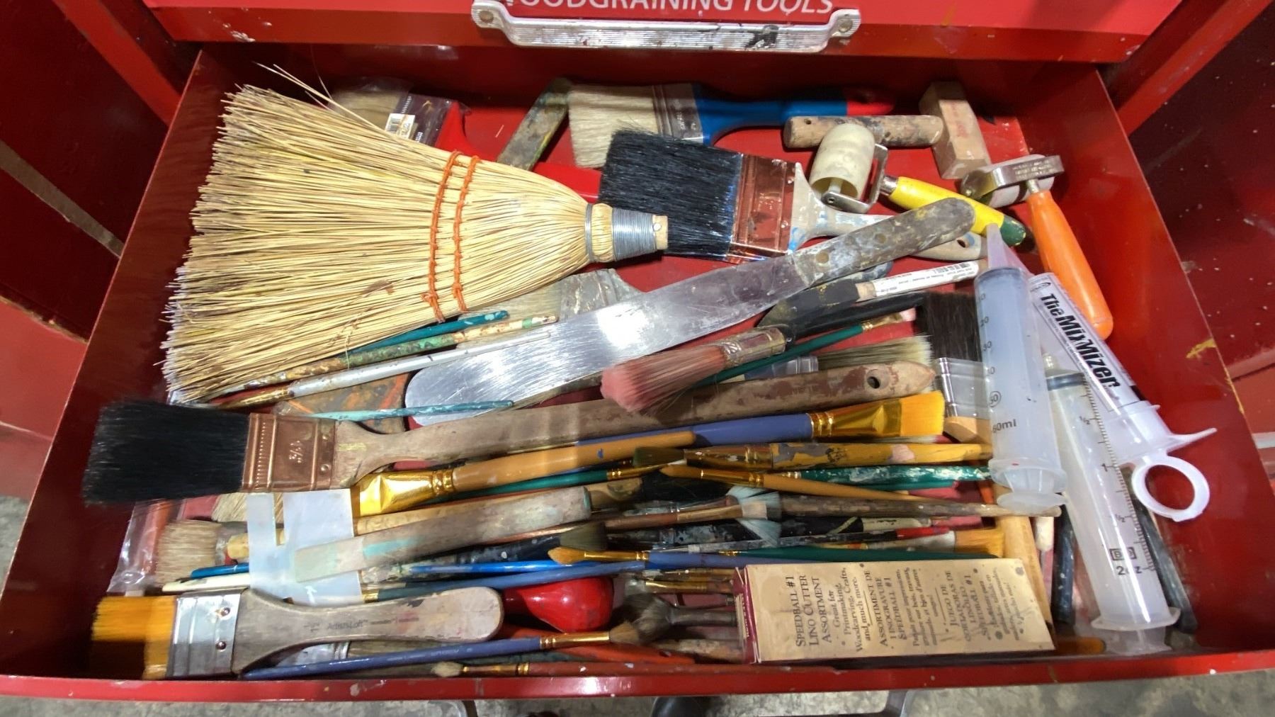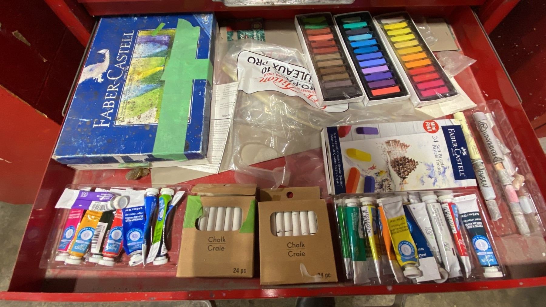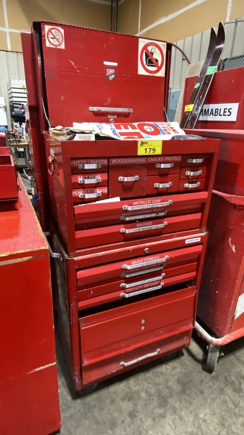 RED MOBILE TOOL STORAGE CHEST WITH ASSORTED ART SUPPLIES INCLUDING CHALK PENS, PAINT BRUSHES, PASTELS, CHALK, SPRAY PAINT, STENCILS, GOLD LEAF PAPER & MORE