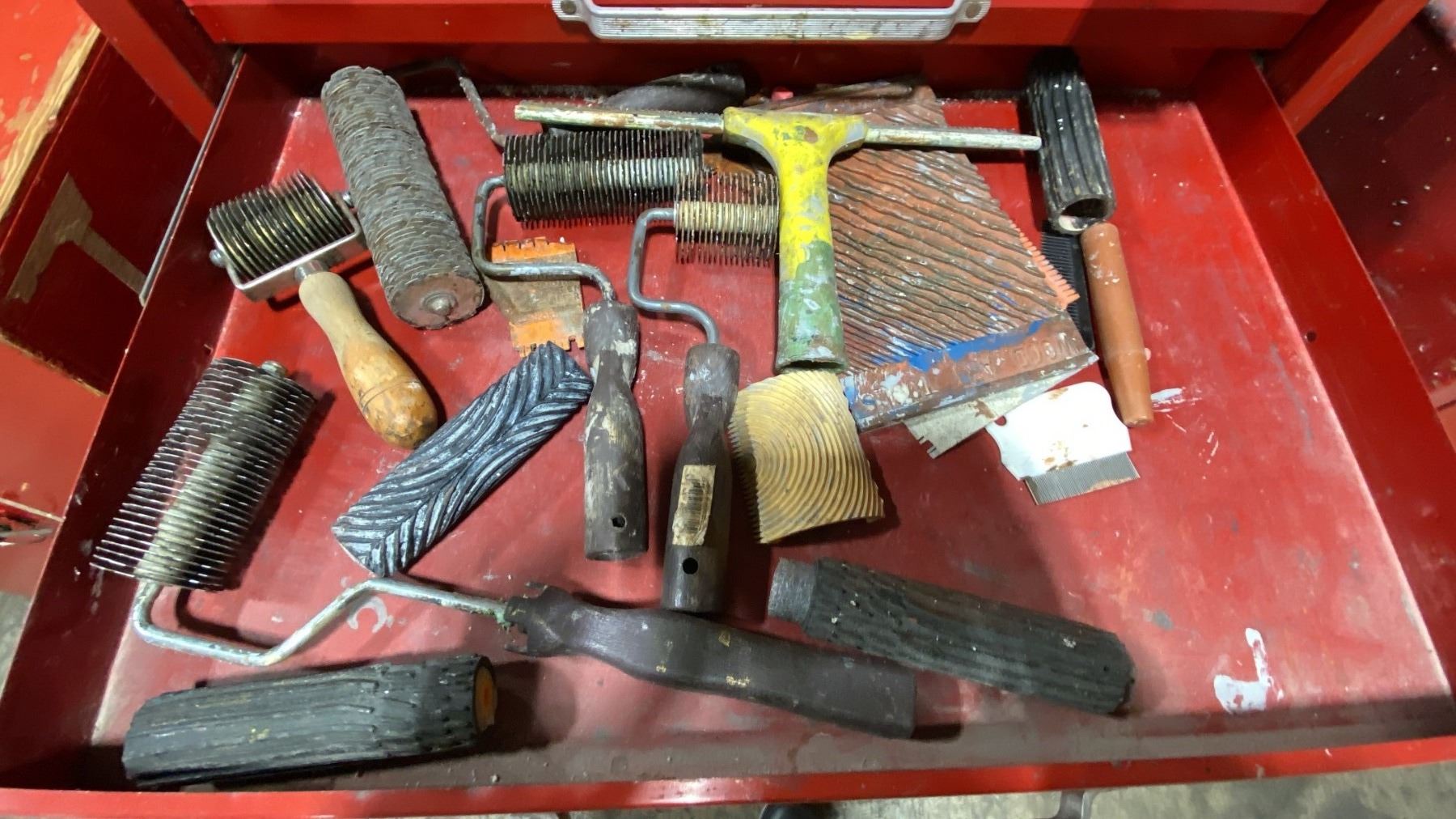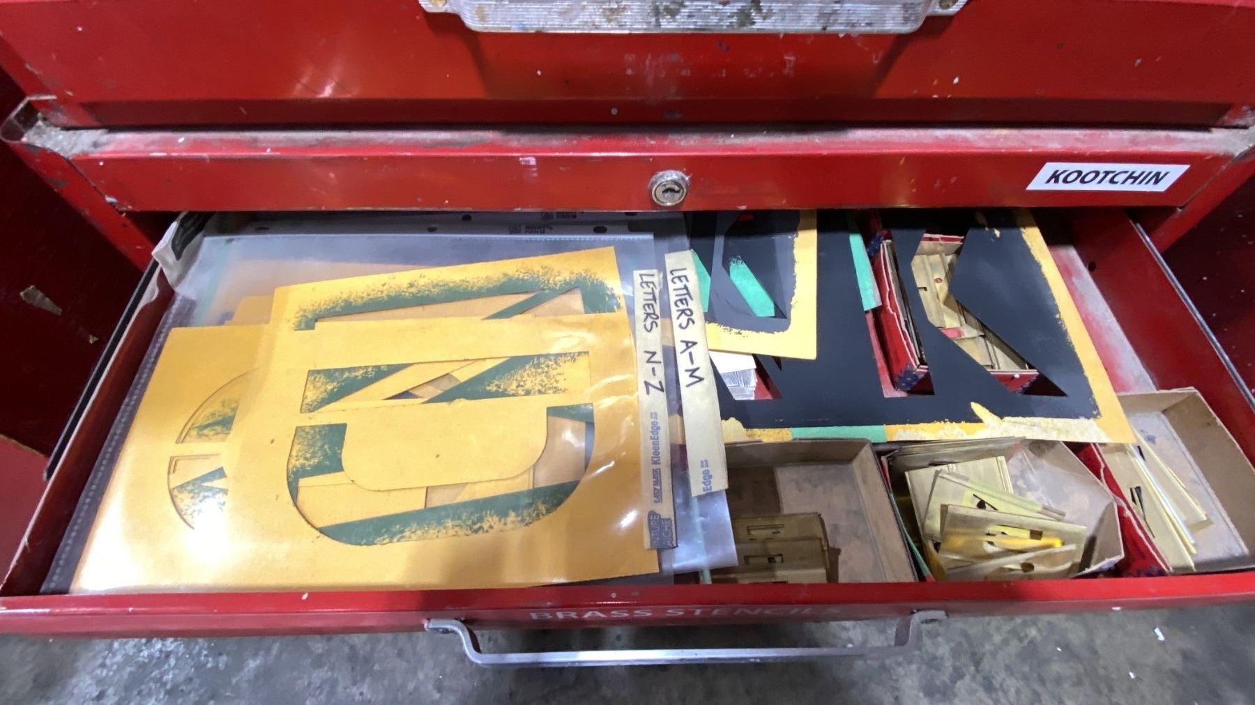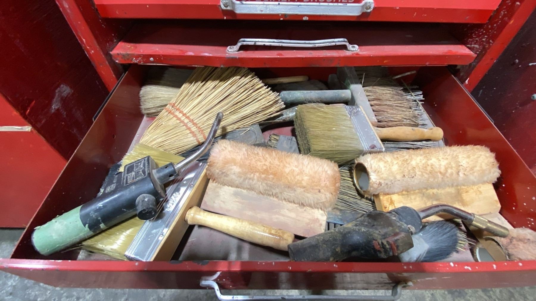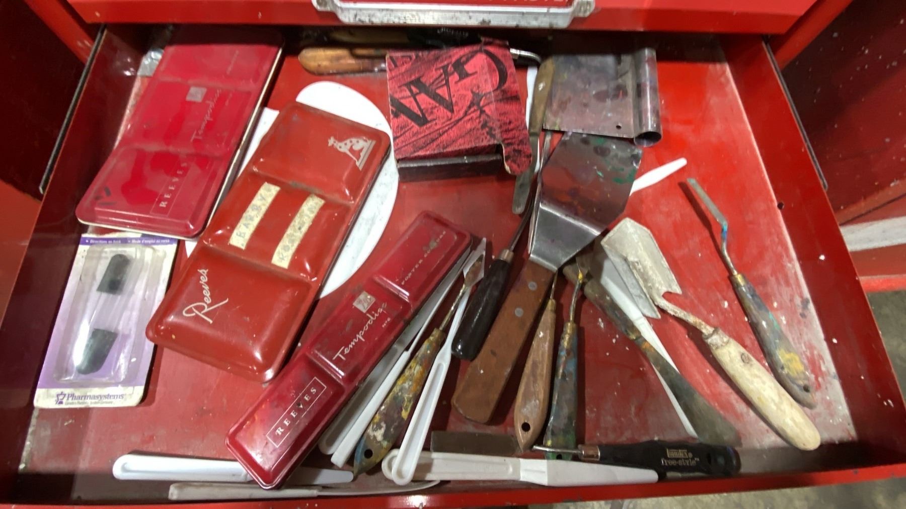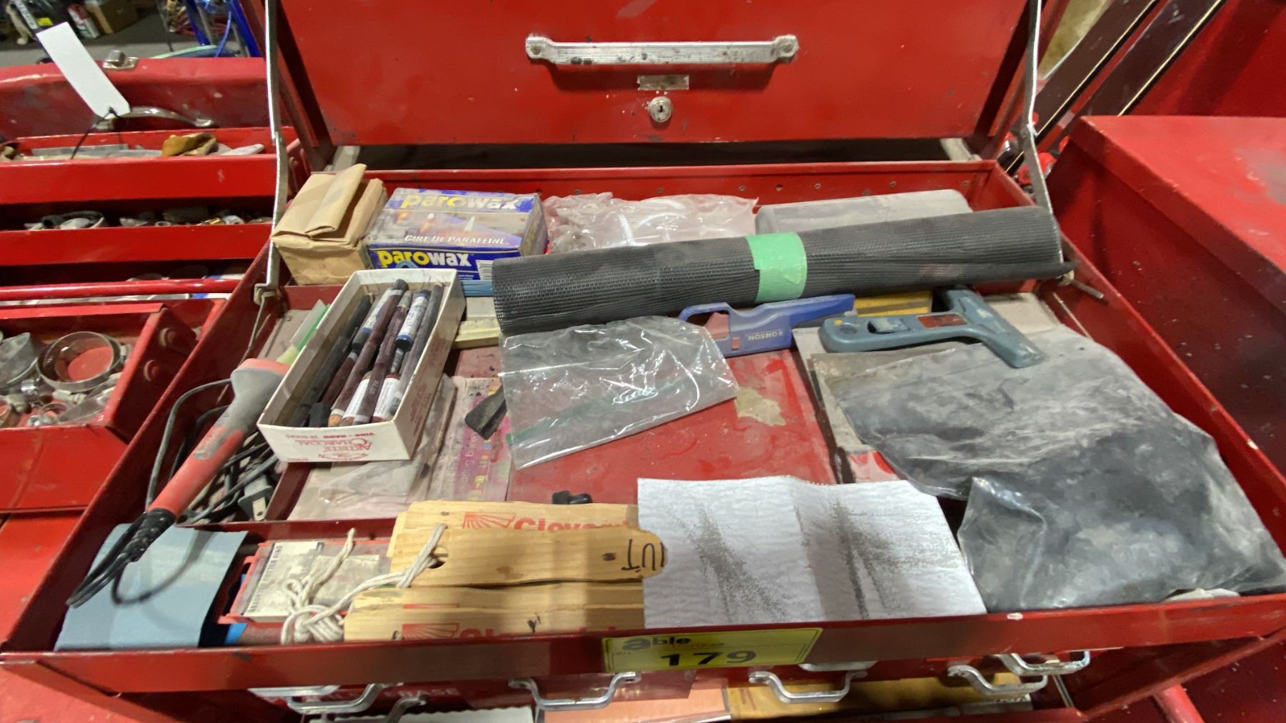 RED MOBILE TOOL STORAGE CHEST WITH ASSORTED ART SUPPLIES INCLUDING CHALK PENS, PAINT BRUSHES, PASTELS, CHALK, SPRAY PAINT, STENCILS, GOLD LEAF PAPER & MORE