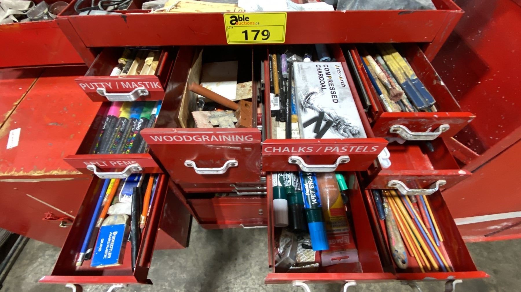 RED MOBILE TOOL STORAGE CHEST WITH ASSORTED ART SUPPLIES INCLUDING CHALK PENS, PAINT BRUSHES,