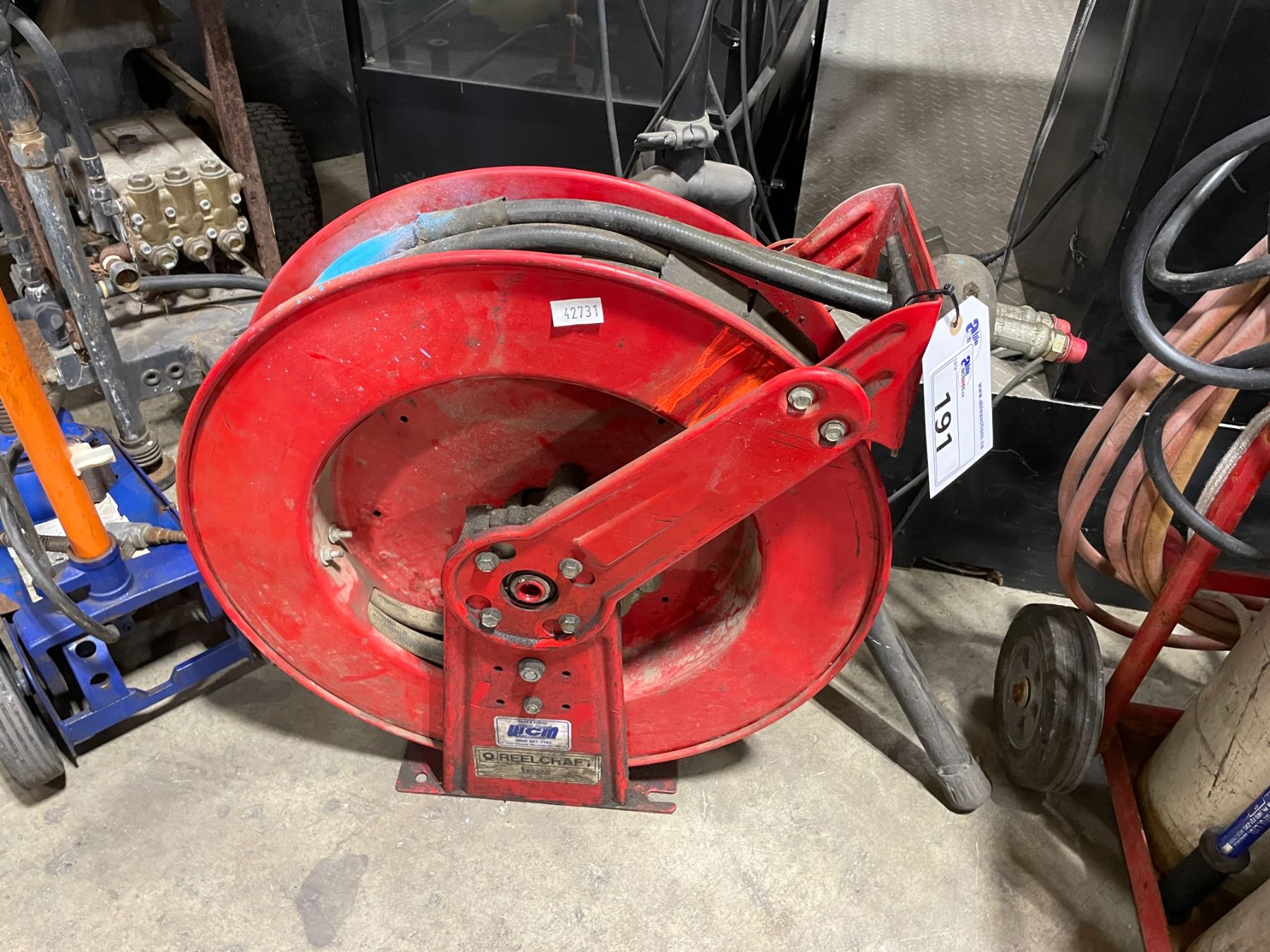 REELCRAFT RED INDUSTRIAL WALL MOUNTED HOSE REEL WITH HYDRAULIC HOSE
