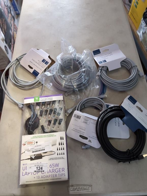 RETRACTABLE UNIVERSAL 65W LAPTOP CHARGER WITH 13 ADAPTER TIPS AND CAT 6 ETHERNET CABLES