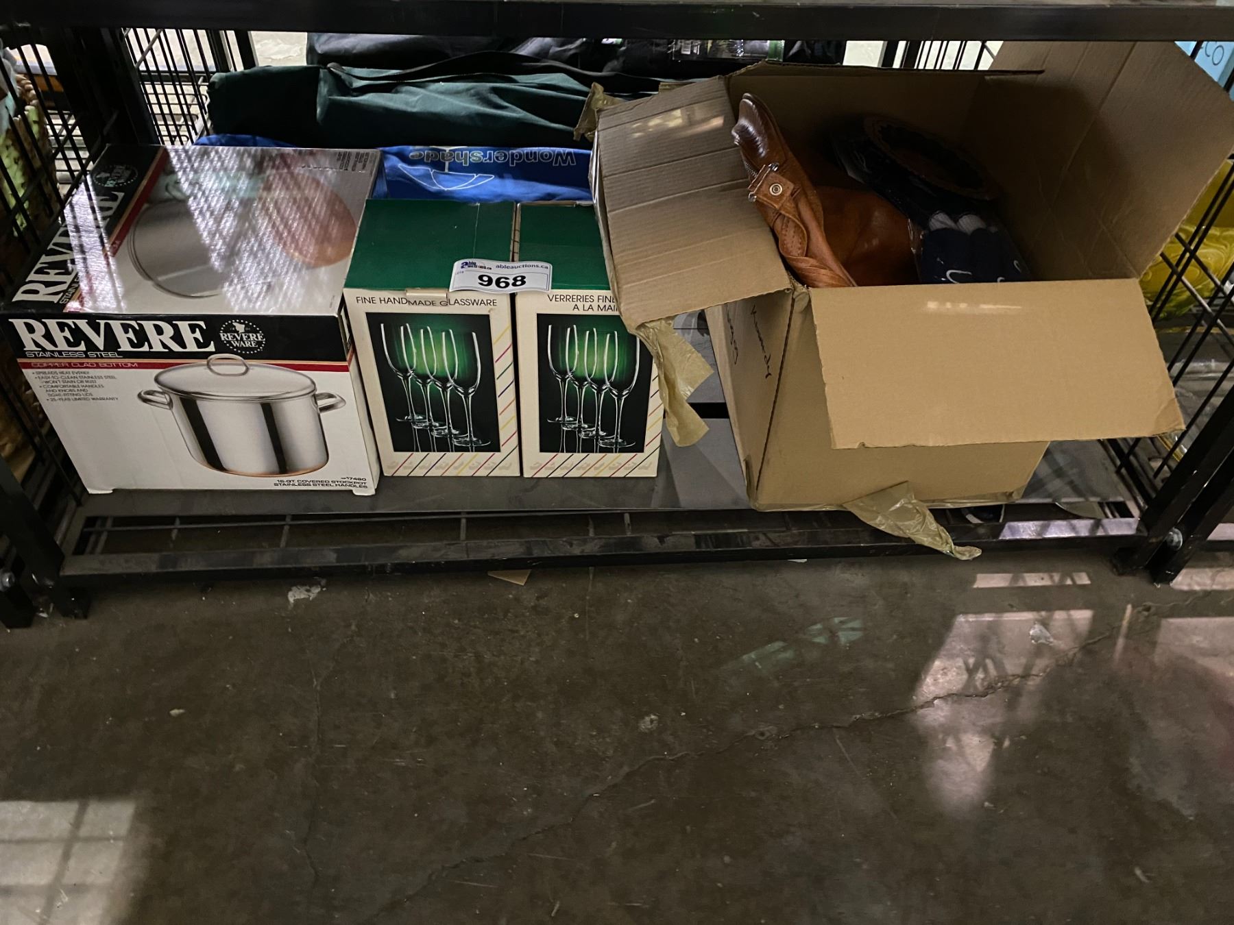 REVERE WARE STAINLESS STEEL POT, 2 BOXES OF FINE HANDMADE GLASSWARE WINE CUPS, BOX OF MISC ITEMS