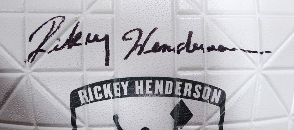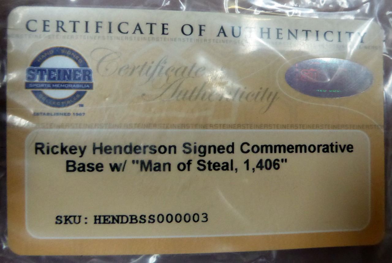 This is a commemorative base that has been hand signed by Rickey Henderson. This item has the official tamper-proof Steiner Sports hologram and matching certificate of authenticity.
