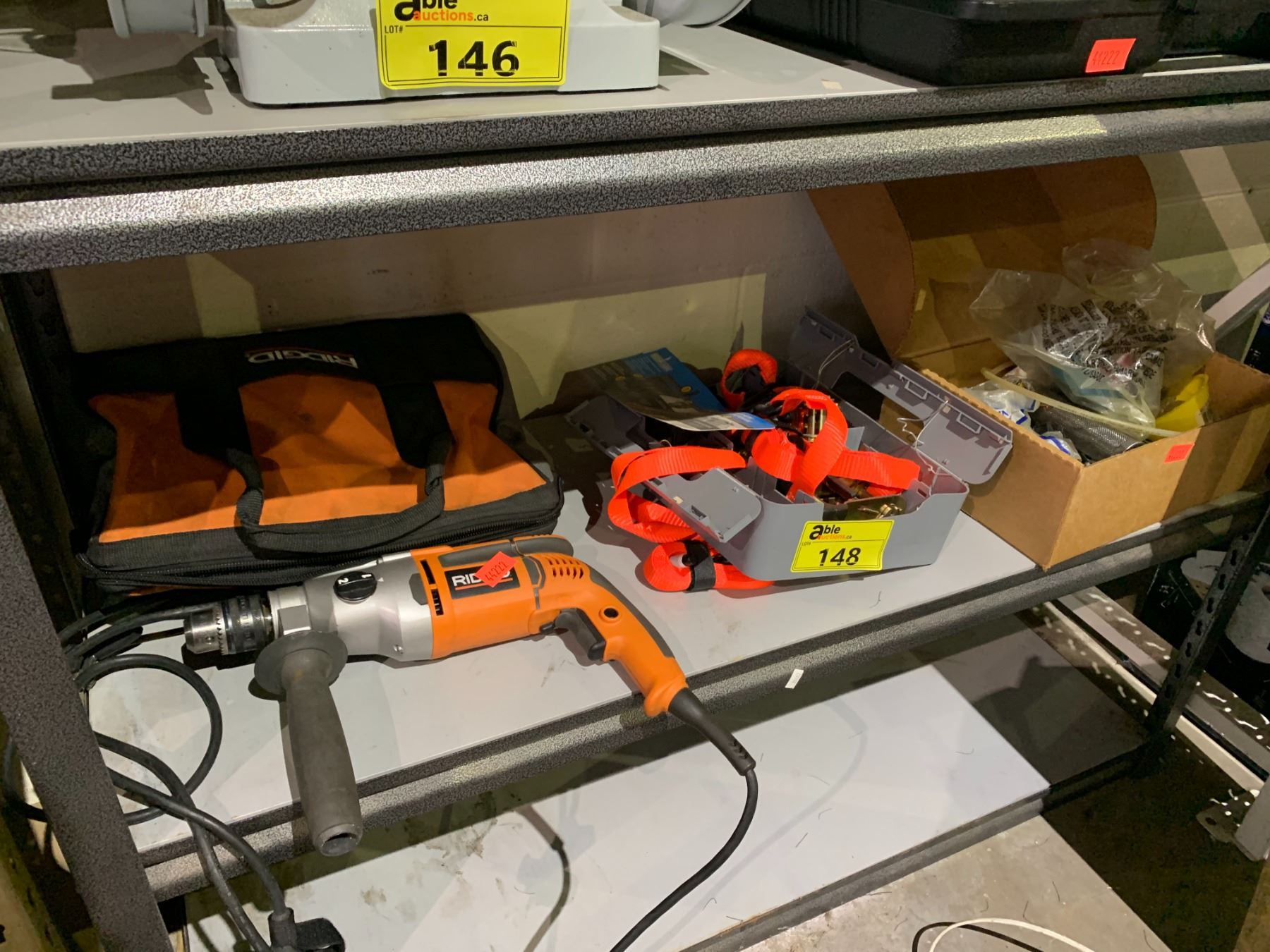 RIDGID HAMMER DRILL, RATCHET STRAPS AND ASSORTED HARDWARE