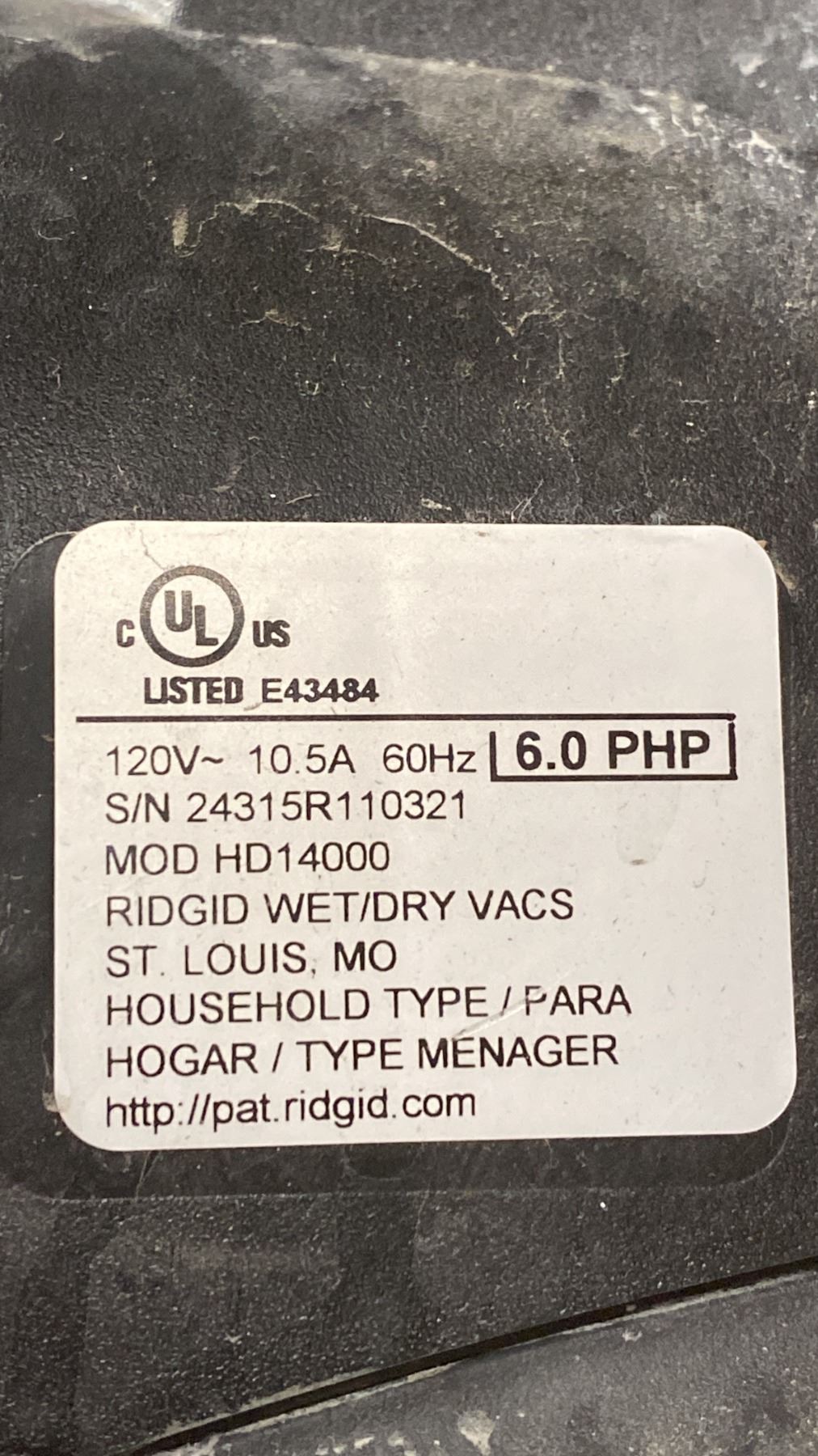 RIDGID HD14000 WET/DRY SHOP VAC *NO HOSE OR ATTACHMENTS INCLUDED*