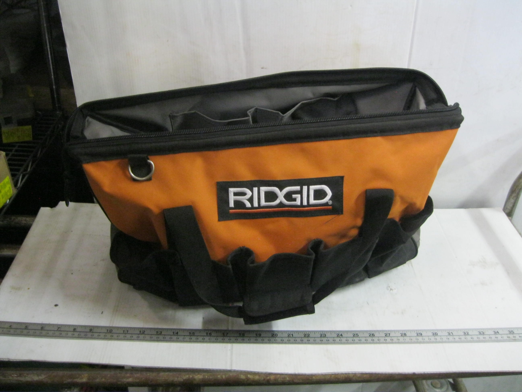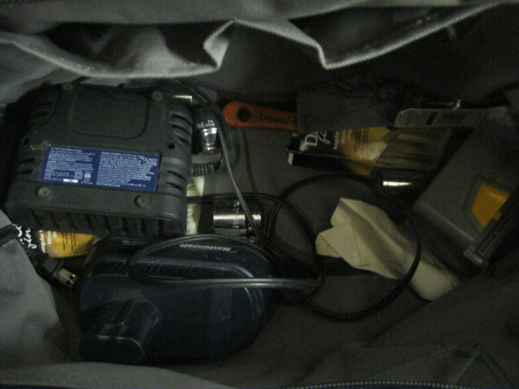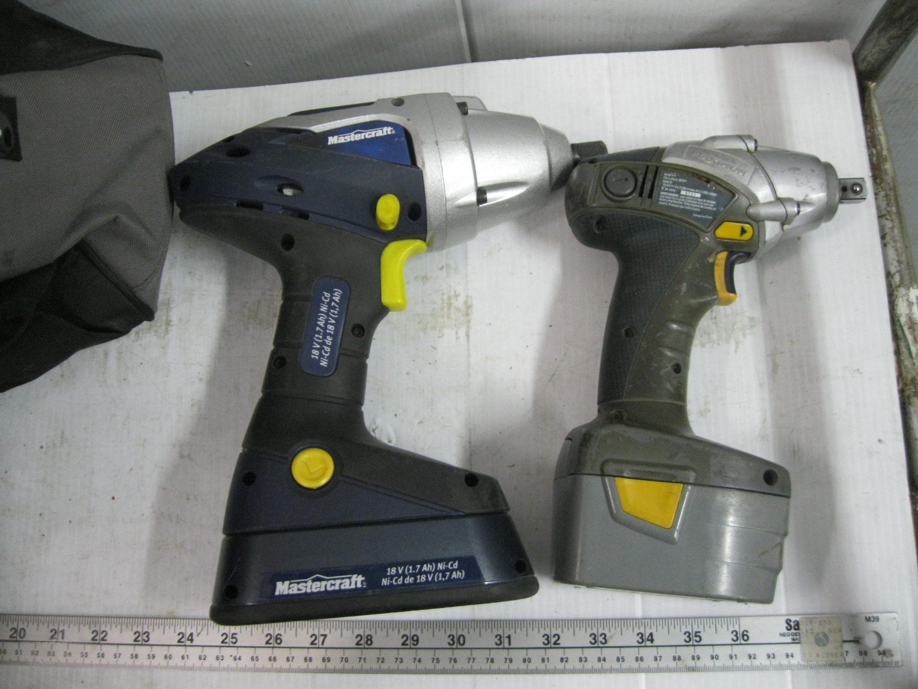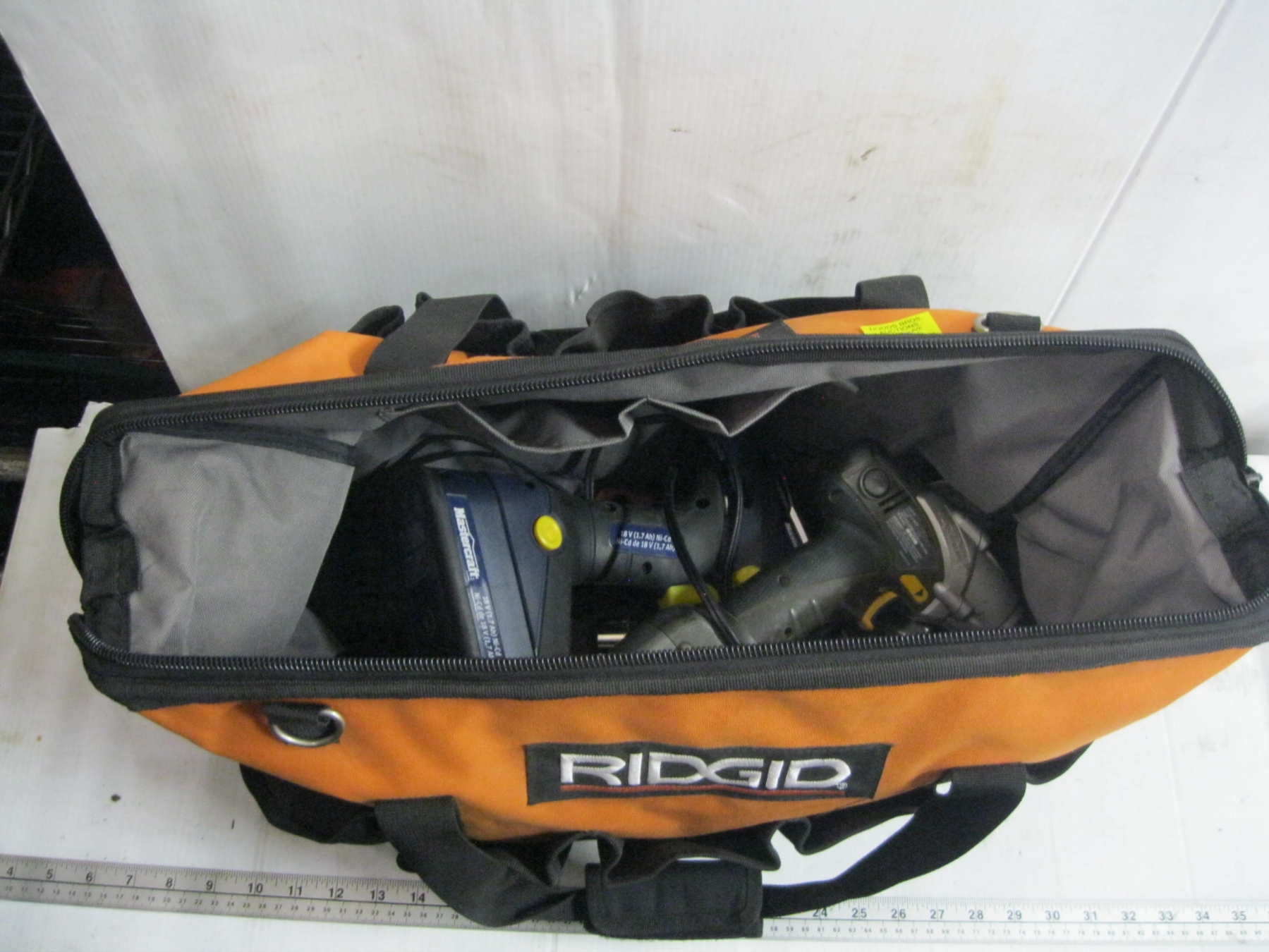 RIGID TOOL BAG W/MASTERCRAFT CORDLESS TOOLS: 2 - 1/2" IMPACT GUNS, BATTERIES, CHARGERS, ETC.