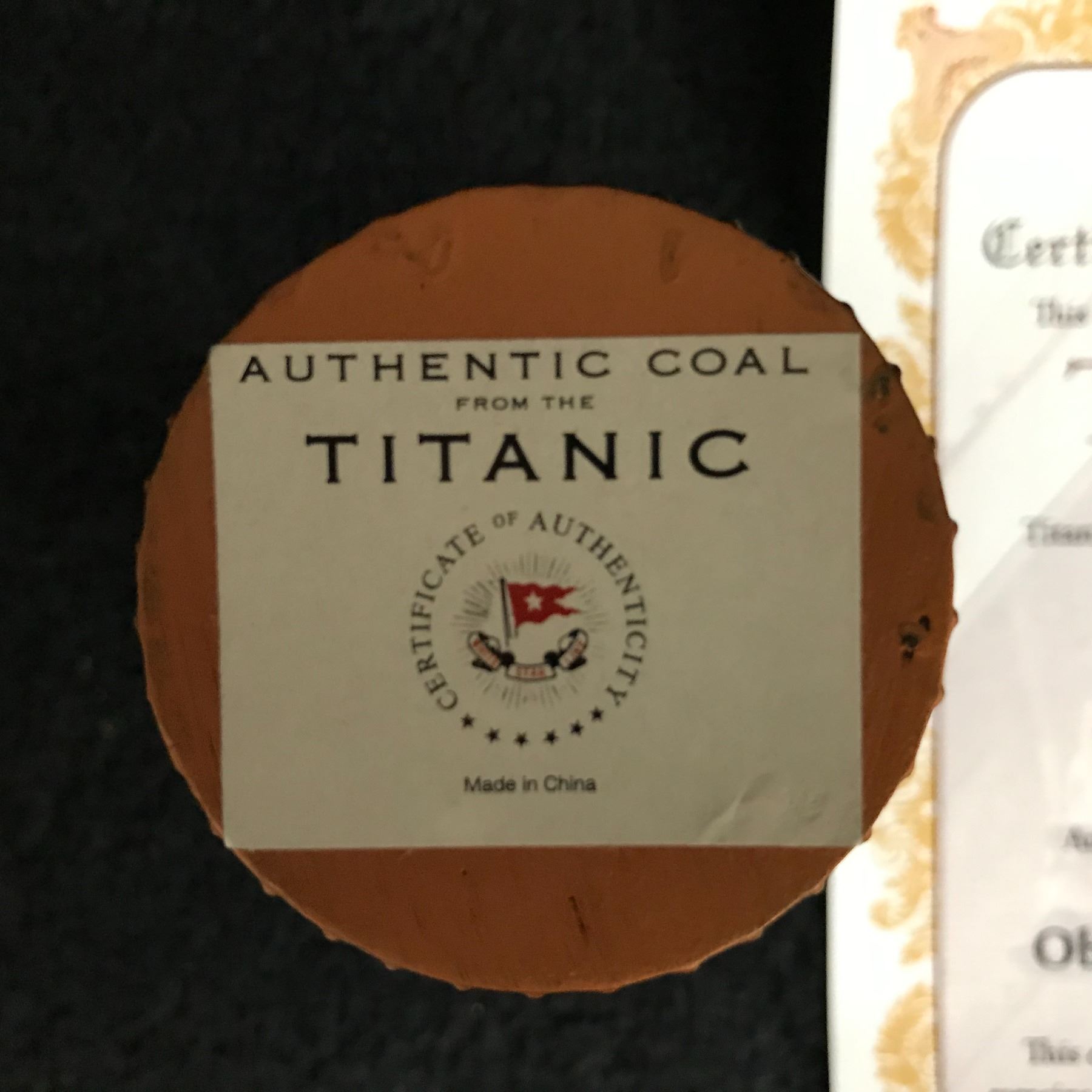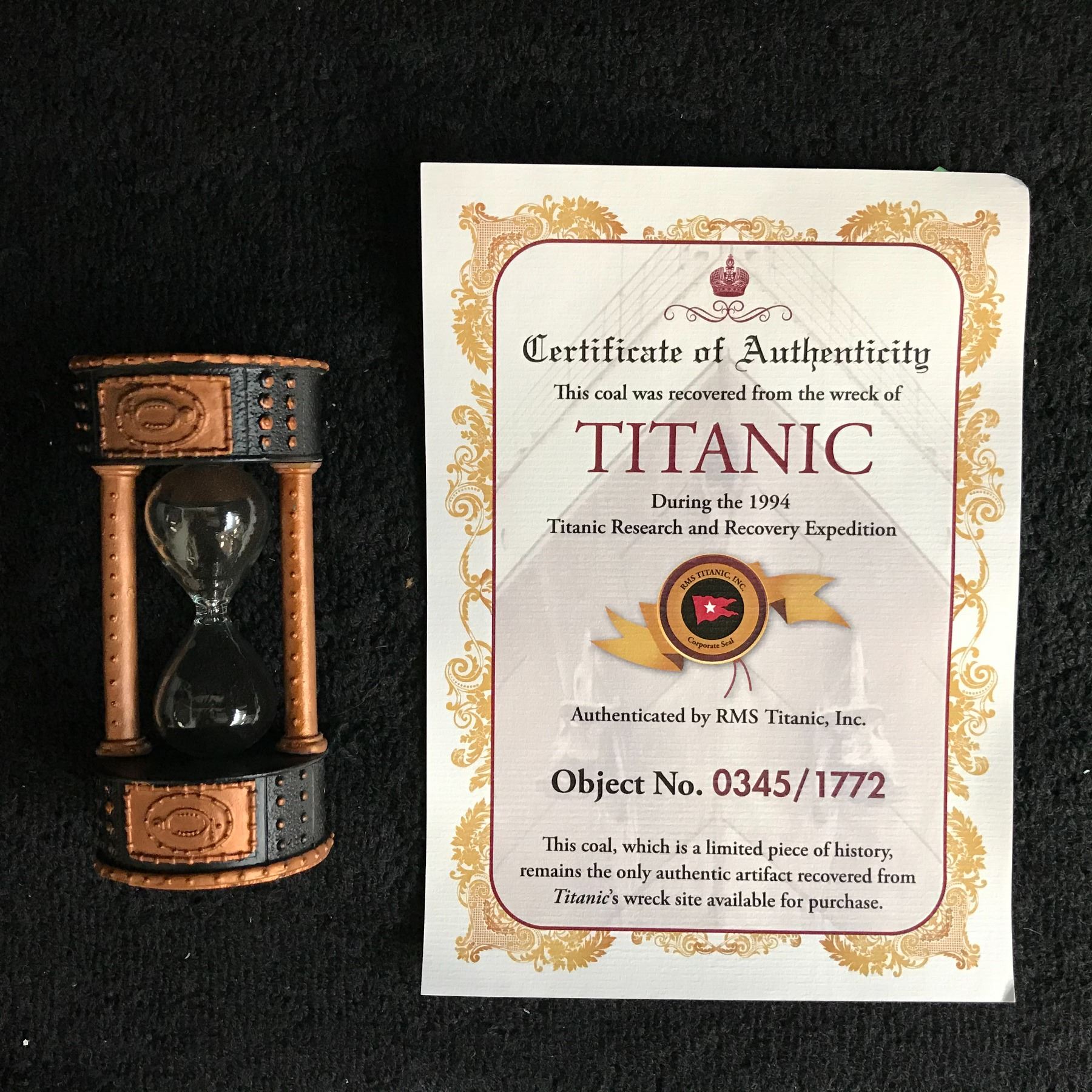 RMS Titanic Coal Hourglass - Includes a piece of authentic coal recovered from the wreck site of the ship and black sand inside the hourglass. Comes with a certificate of authenticity.