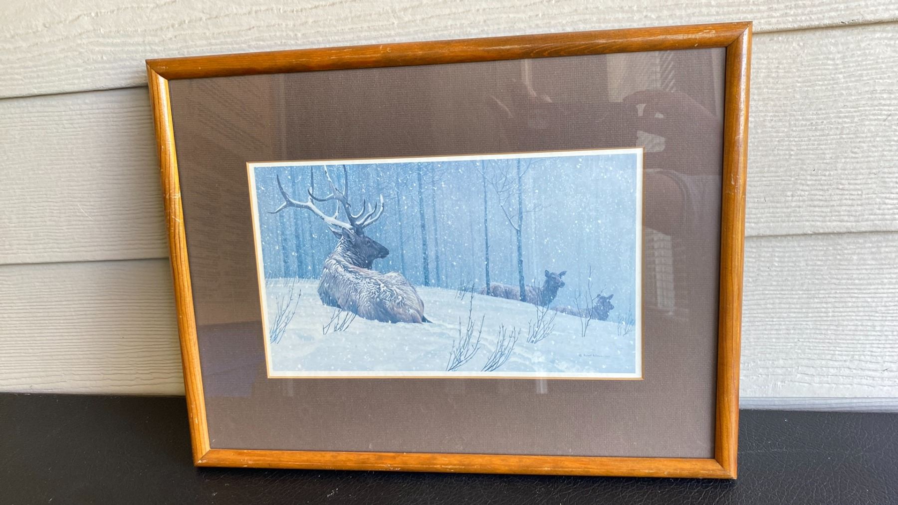 ROBERT BATEMAN "EVENING SNOWFALL - AMERICAN ELK" FRAMED PRINT (17" X 13" FRAMED)