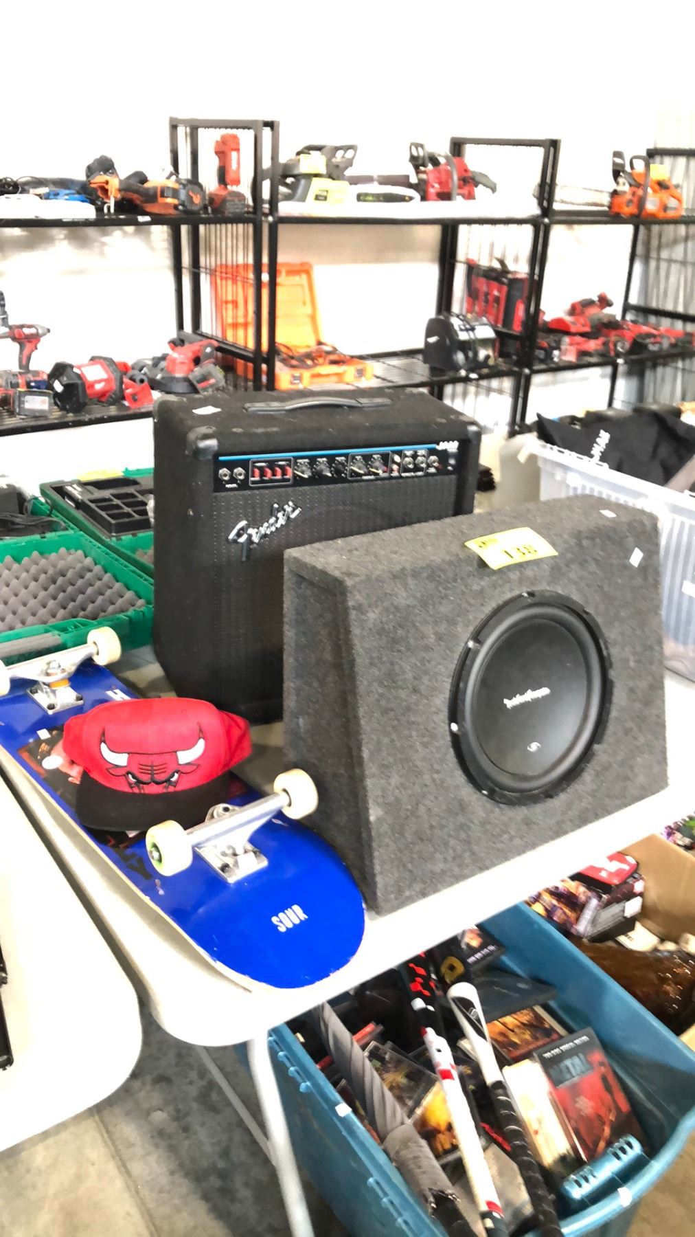 ROCKFORD FOSGATE R1 SUBWOOFER SPEAKER, FENDER GUITAR AMP JAM MODEL, 31  SKATEBOARD AND BULLS HAT