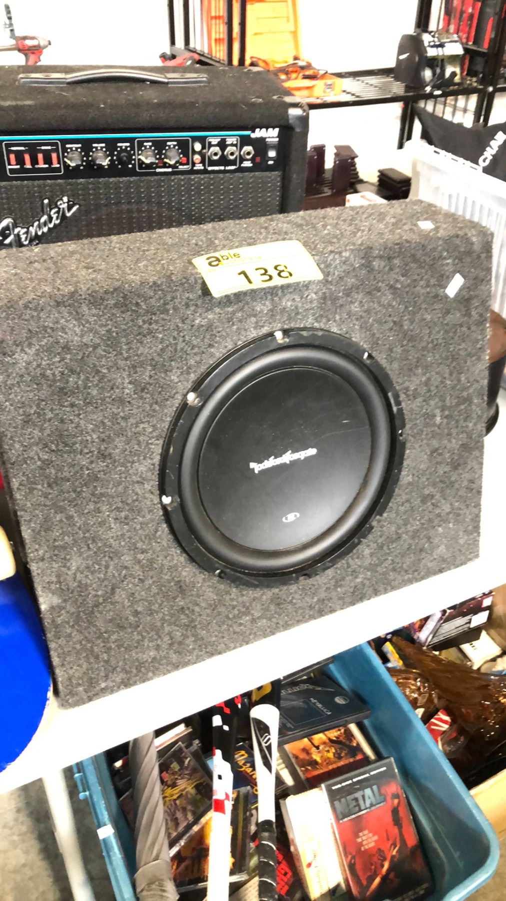 ROCKFORD FOSGATE R1 SUBWOOFER SPEAKER, FENDER GUITAR AMP JAM MODEL, 31" SKATEBOARD AND BULLS HAT