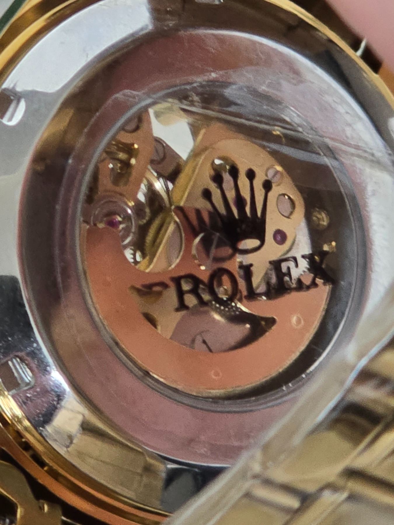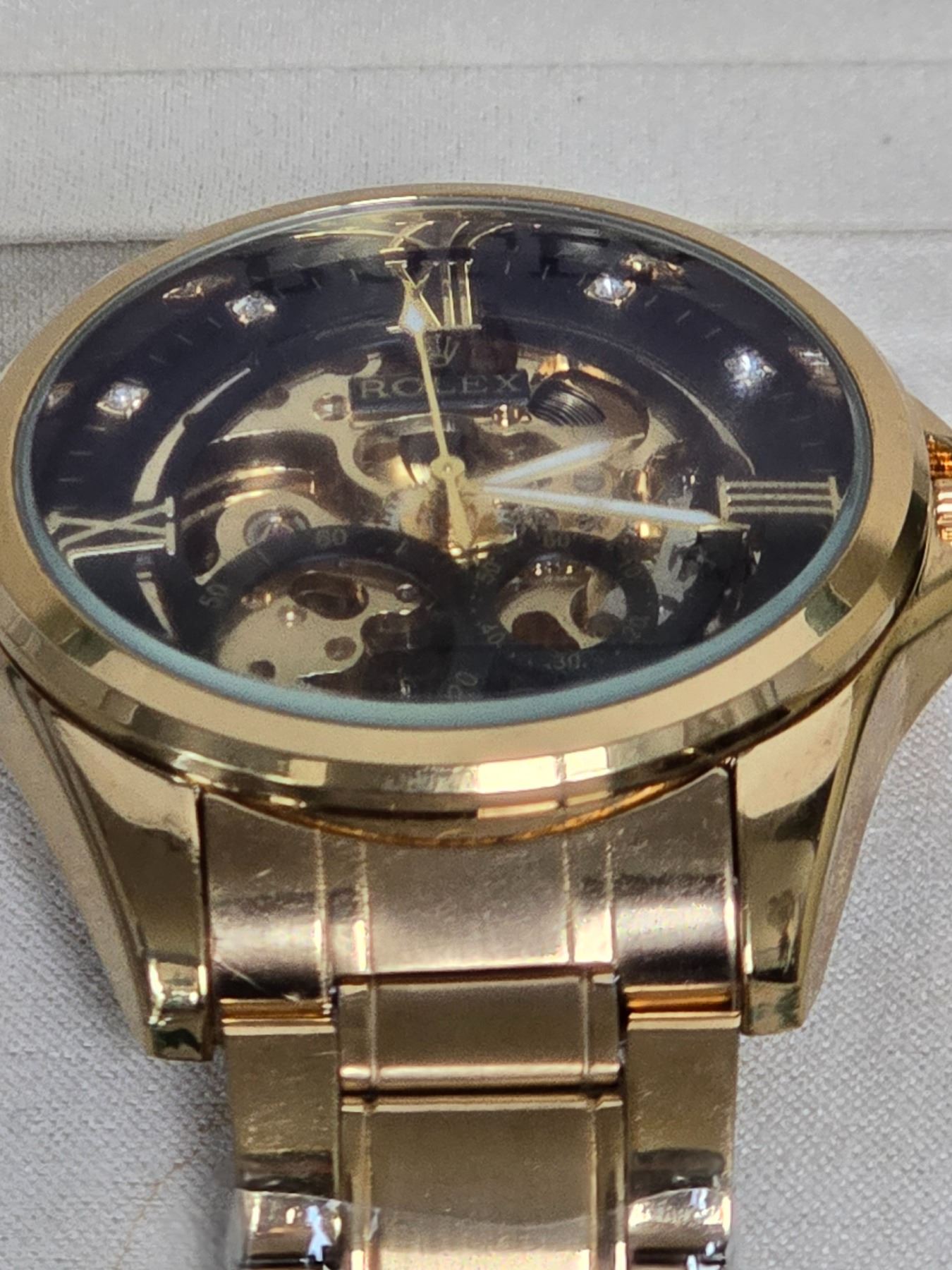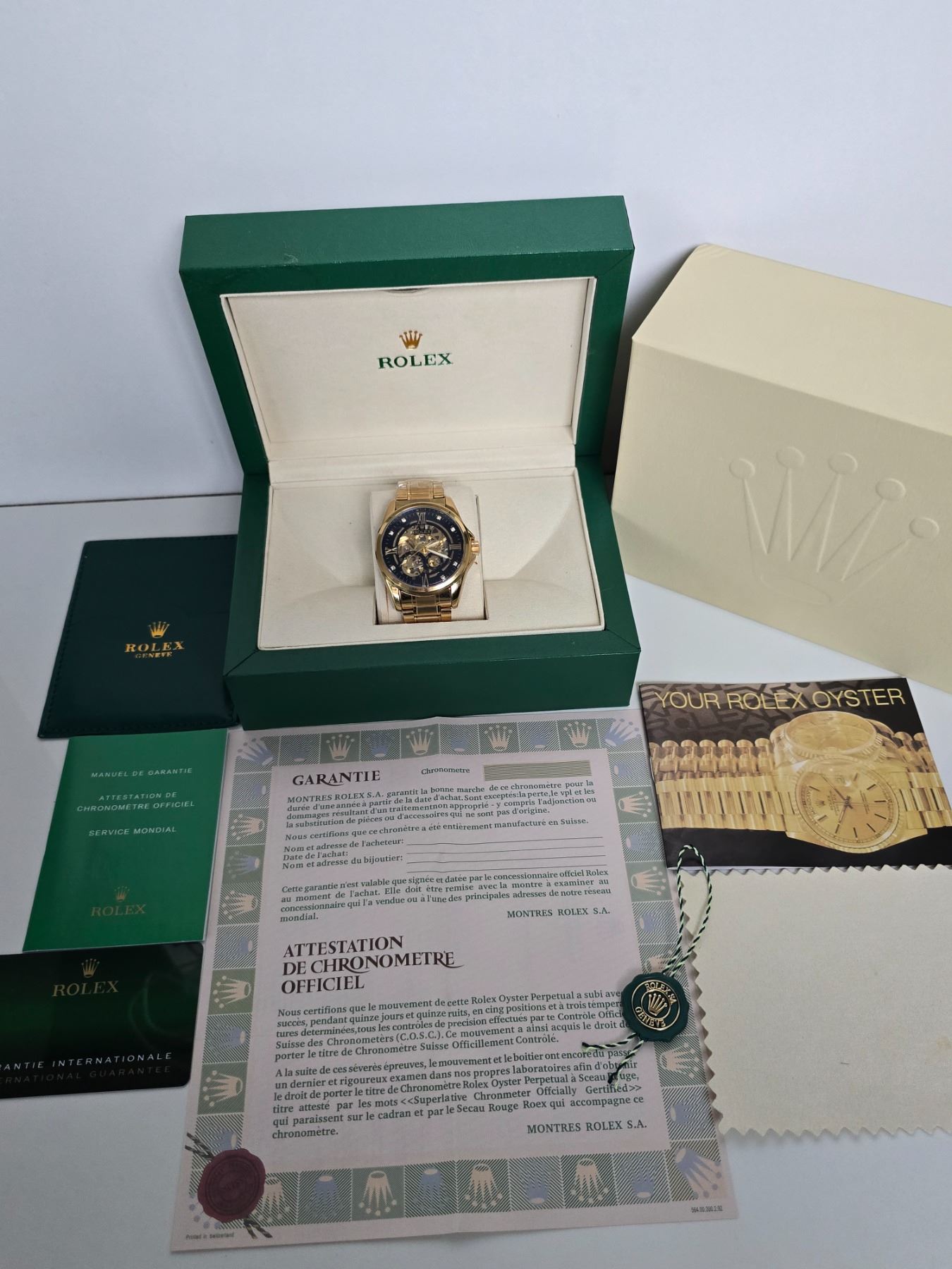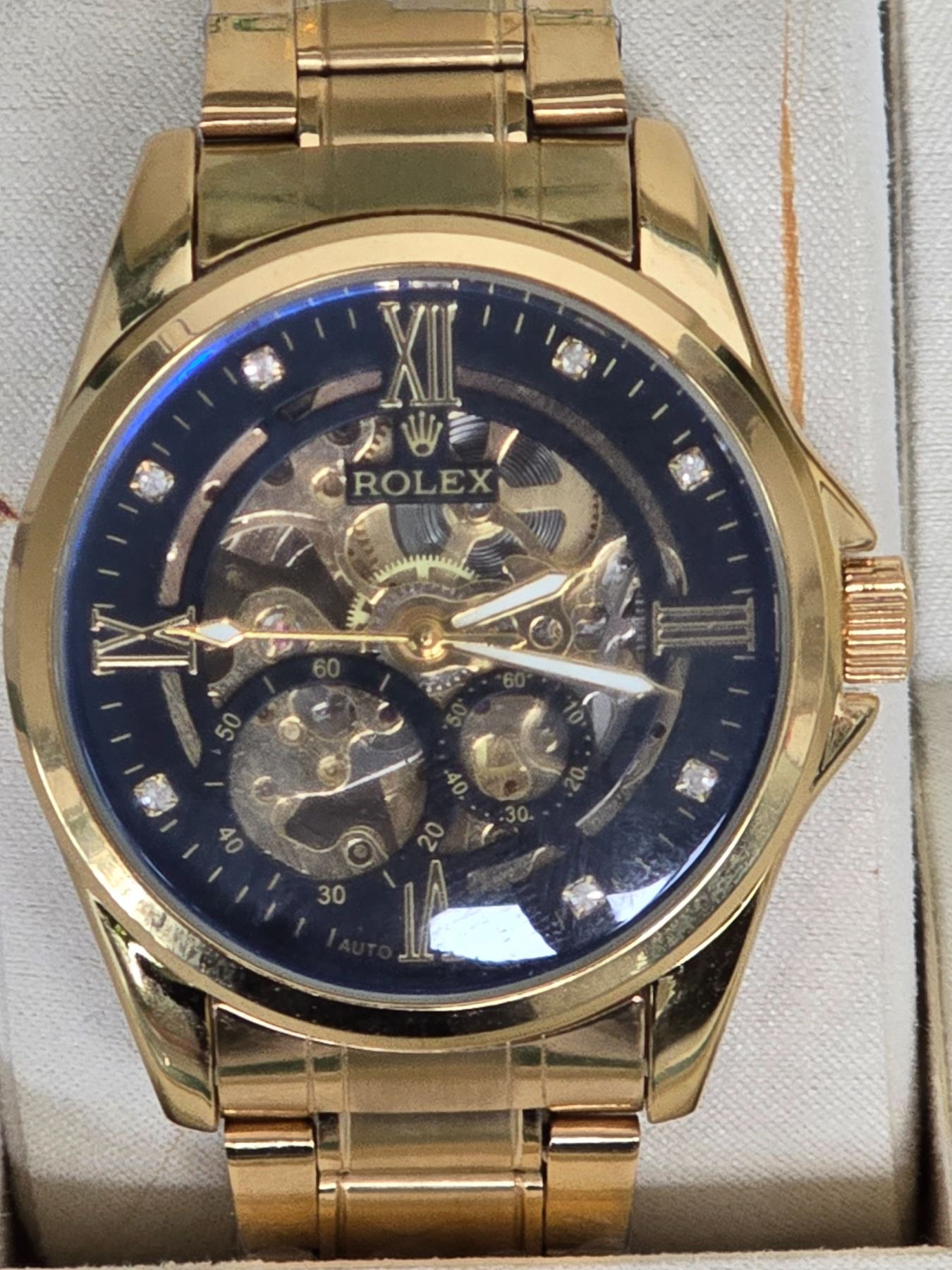 ROLEX DATE JUST 40 MM FULLY AUTOMATIC BLACK SKELETON DIAL ROLEX HIGH QUALITY REPLICA WATCH. ORIGINAL HAS 18K YELLOW GOLD CASE AND OYSTER BRACELET. 904 L STAINLESS STEEL USED – THE SAME STEEL USED IN AUTHENTIC ROLEX WATCHES. FULL SET WITH BOX, PAPERS AND BAG.