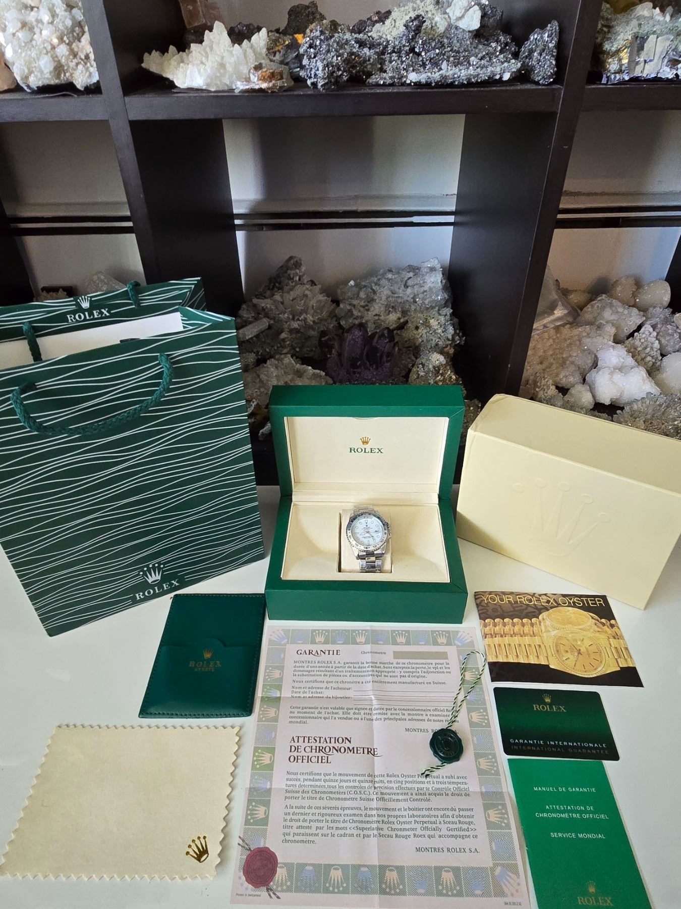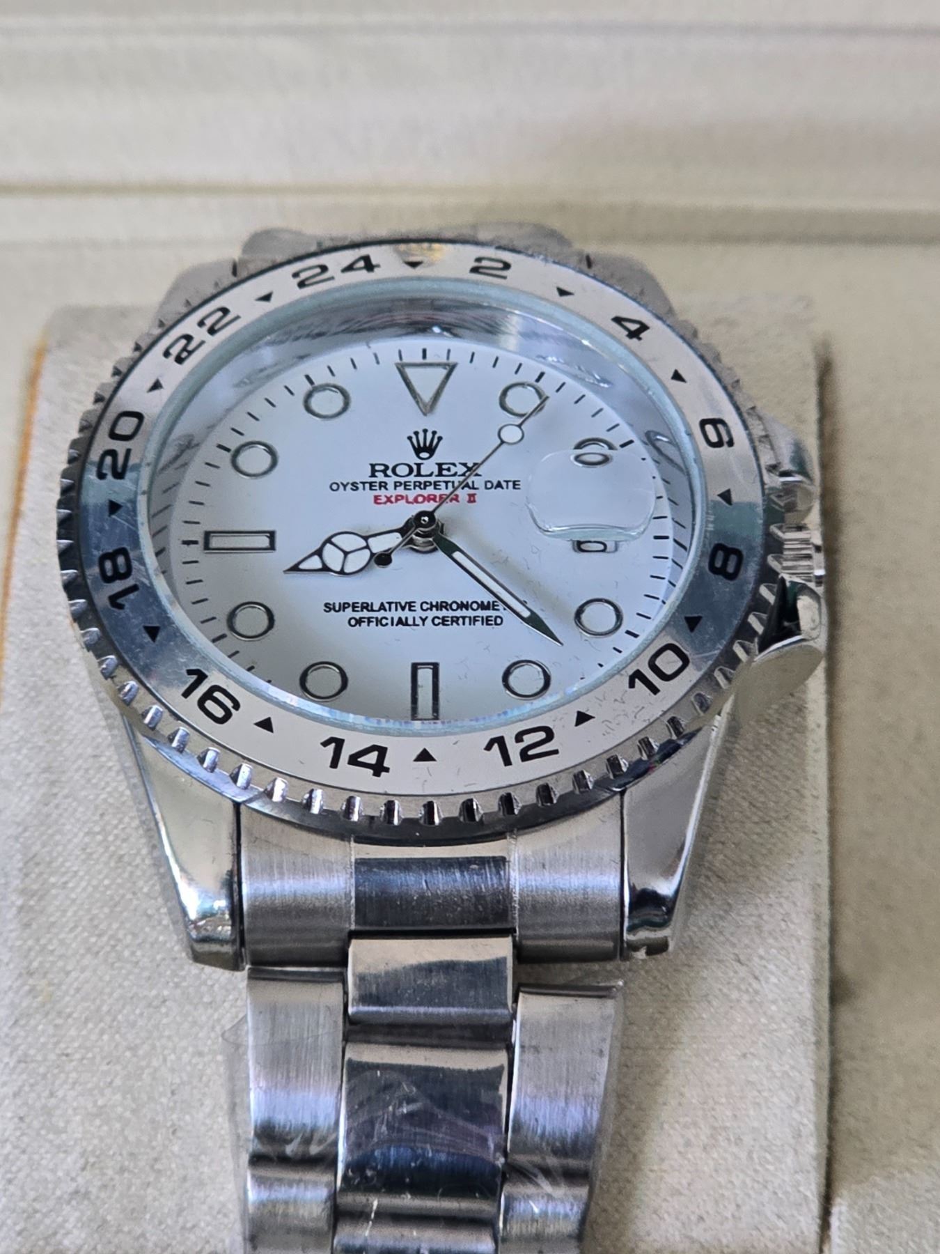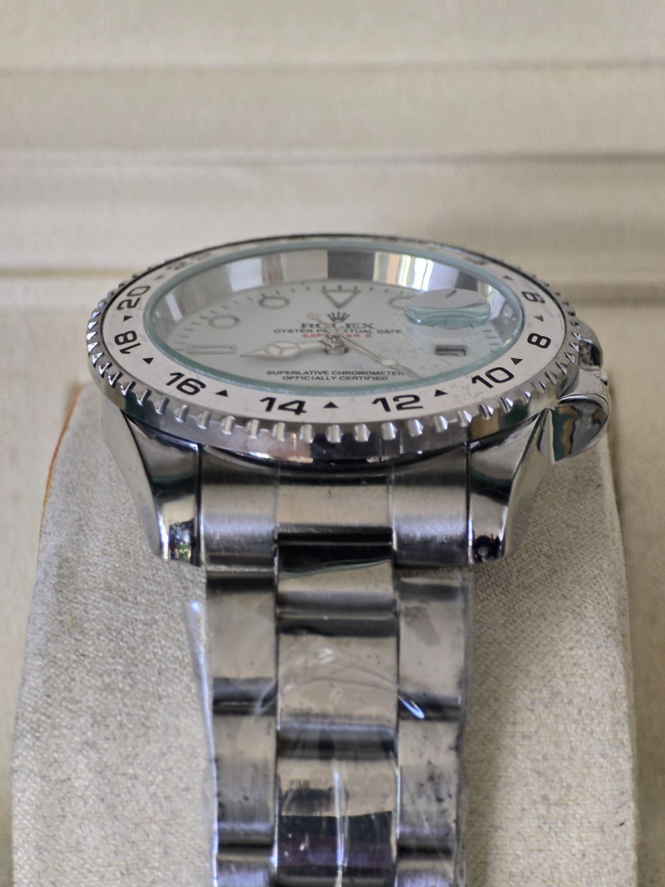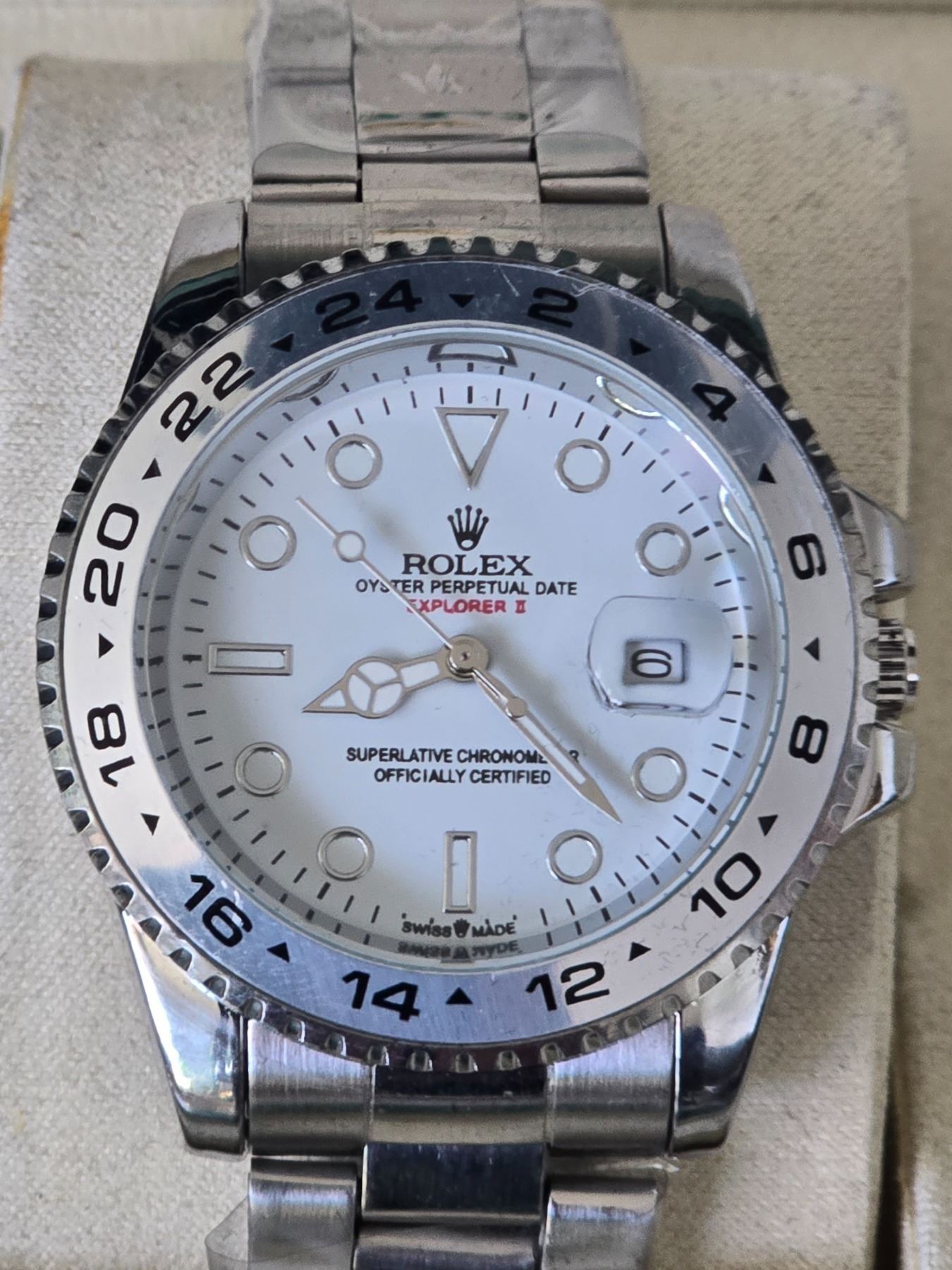 ROLEX EXPLORER II 16570 REPLICA WATCH. STAINLESS-STEEL CASE AND OYSTER BRACELET. WHITE DIAL AND STAINLESS-STEEL BEZEL. FULL SET WITH CASE, PAPERS AND BAG