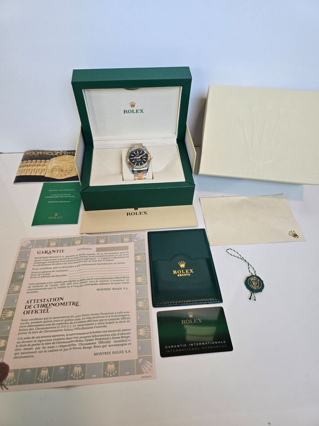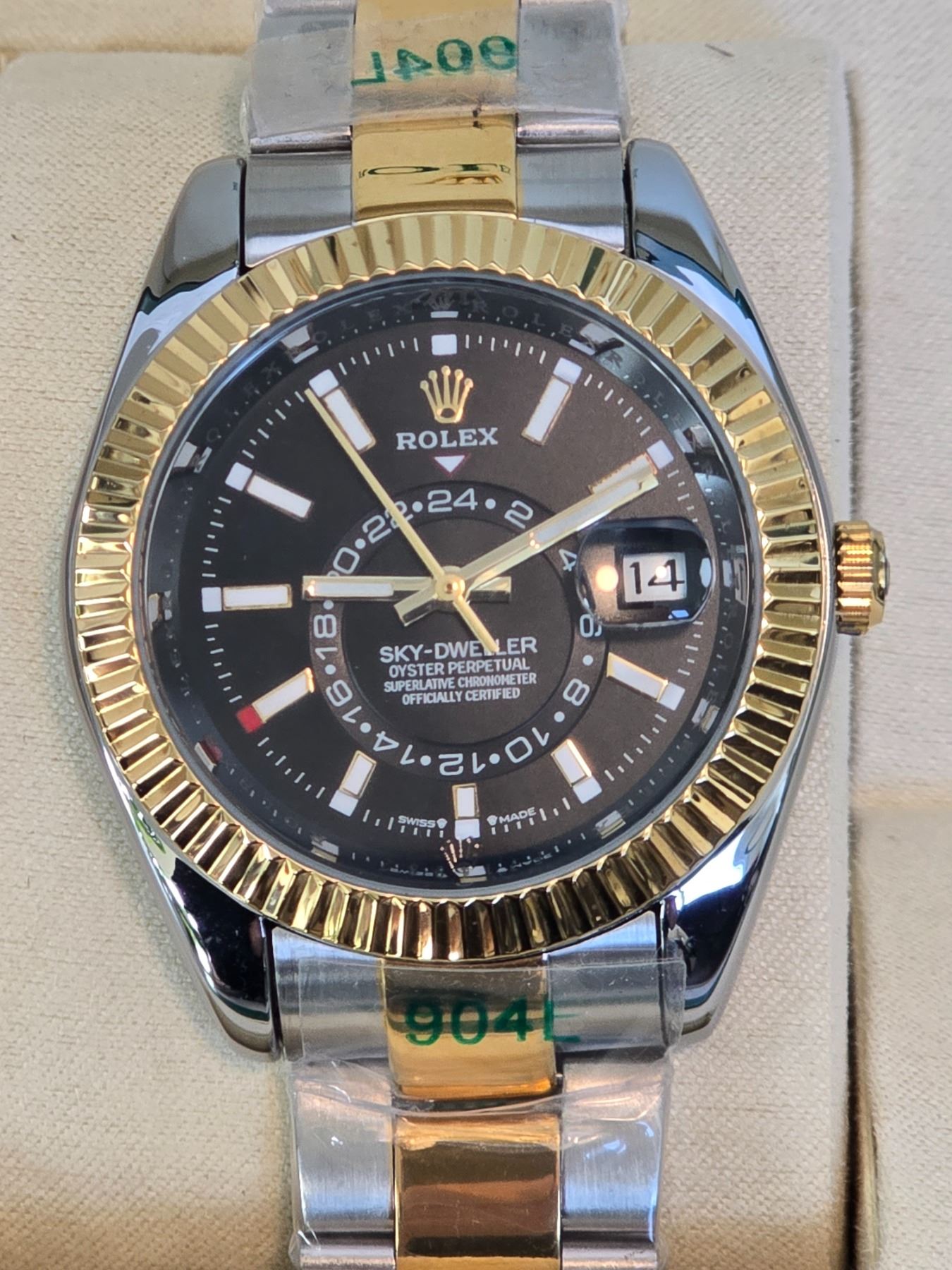 ROLEX SKY-DWELLER 42 MM REF# 326933 FULLY AUTOMATIC - AAA QUALITY REPLICA WATCH, BLACK DIAL WITH WHITE INDEXES, 904L STAINLESS STEEL CASE (THE SAME STEEL USED IN AUTHENTIC ROLEX WATCHES), GOLDEN FLUTED BEZEL AND CROWN, 2 TONE OYSTERSTEEL BRACELET, FULL SET WITH BOX, PAPERS & BAG