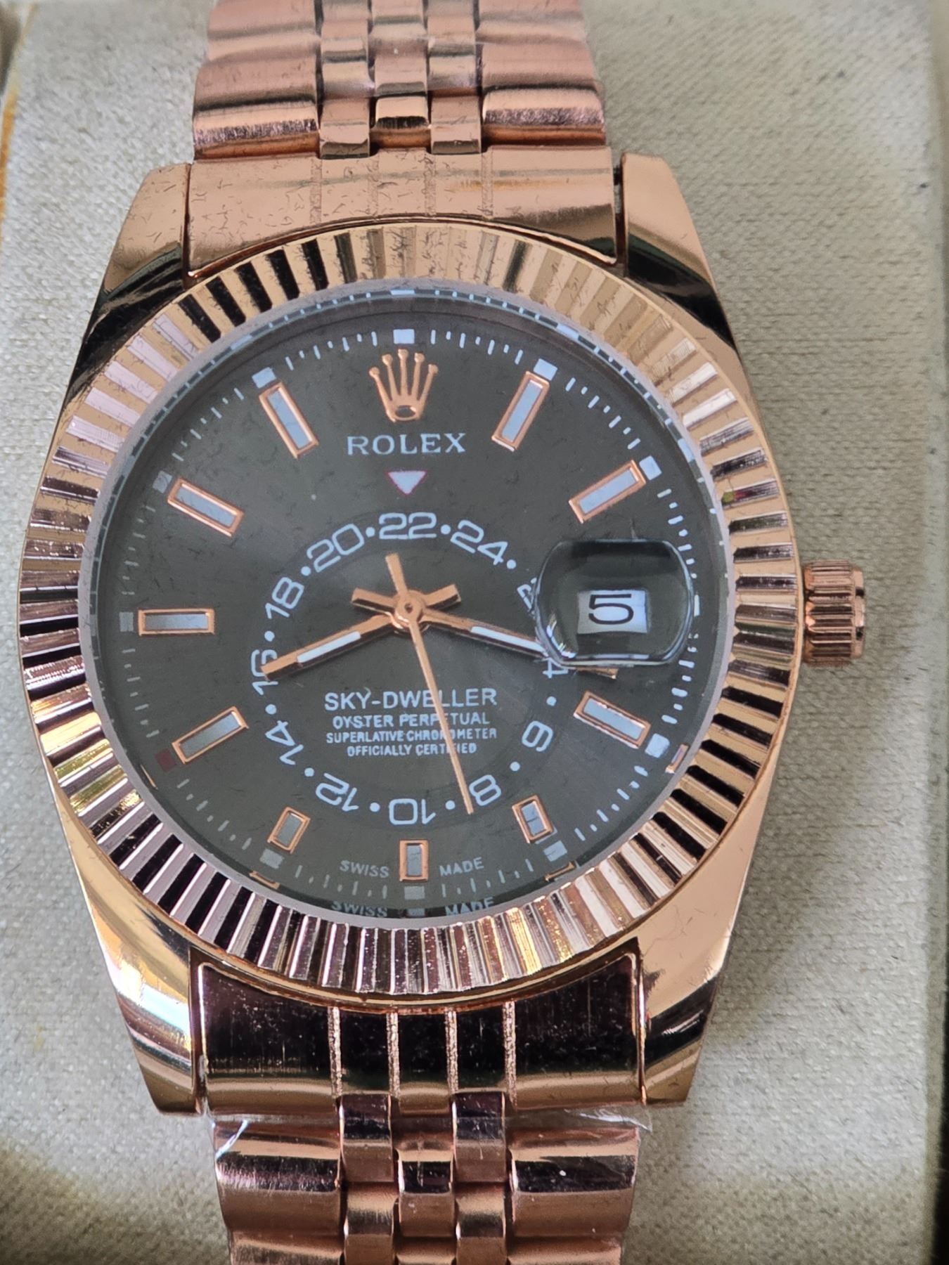 ROLEX SKY DWELLER REPLICA WATCH. ROSE GOLD CASE AND JUBILEE BRACELET. BLACK SLATE DIAL, WITH ROSE GOLD MARKERS AND ROSE GOLD BEZEL. SKY DWELLER HAS THE MOST SOPHISTICATED MOVEMENT IN THE ROLEX WORLD. FULL SET WITH CASE, PAPERS AND BAG
