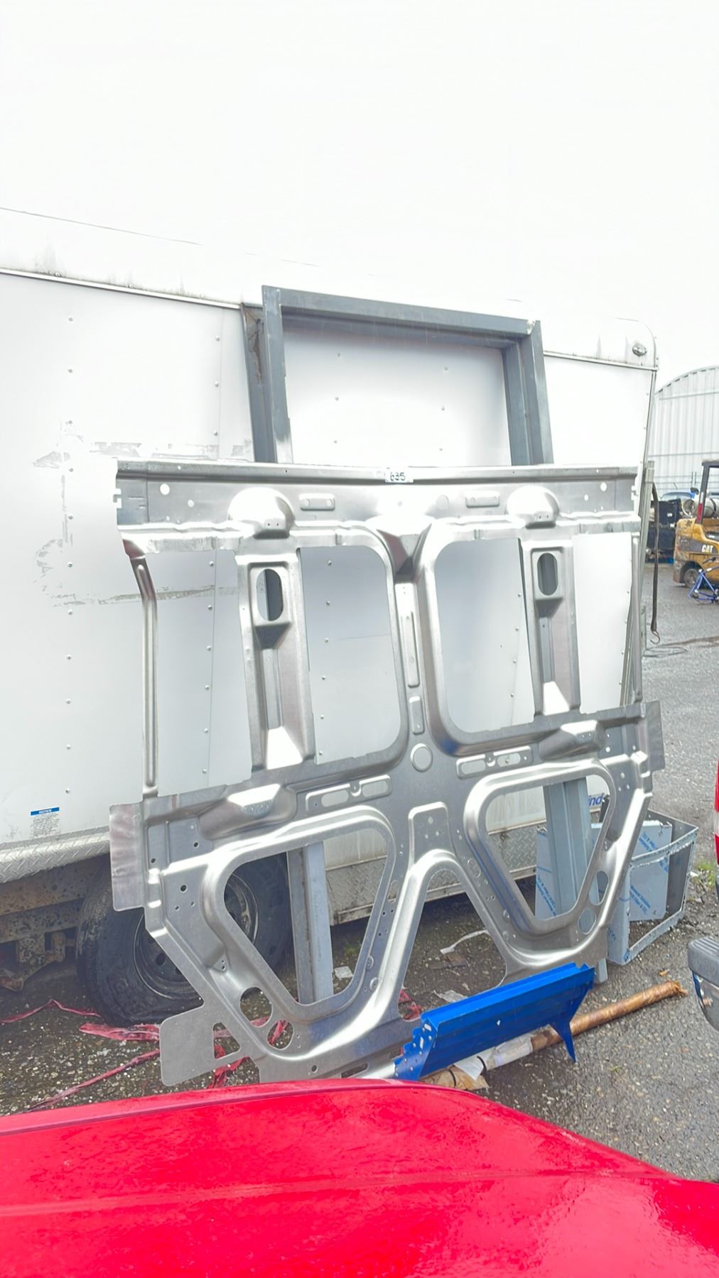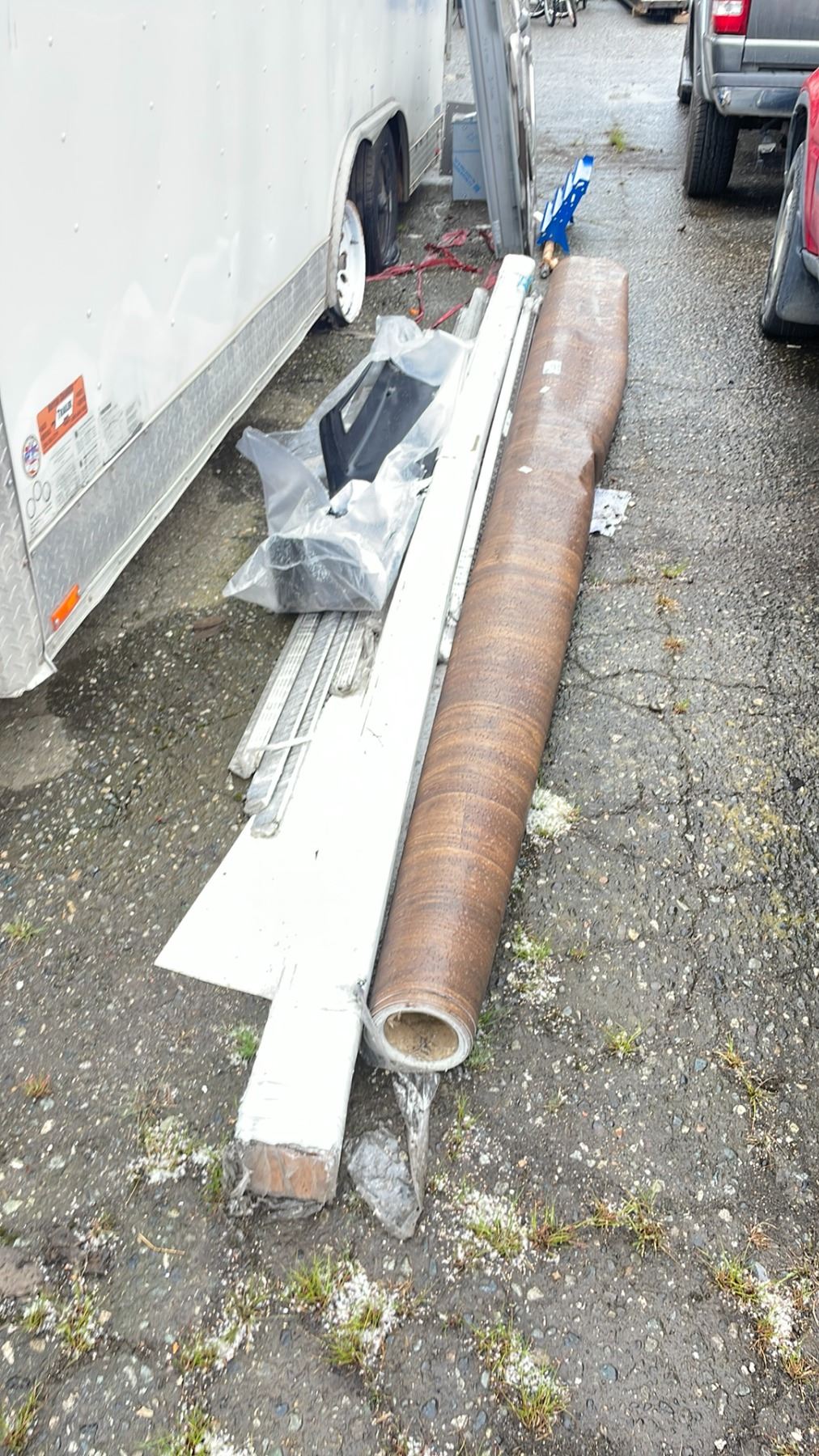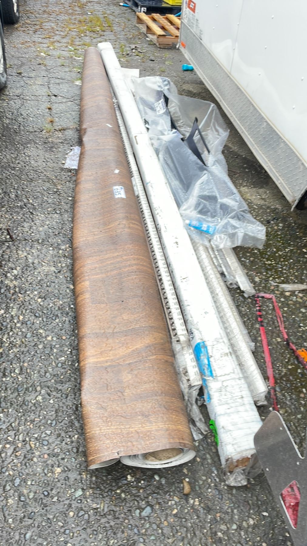 ROLL OF BROWN LINOLEUM, BRUSHED NICKEL ANODIZED ALUMINUM, BUNDLE OF LUMBER, BUMPER PART, UNDERCARRIAGE FRAME & MORE