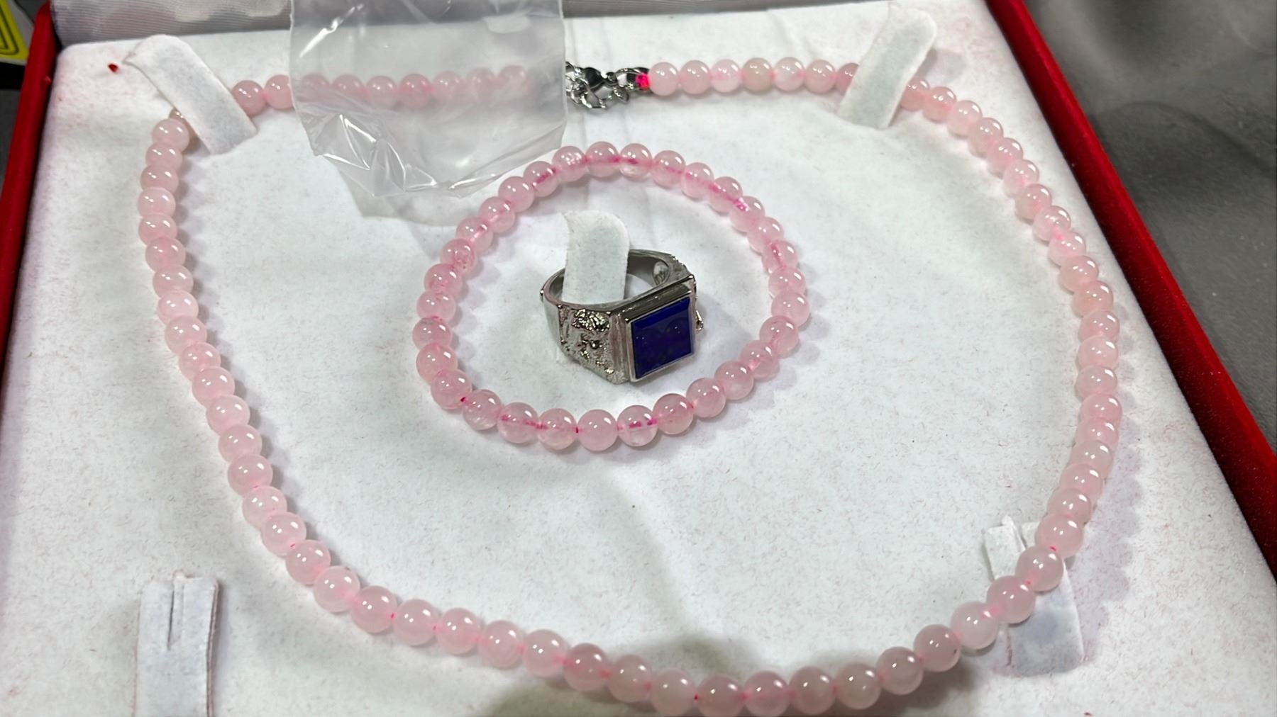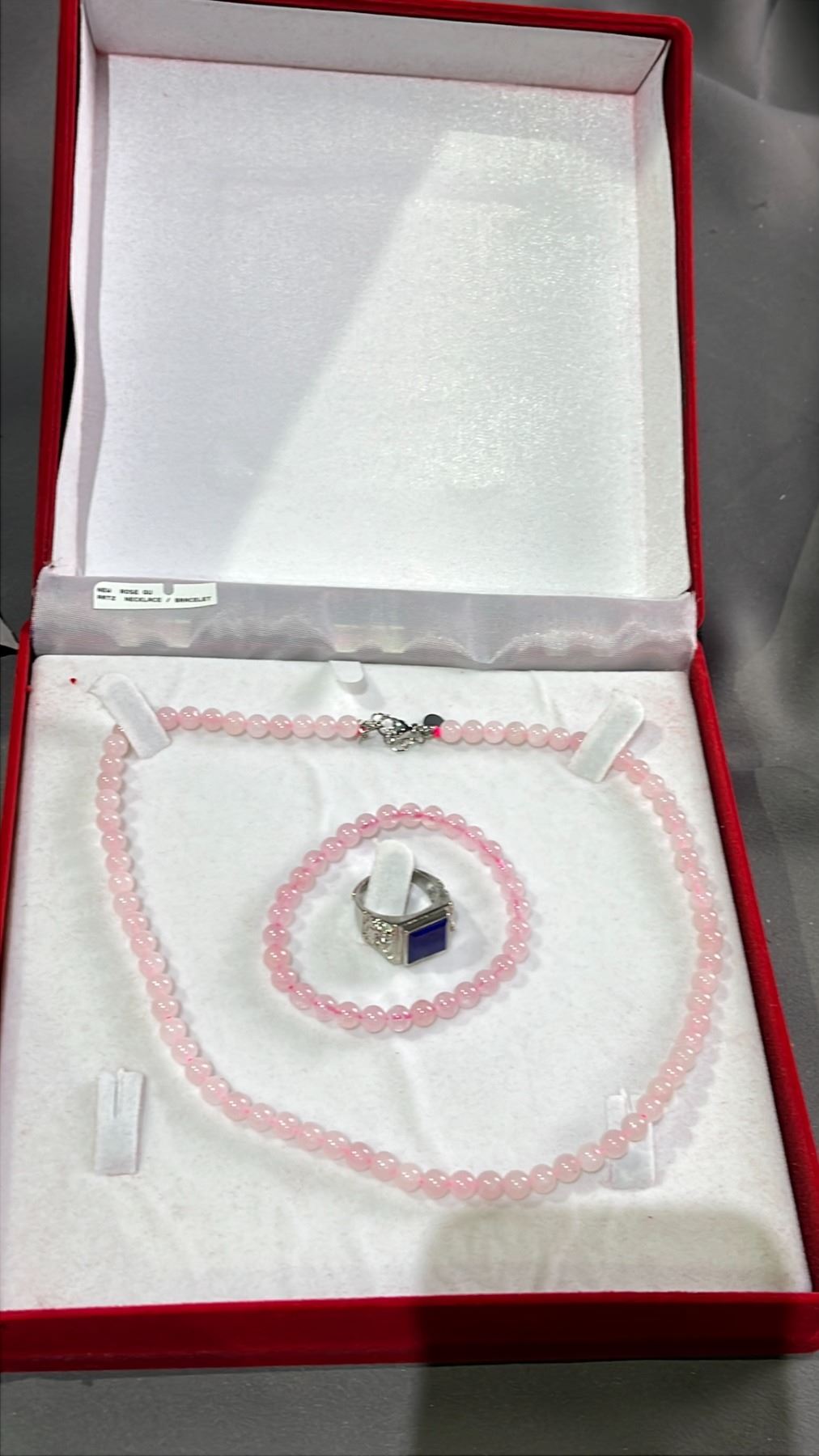 ROSE QUARTZ NECKLACE AND BRACELET, LAPIS ADJUSTABLE RING RETAIL $450