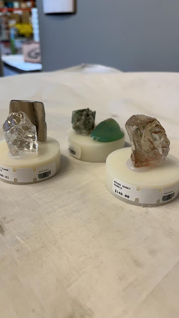 ROUGH CLEAR QUARTZ, SMOKEY QUARTZ AND EMERALD DISPLAYS