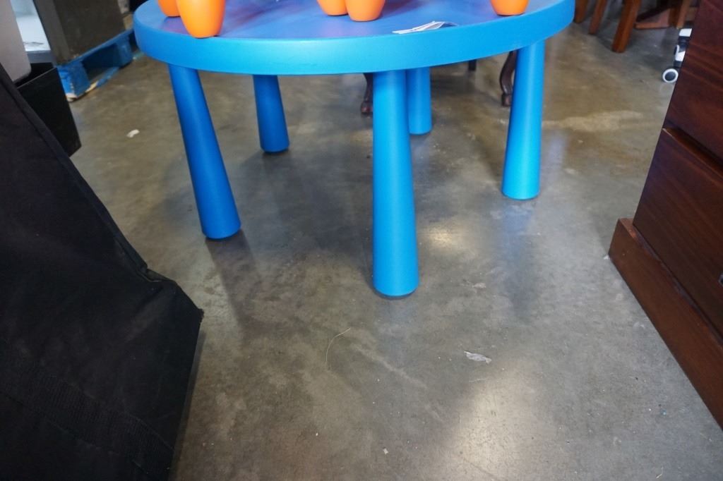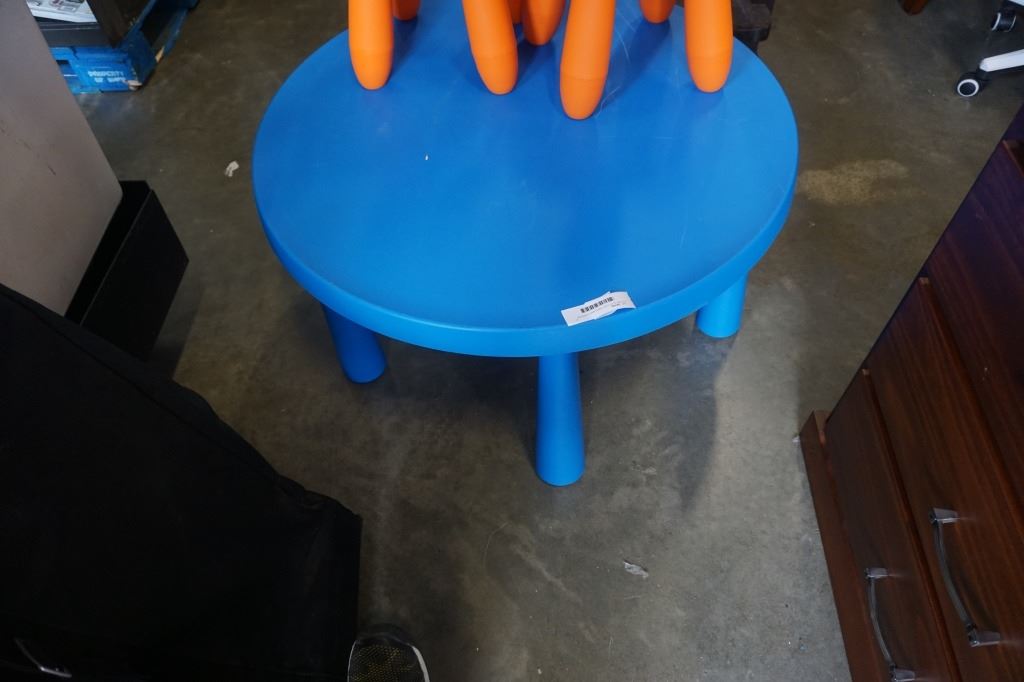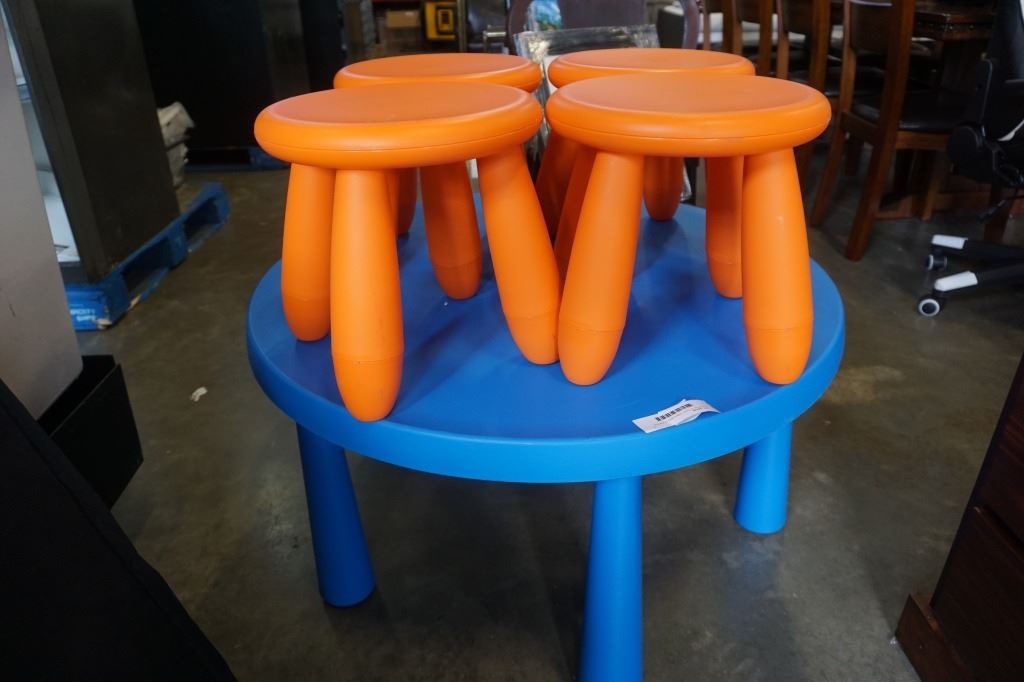 ROUND BLUE KIDS TABLE AND 4 ORANGE STOOLS