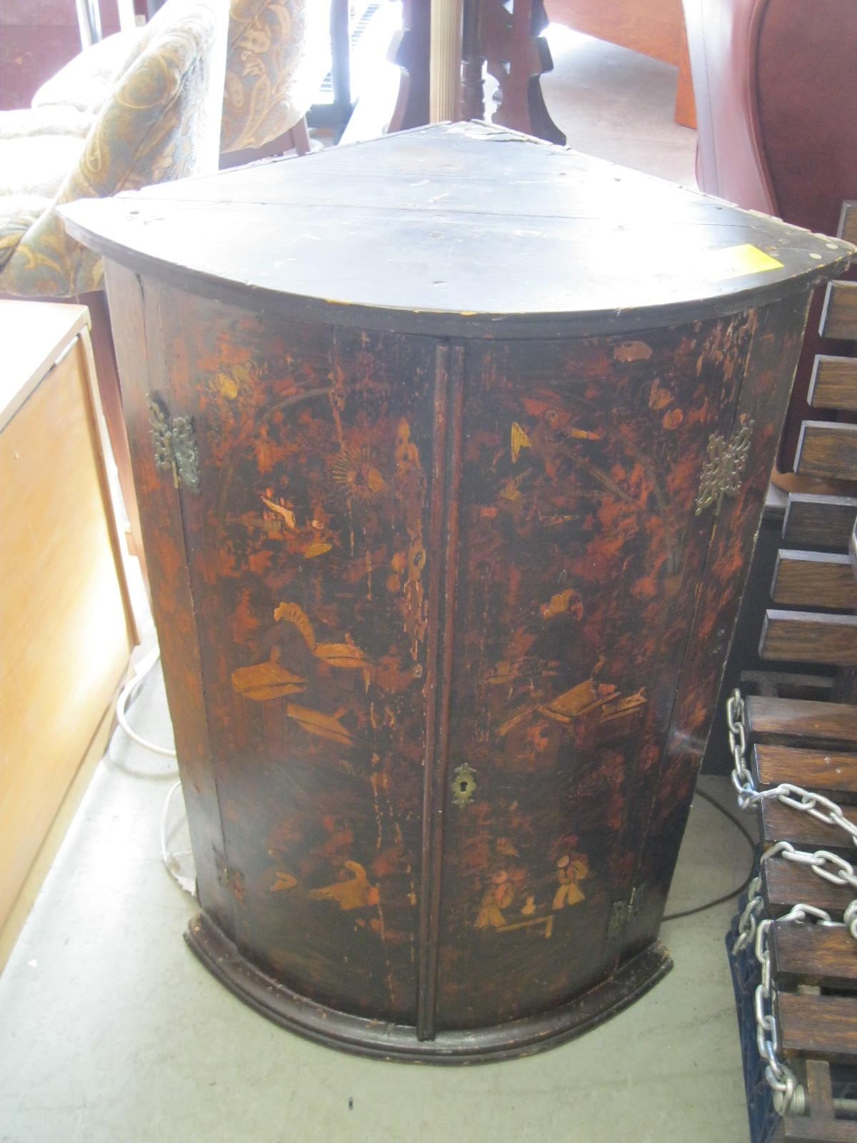 ROUND CURVED FRONT CORNER CABINET W/SHELVES, ASIAN DESIGN PAINTED FINISH