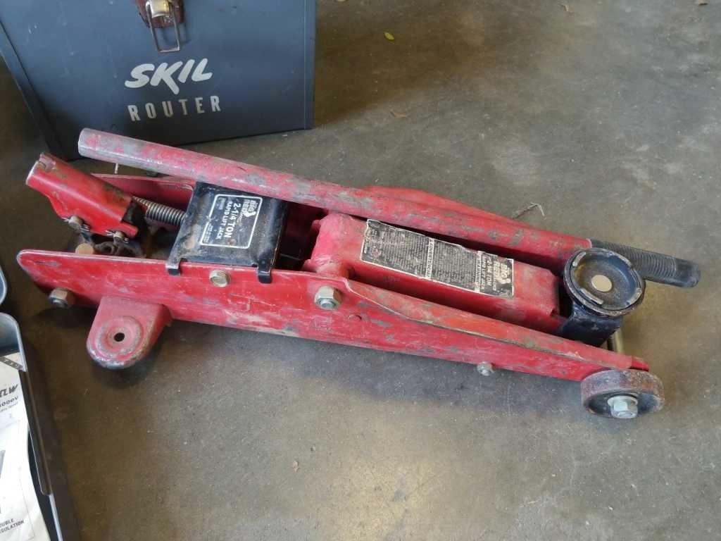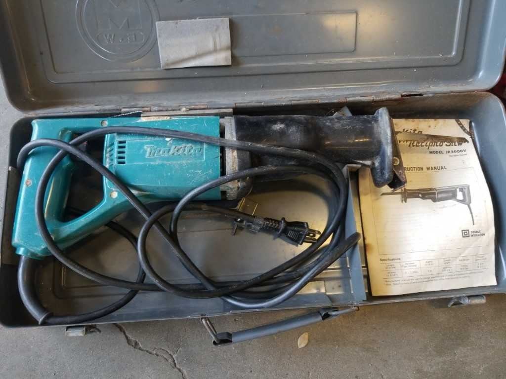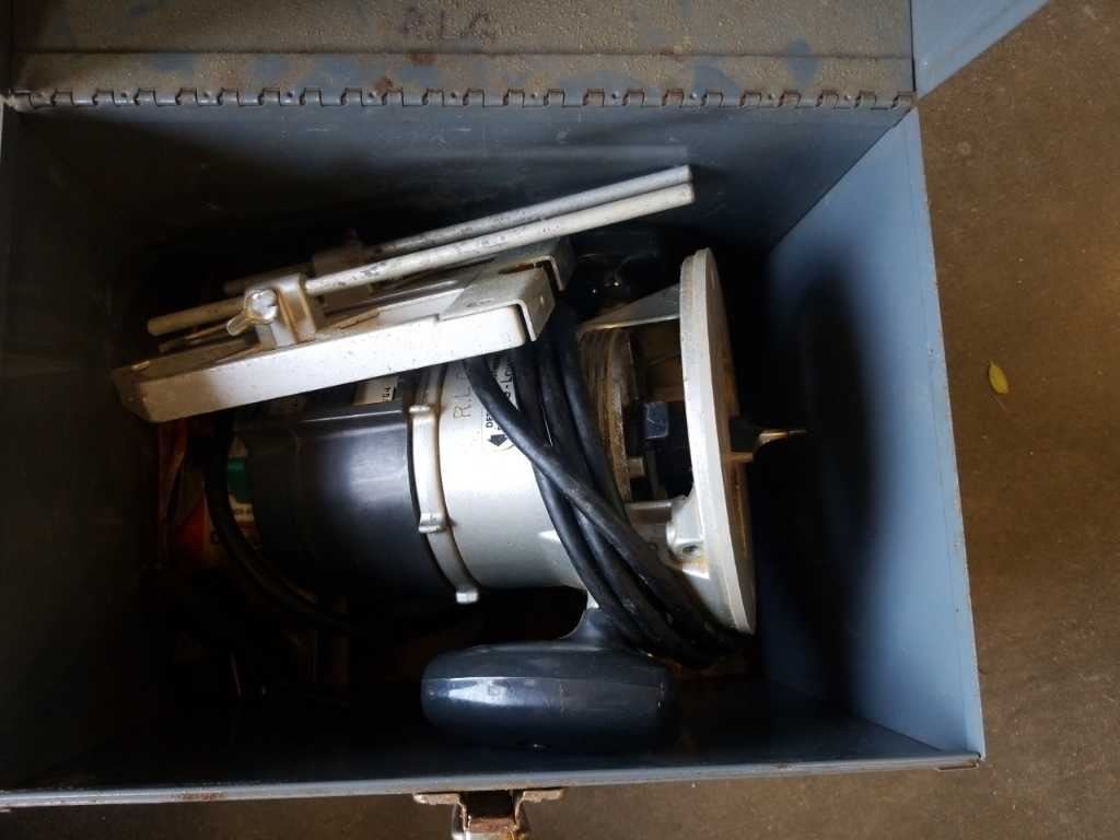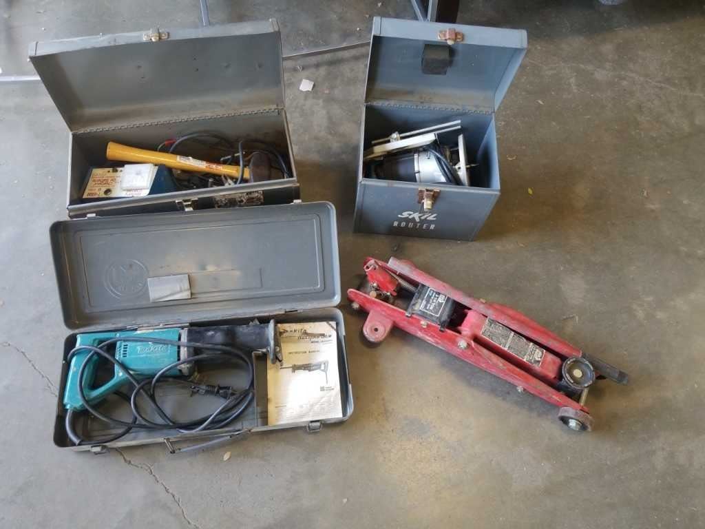 ROUTER, MAKITA SAWZALL, TOOLBOX WITH CONTENTS AND TROLLEY JACK