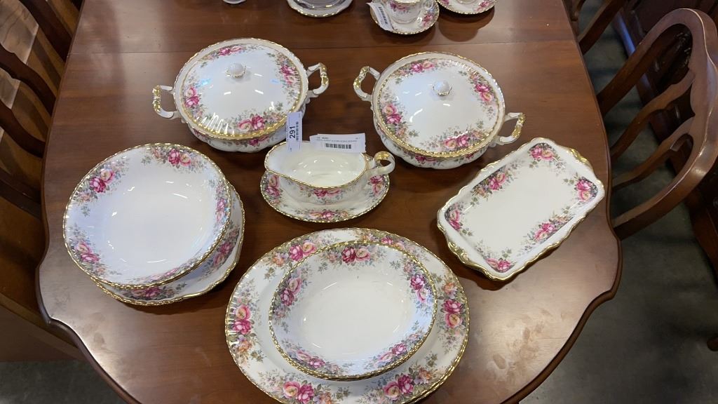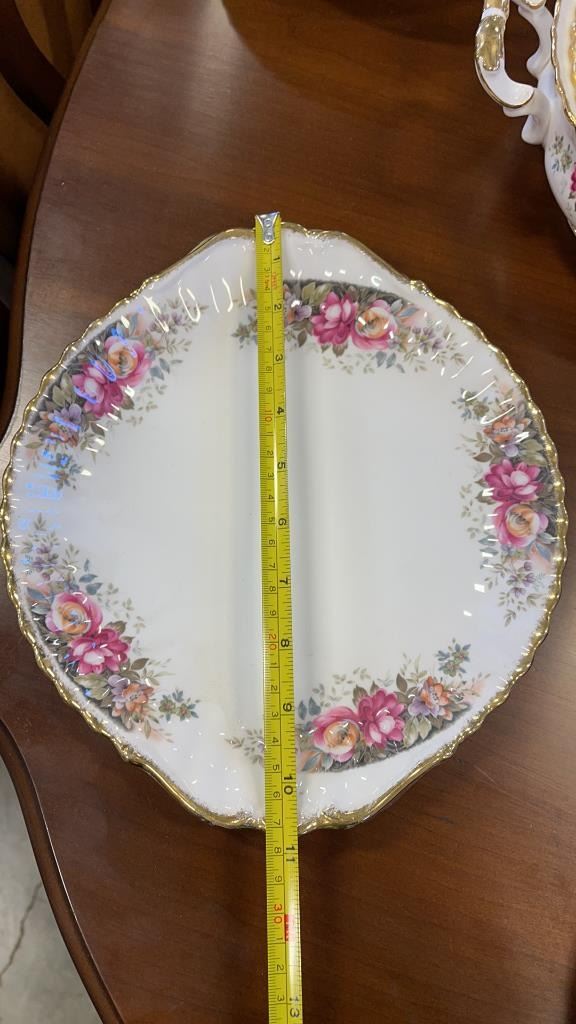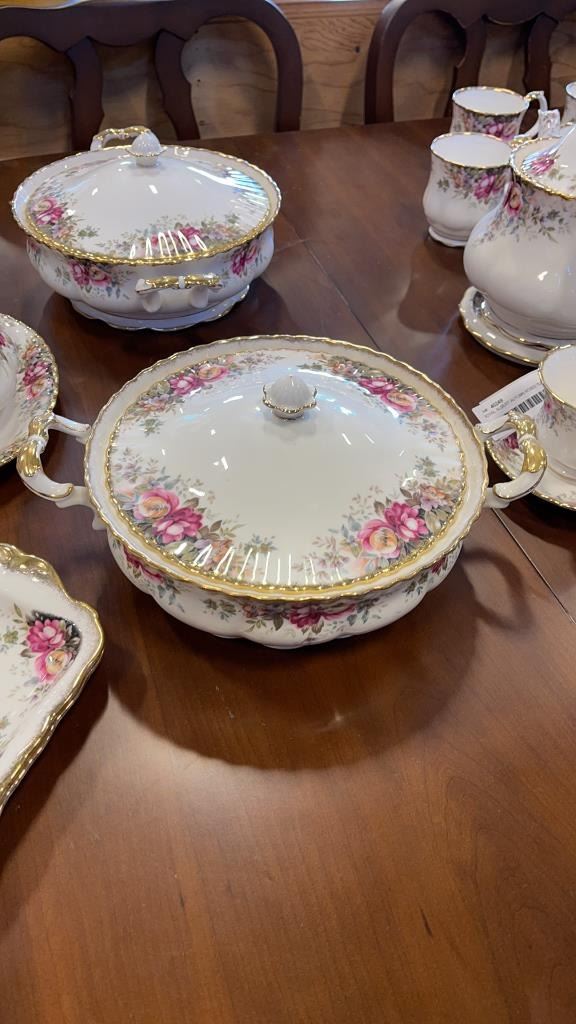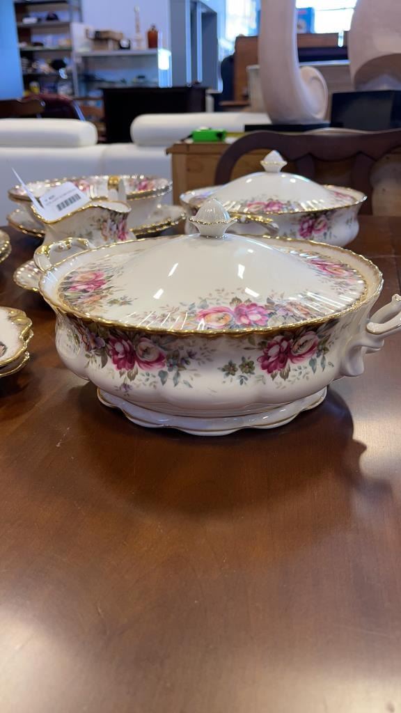 ROYAL ALBERT AUTUMN ROSES SERVING DISHES 18 PIECES - 4 OVAL BOWLS, 2 OVAL PLATES, 2 ROUND BOWLS, 2 CAKE PLATES, 2 RECTANGULAR PLATES, 2 LIDDED CASSEROLE DISHES, AND GRAVY BOAT W/ PLATE