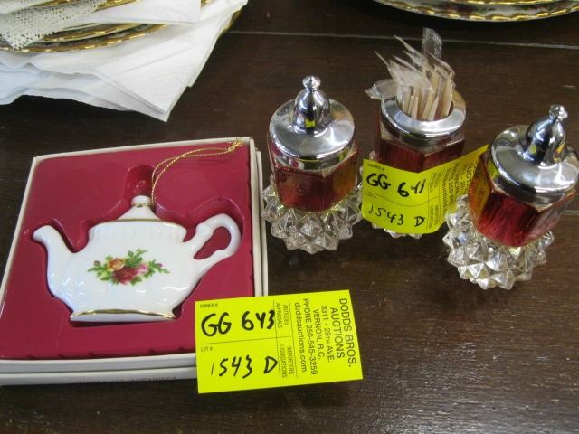 ROYAL ALBERT "OLD COUNTRY ROSE" TEAPOT HANGING ORNAMENT & SALT & PEPPER SHAKERS, MATCHING TOOTHPICK