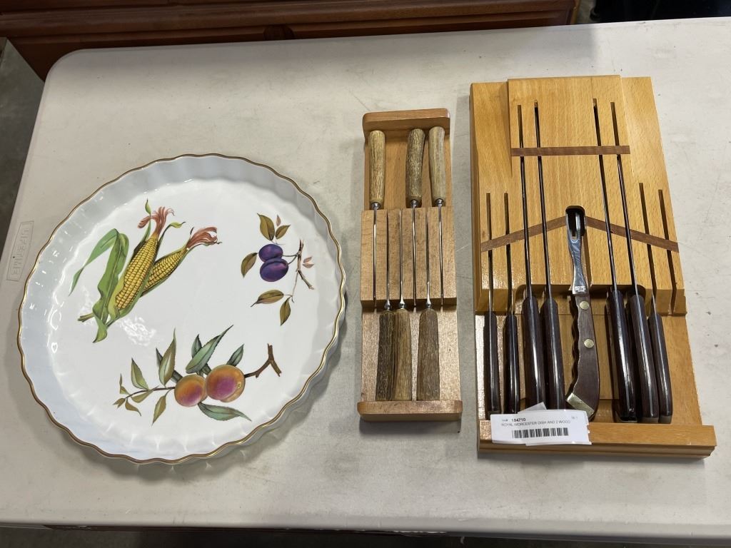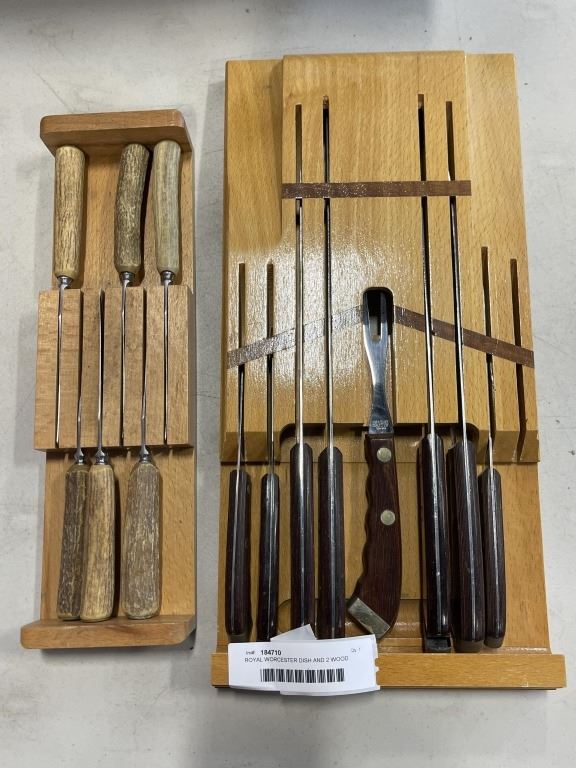 ROYAL WORCESTER DISH AND 2 WOOD HANDLE KNIFE SETS