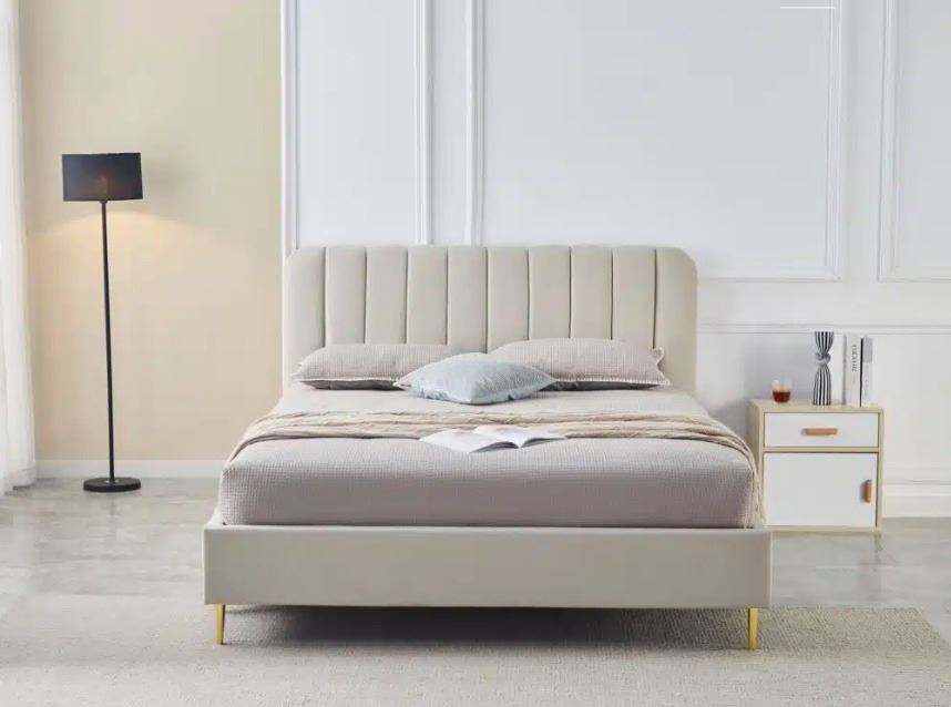 New Modern design platform bed frame in velvet or regular fabric with 47high headboard. Colours beige or grey. Selected variant: Queen - Biege. - Located in Store