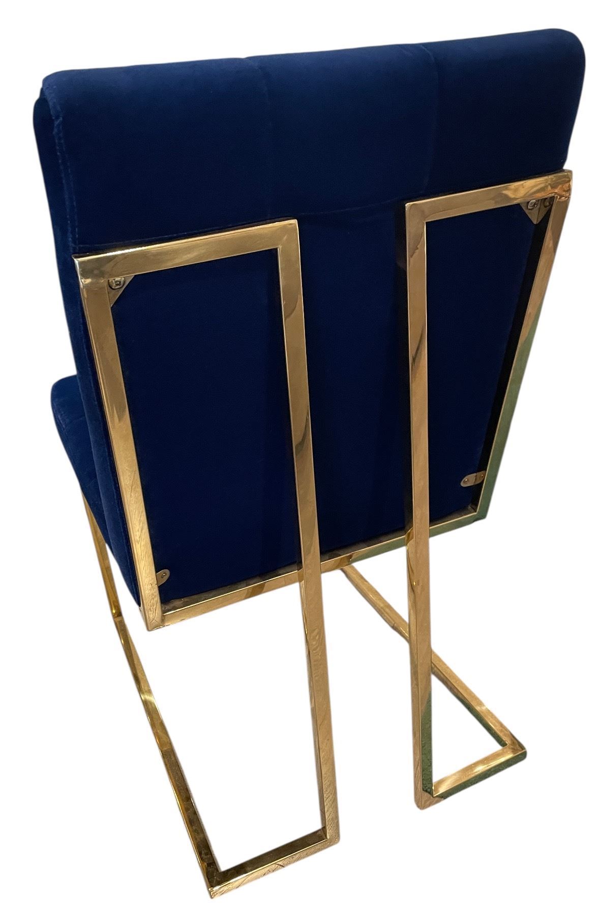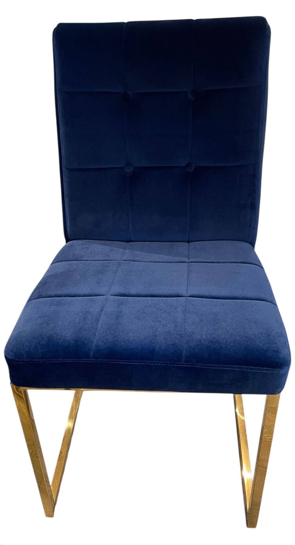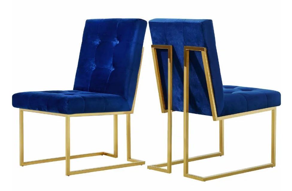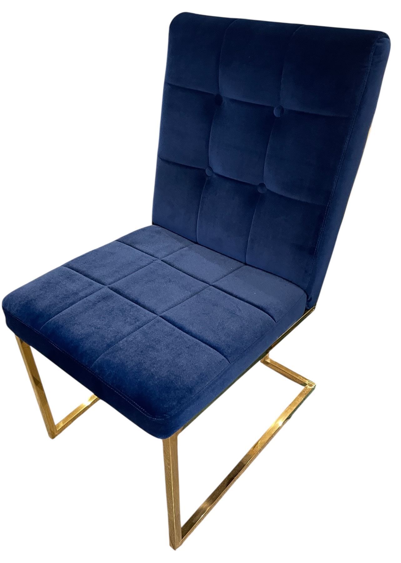 NEW Brand new in box. pair of golden dining chairs upholstered in plush velvet. Colour options light grey or blue. Selected variant: Group of 2 - Blue. - located in Store location
