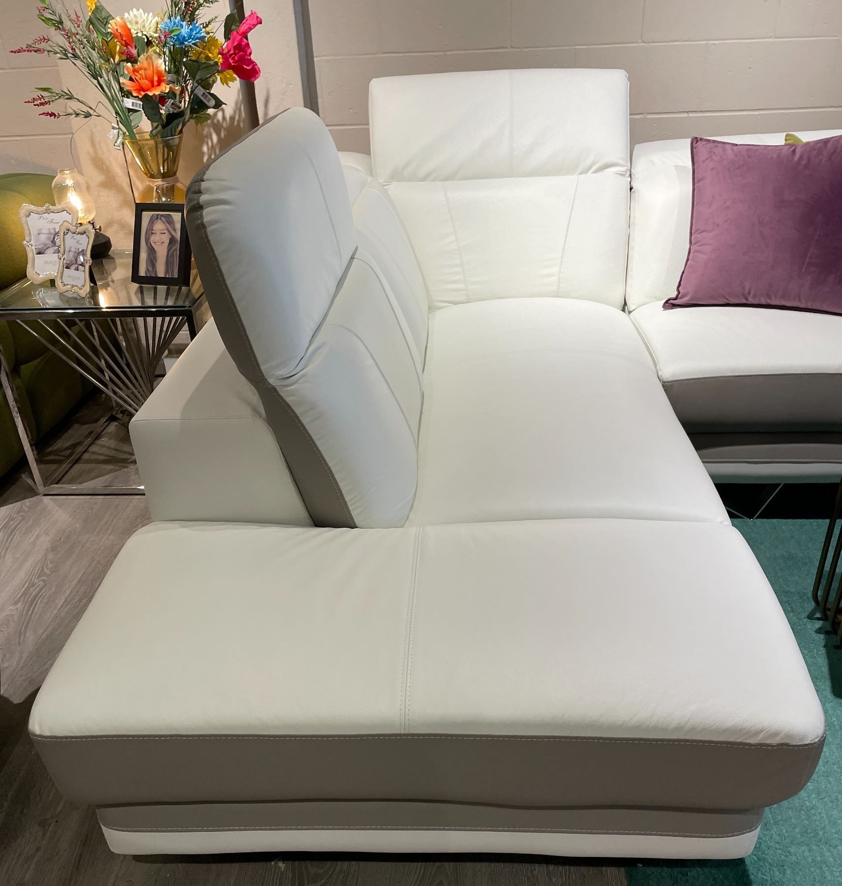 RS NEW George White/Grey - Left Hand Facing Leather Sectional Couch - Retails: $3999 - premium real leather L shape sectional couch with optional cup holder. Dimensions approx 116 L x 38 D x 40H; chaise length 85; colours white/grey or black; chaise direction right or left. Selected variant: White/Grey - Left Hand Facing. - Located in Store