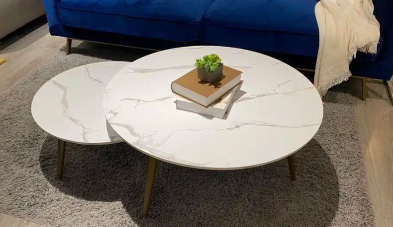 RS NEW Justin Plastic - Coffee Table Set - Retails: $799 - two piece wood-colour round coffee table set: one large (32diameter x 16H) and one small (24diameter x 12H). Optionally offered in wood or marble finish. Selected variant: Plastic - Coffee Table. - Located in Store