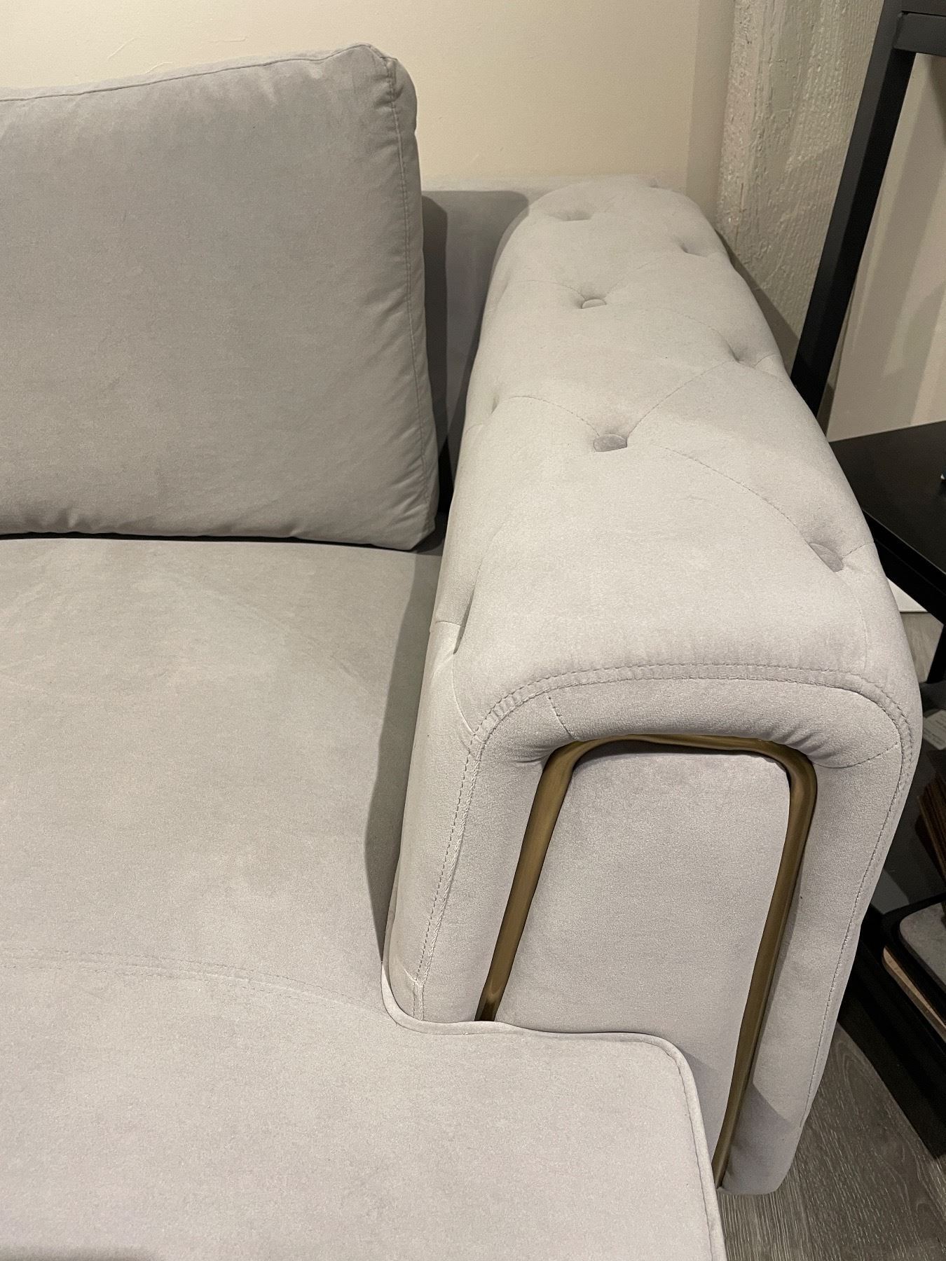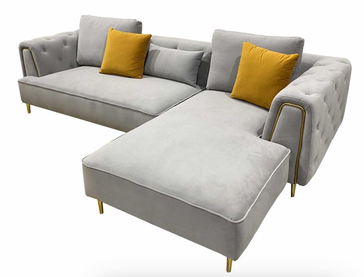 RS NEW Monica Right Hand Facing - Light Grey LShape Sectional Couch - Retails: $2499 - contemporary design quality fabric Lshape sectional couch with comfortable velvet upholstery. Size about 105L x 37D x 30H with chaise 68. Colours light grey or dark grey; chaise direction can be right or left. Selected variant: Right Hand Facing - Light Grey. - Located in store