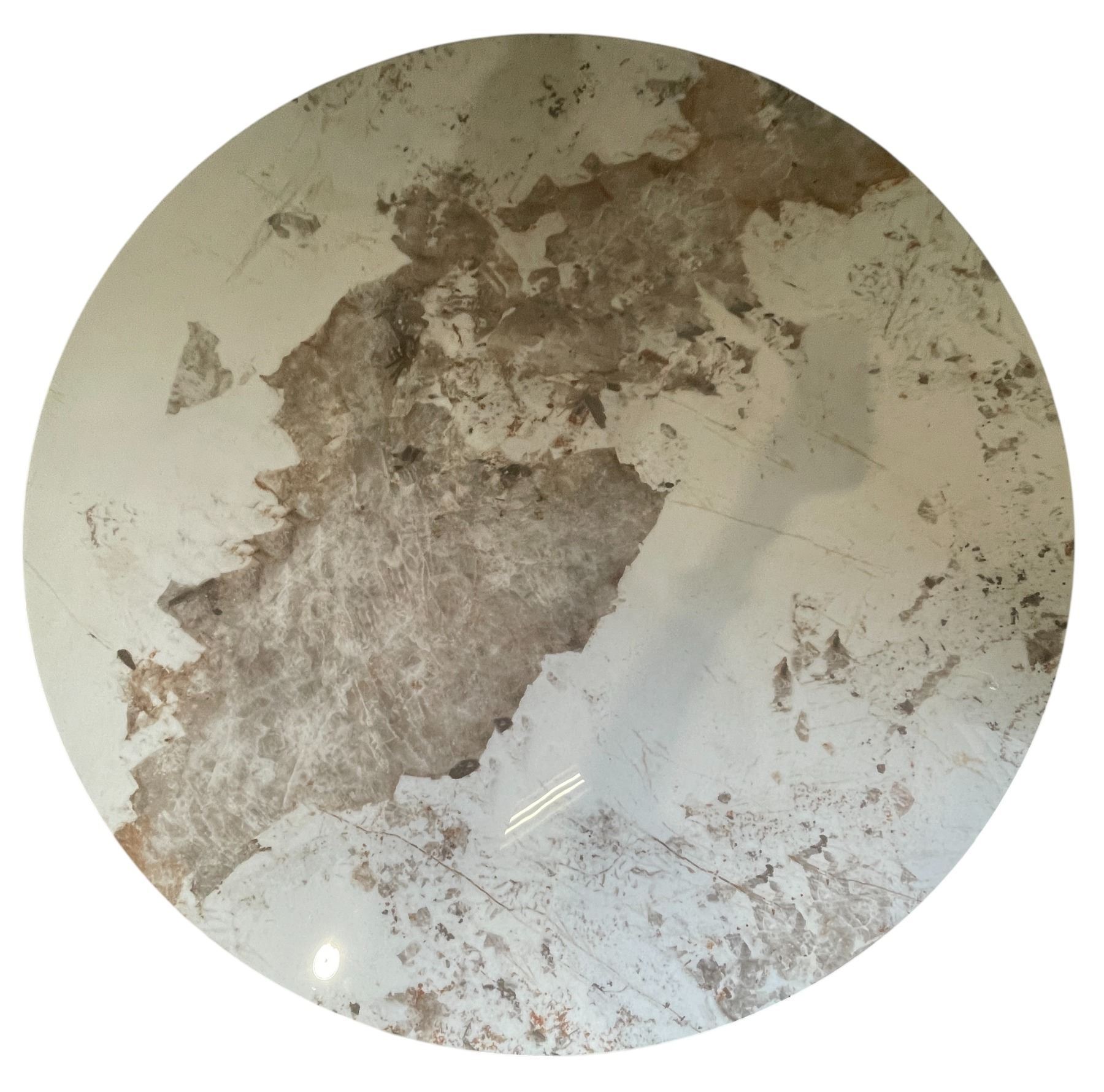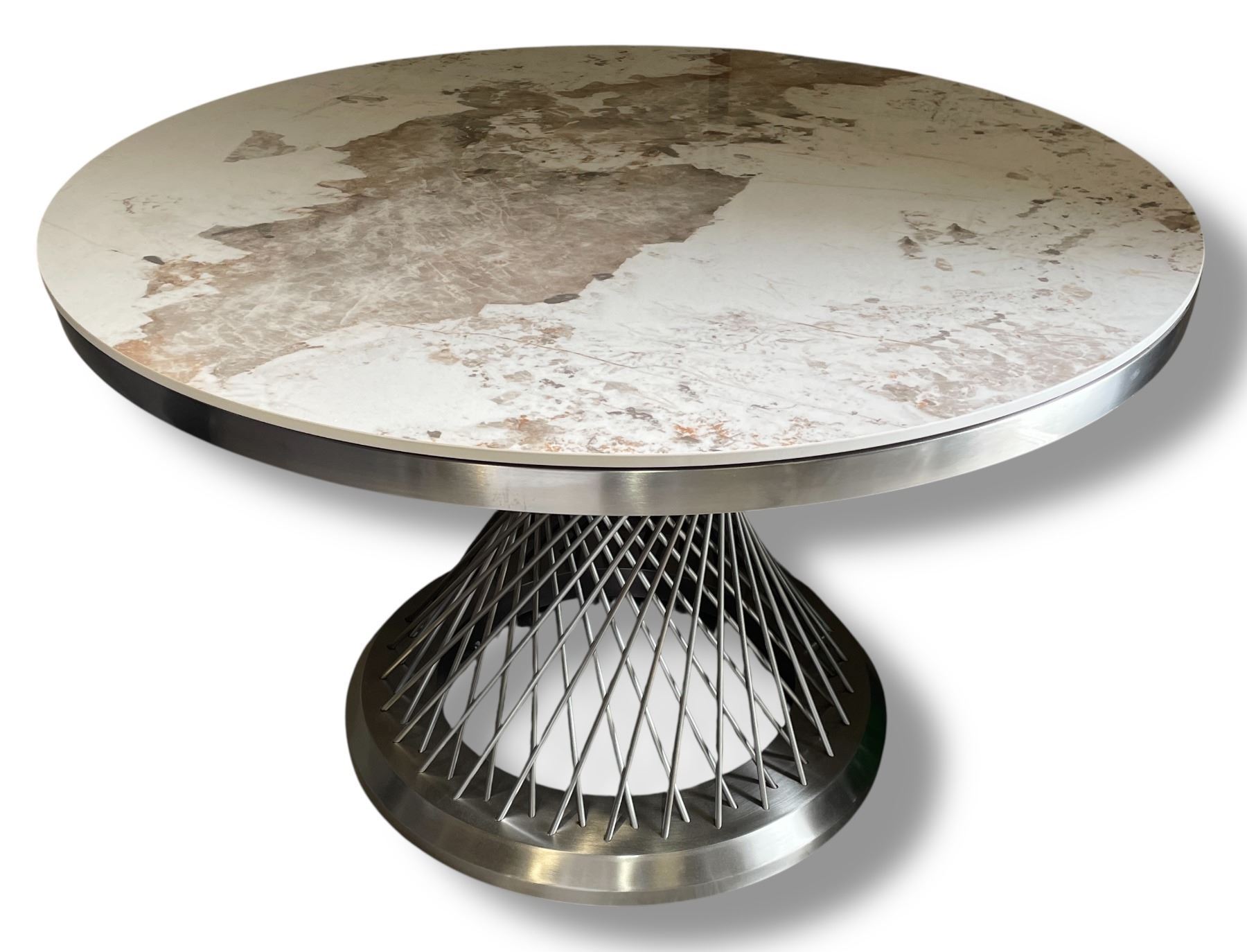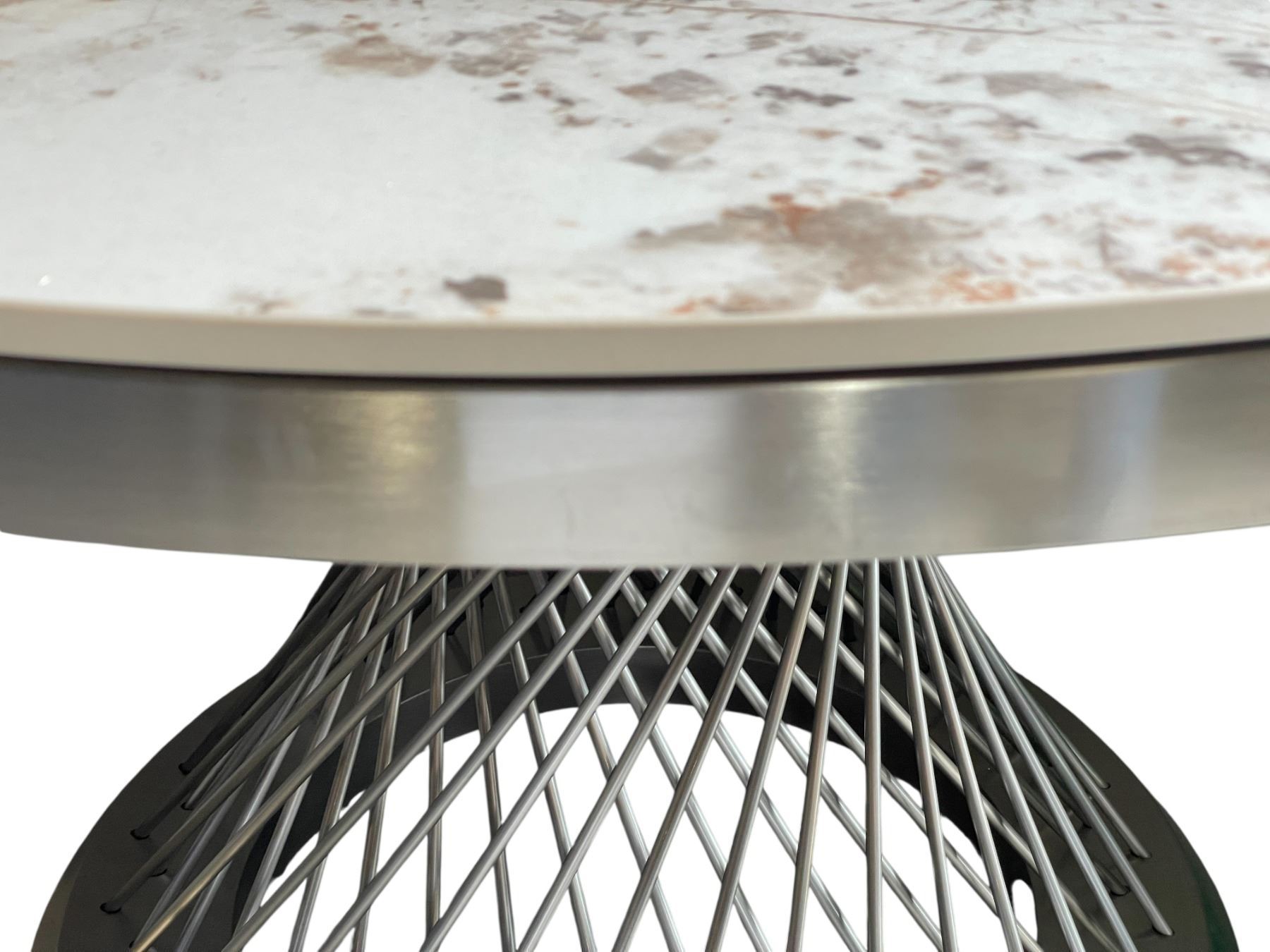 RS NEW Nicolas 47" Silver Marble Dining Table - Retails: $1699 - marble round dining table with elegant designed base. Standard size 47diameter; a larger 53option available; base colours golden or silver. Selected variant: 47" Silver. - located in Store location