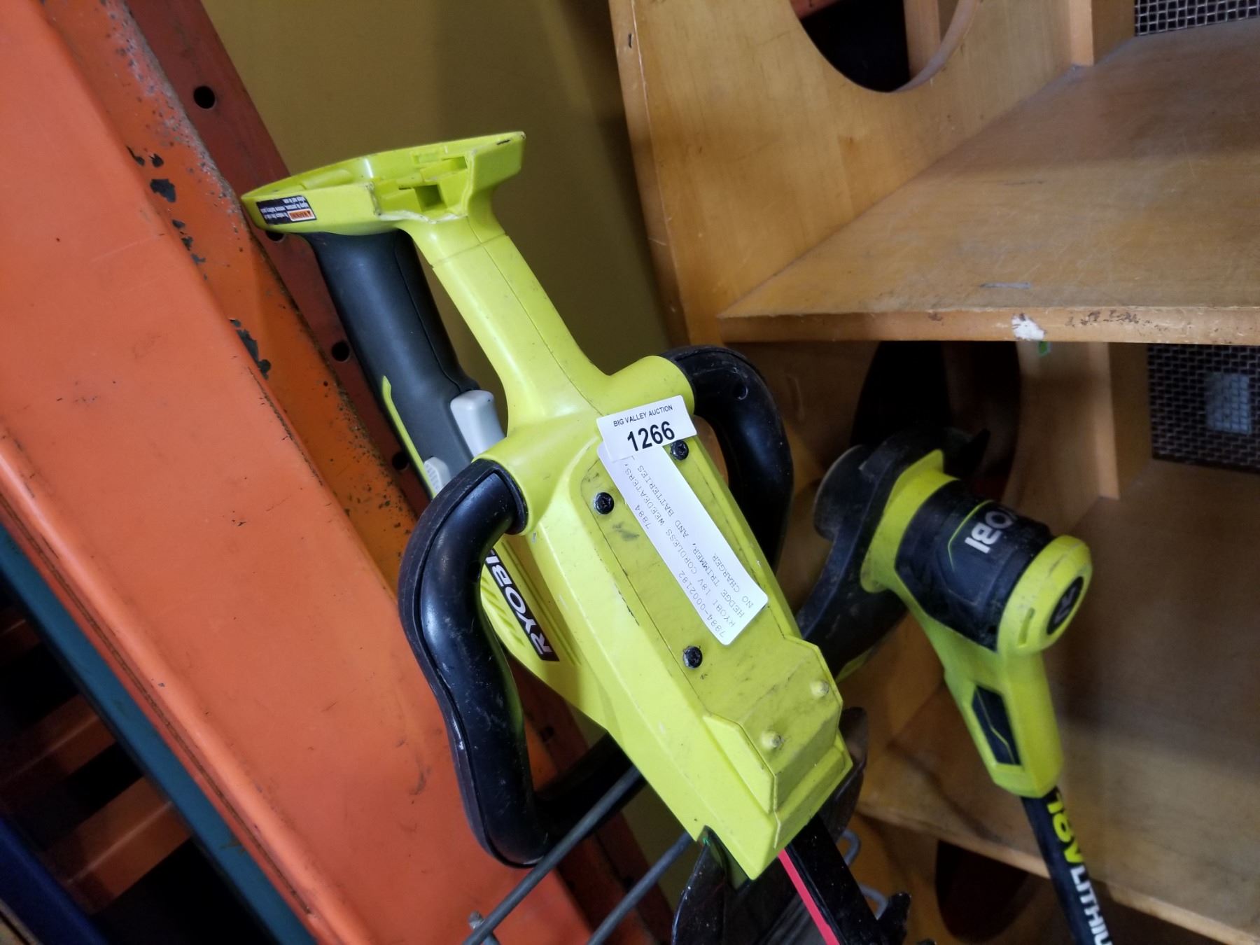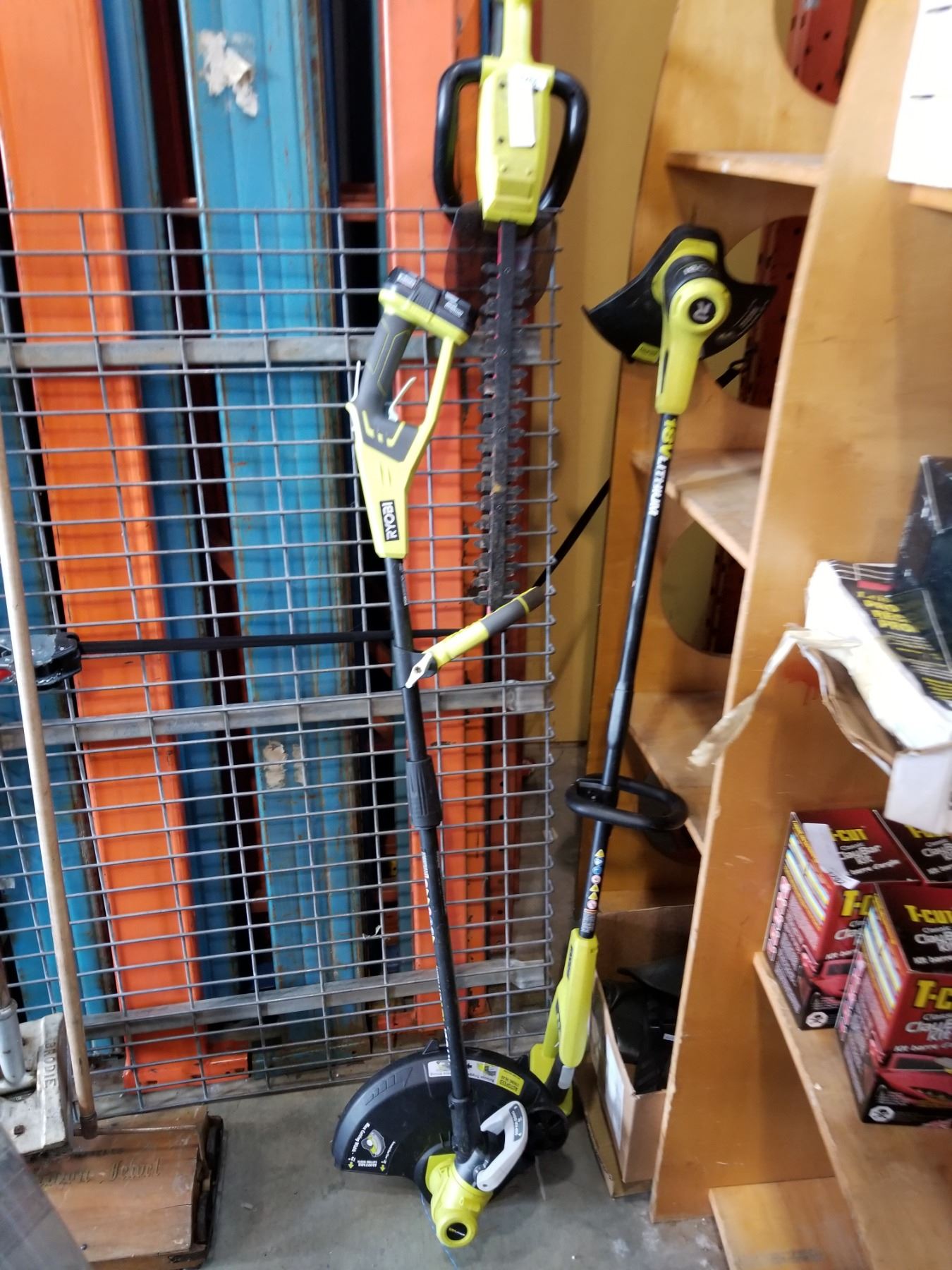 RYOBI 18V CORDLESS WEEDEATERS, HEDGE TRIMMER, AND BATTERIES - NO CHARGER