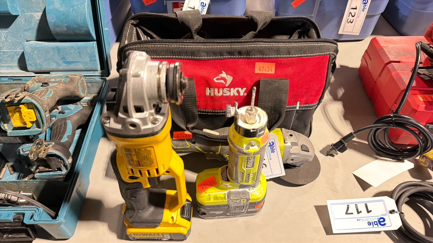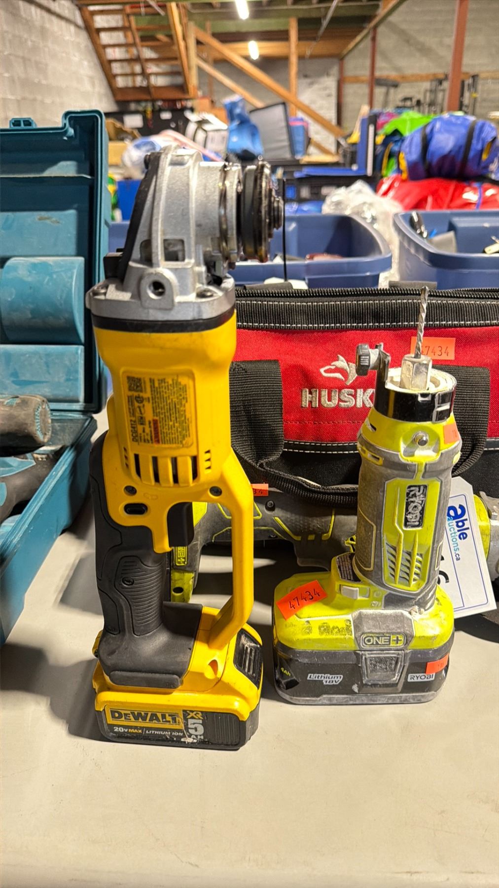 RYOBI ONE PLUS CORDLESS SCROLL TOOL WITH BATTERY, RYOBI ONE PLUS CORDLESS ANGLE GRINDER, DEWALT DCG412 CORDLESS ANGLE GRINDER WITH BATTERY, CRAFTSMAN V20 CORDLESS CUTTER WITH BATTERY, YELLOW CORDLESS ANGLE GRINDER *NO BATTERY*, & 2 DEWALT CORDLESS BATTERIES IN HUSKY CANVAS TOOL BAG