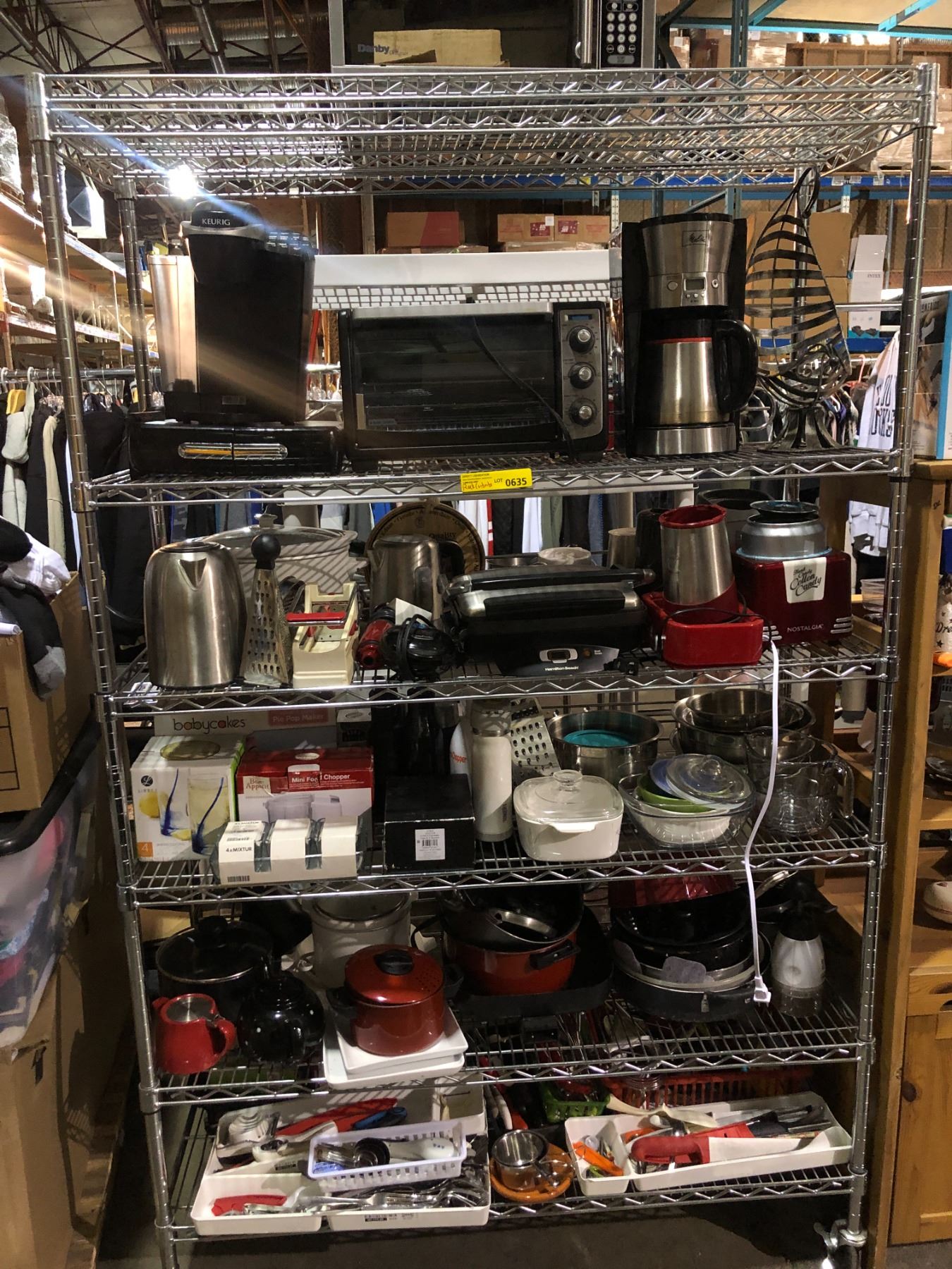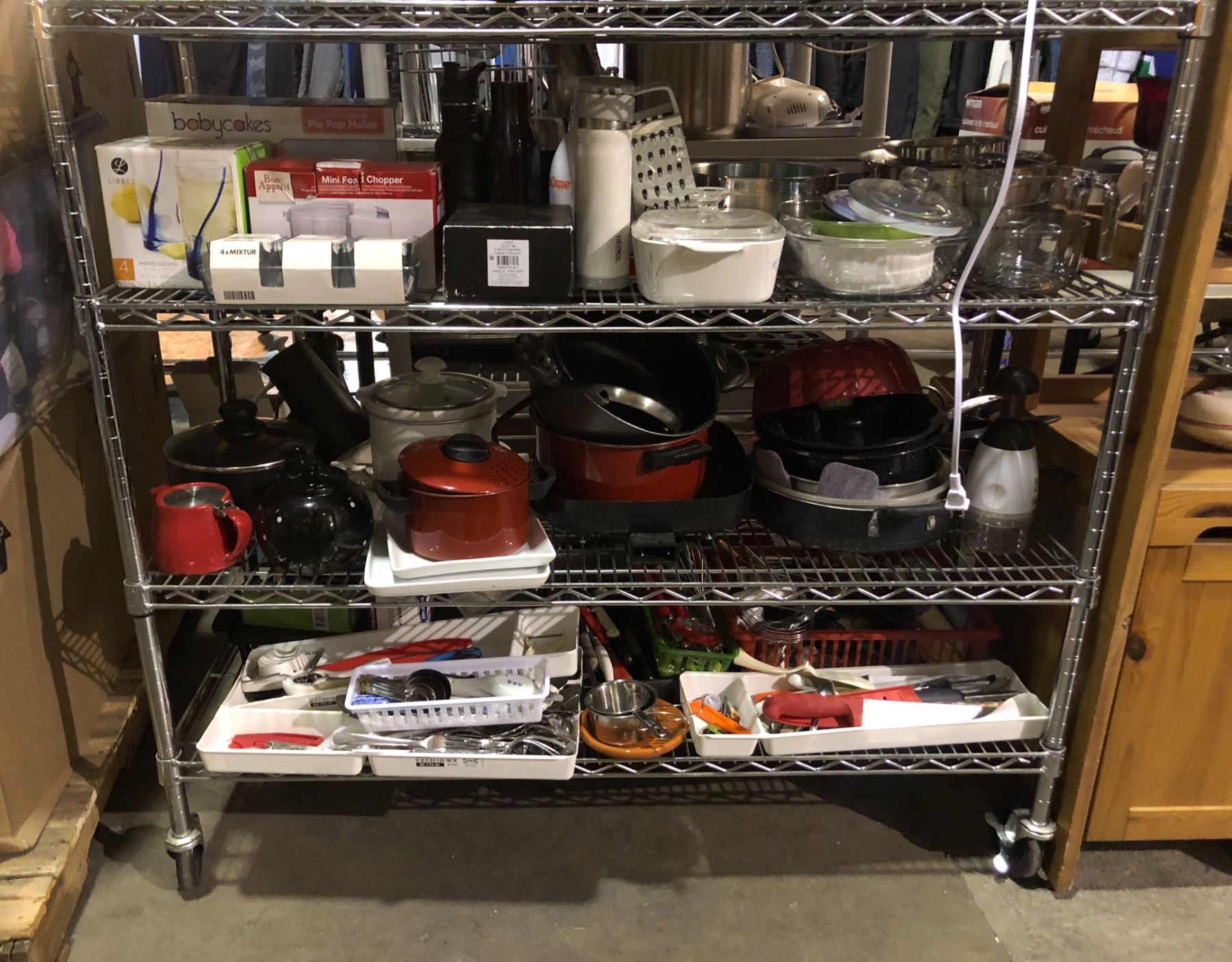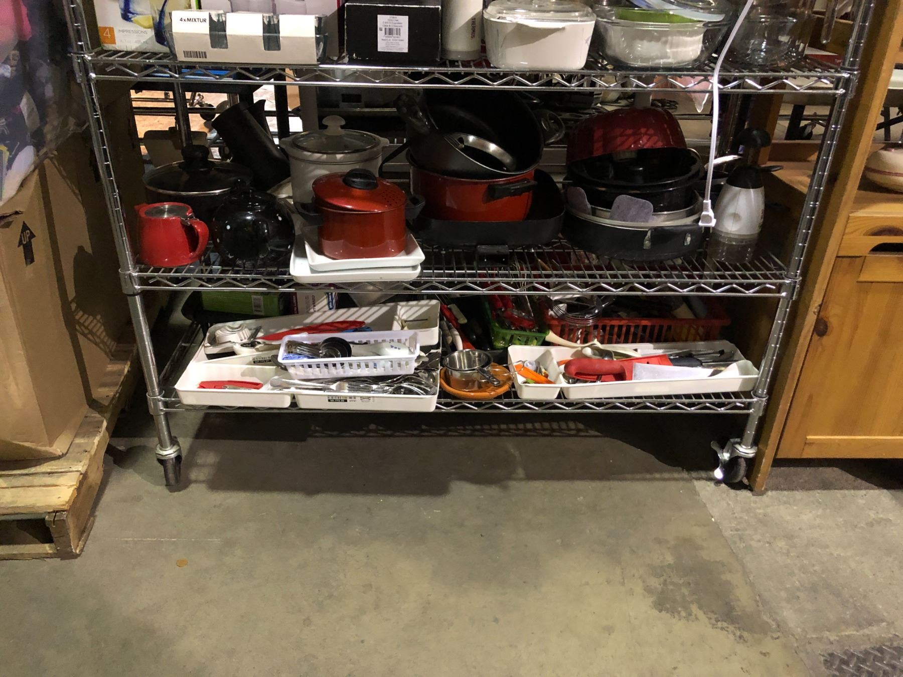 Rack contents full of kitchenware include - Keurig coffee machine, Melitta coffee machine, microwave oven, Peloton beach panini press, utensils, etc...(rack not included)