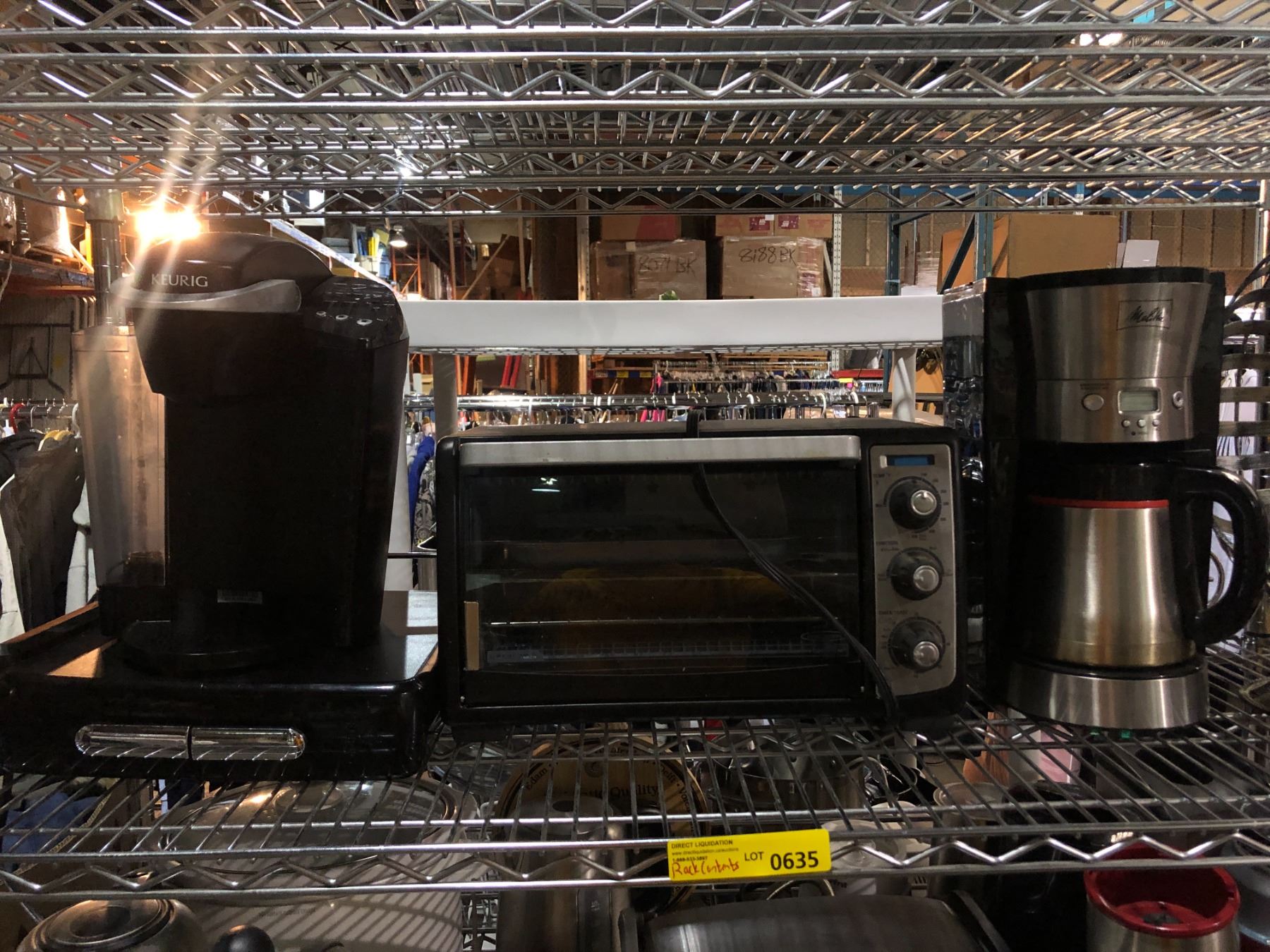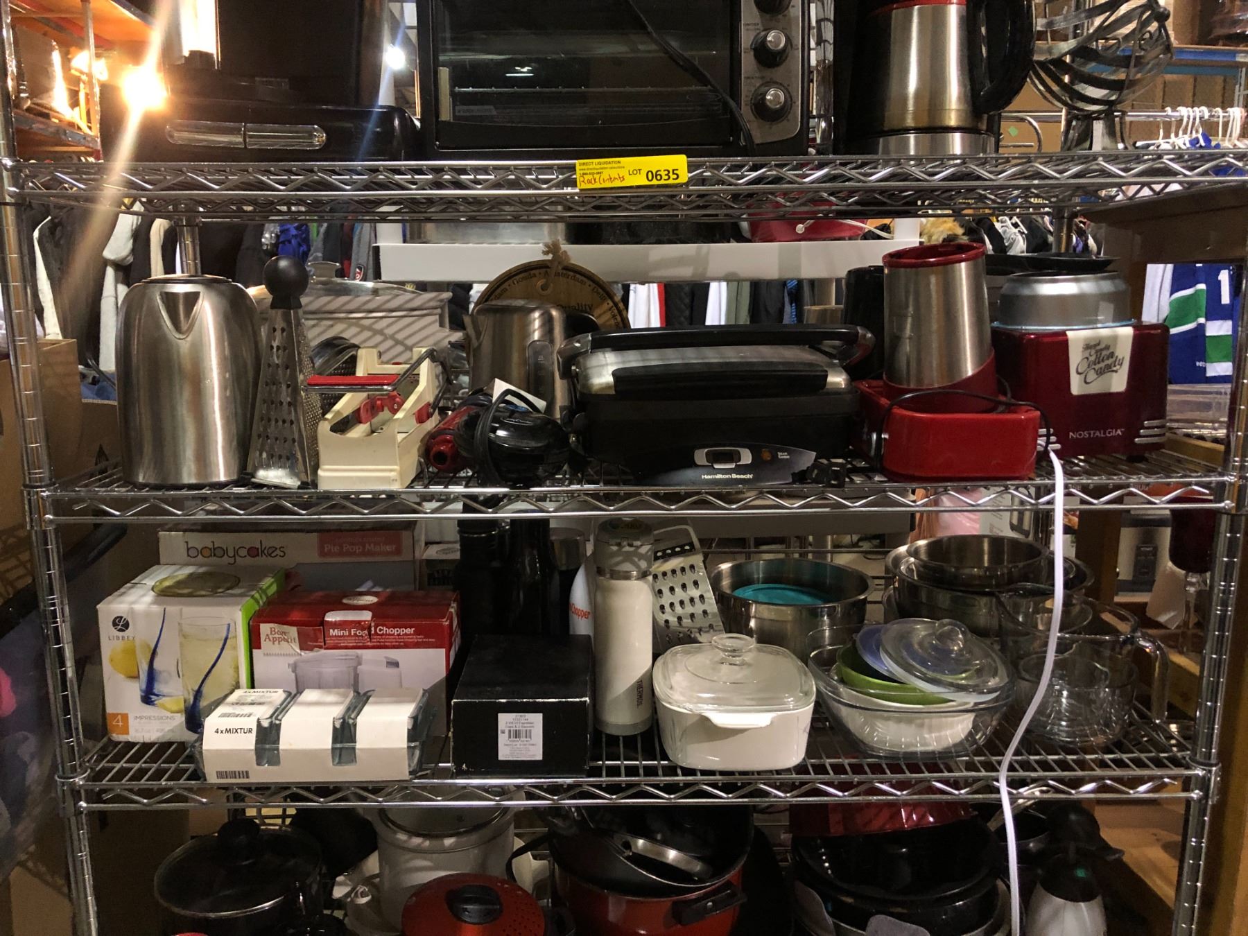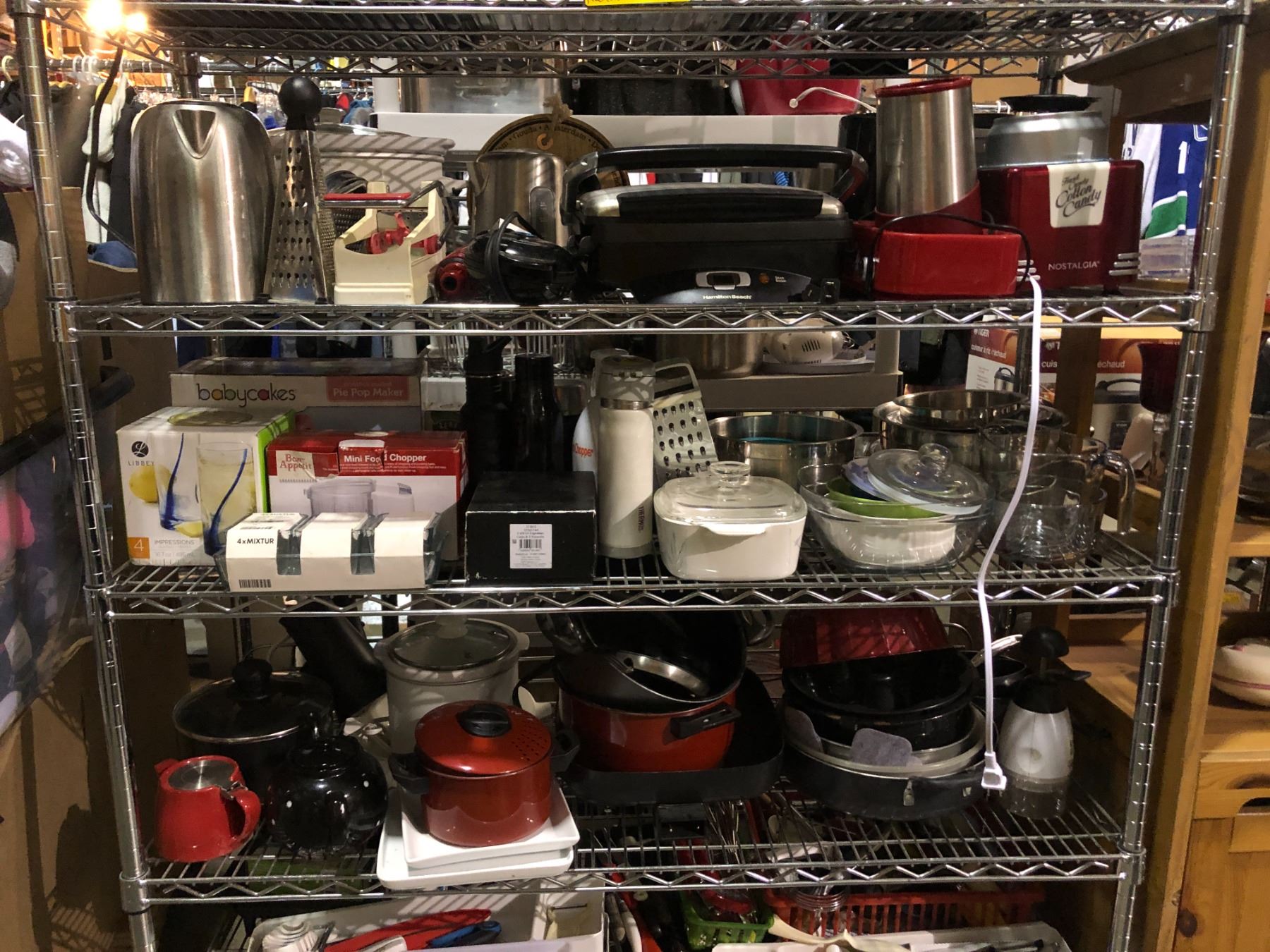 Rack contents full of kitchenware include - Keurig coffee machine, Melitta coffee machine, microwave oven, Peloton beach panini press, utensils, etc...(rack not included)