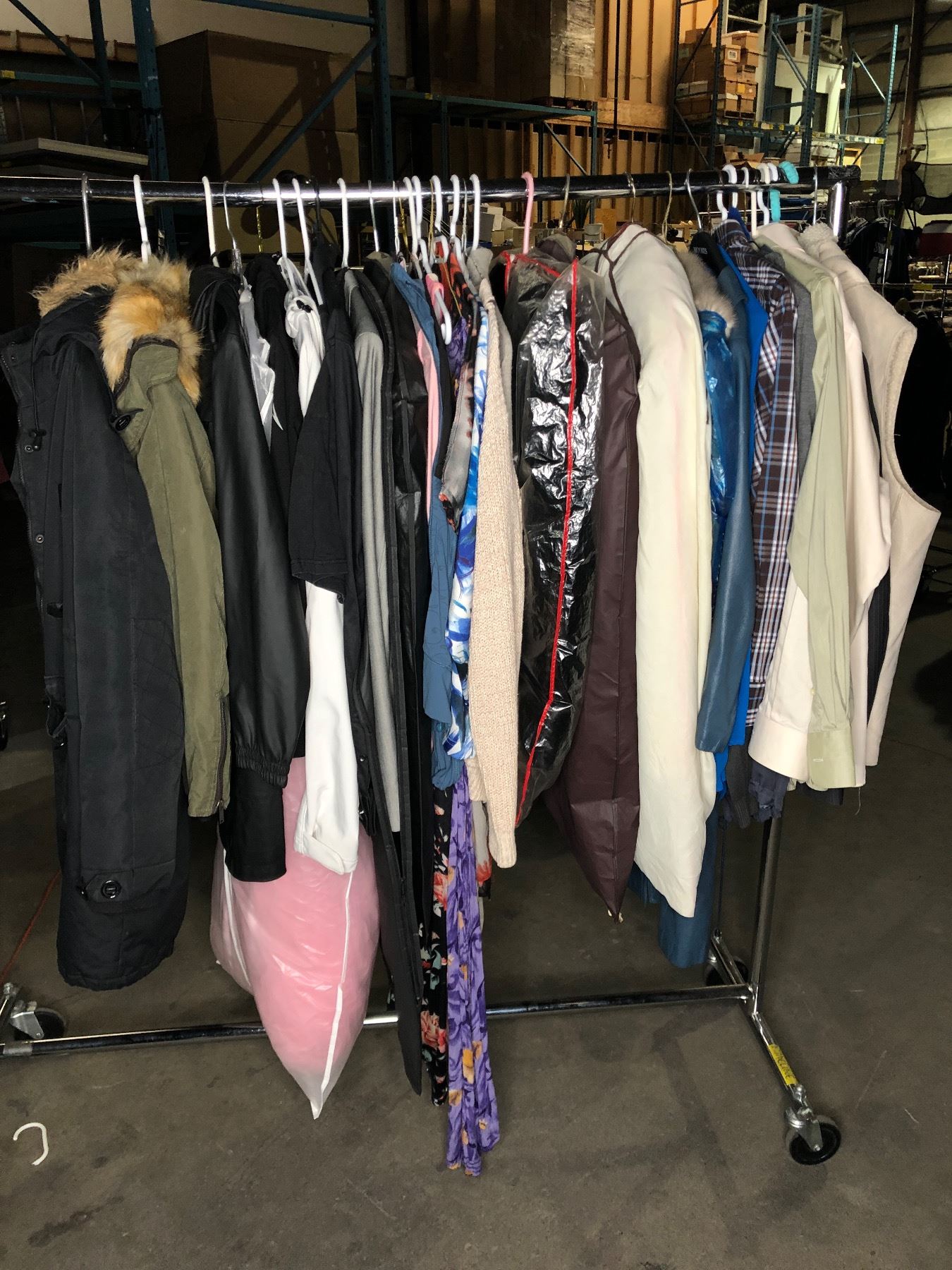 Rack full of assorted clothing - includes winter jackets/ suits/ coats/ leather jacket (approx. 25 pcs) rack included