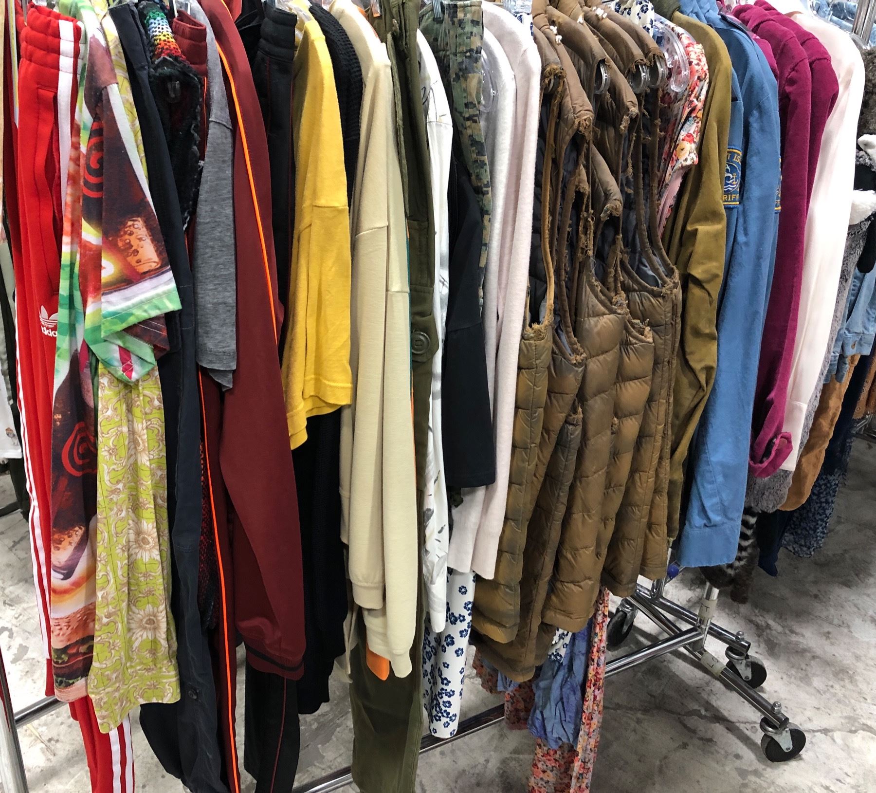 Rack lot of assorted outfits - includes Track suits / Adidas track pants / custom made raccoon pants / hipster short sleeve tops / hats / sweaters / pants / ties / belt w/ bullet / sleeveless puffer vest / custom made pink jackets (approx 50 pcs.)