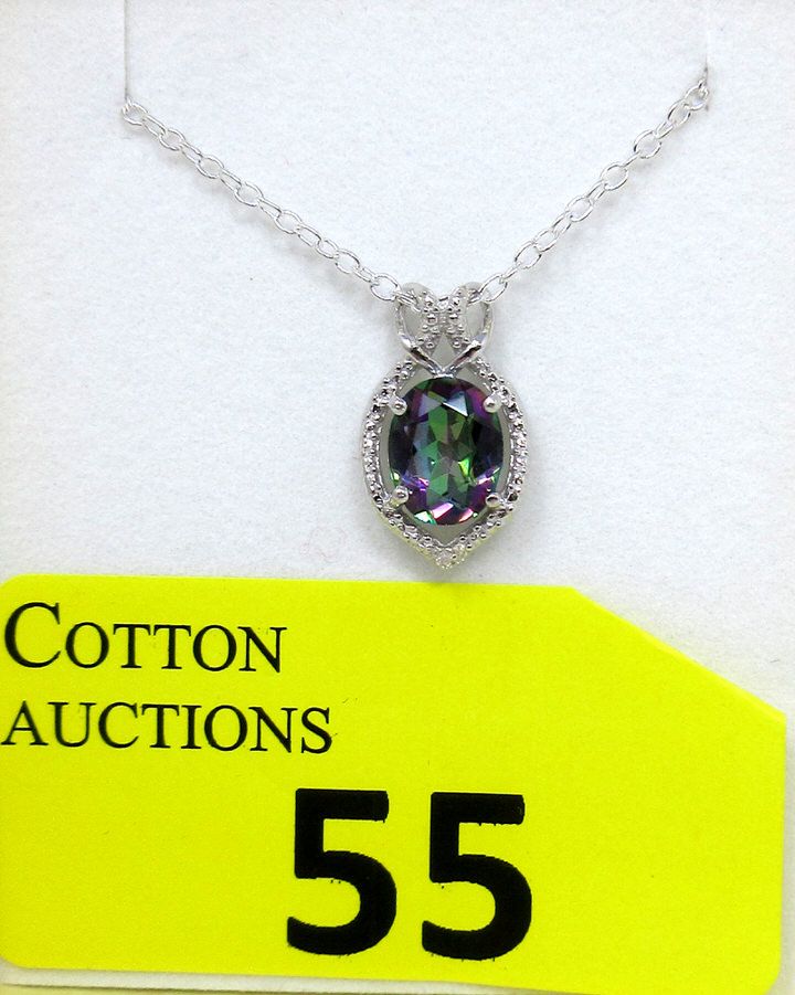 Oval cut topaz with a double loop bail. Set in sterling silver. Includes a chain. Retail value $260.