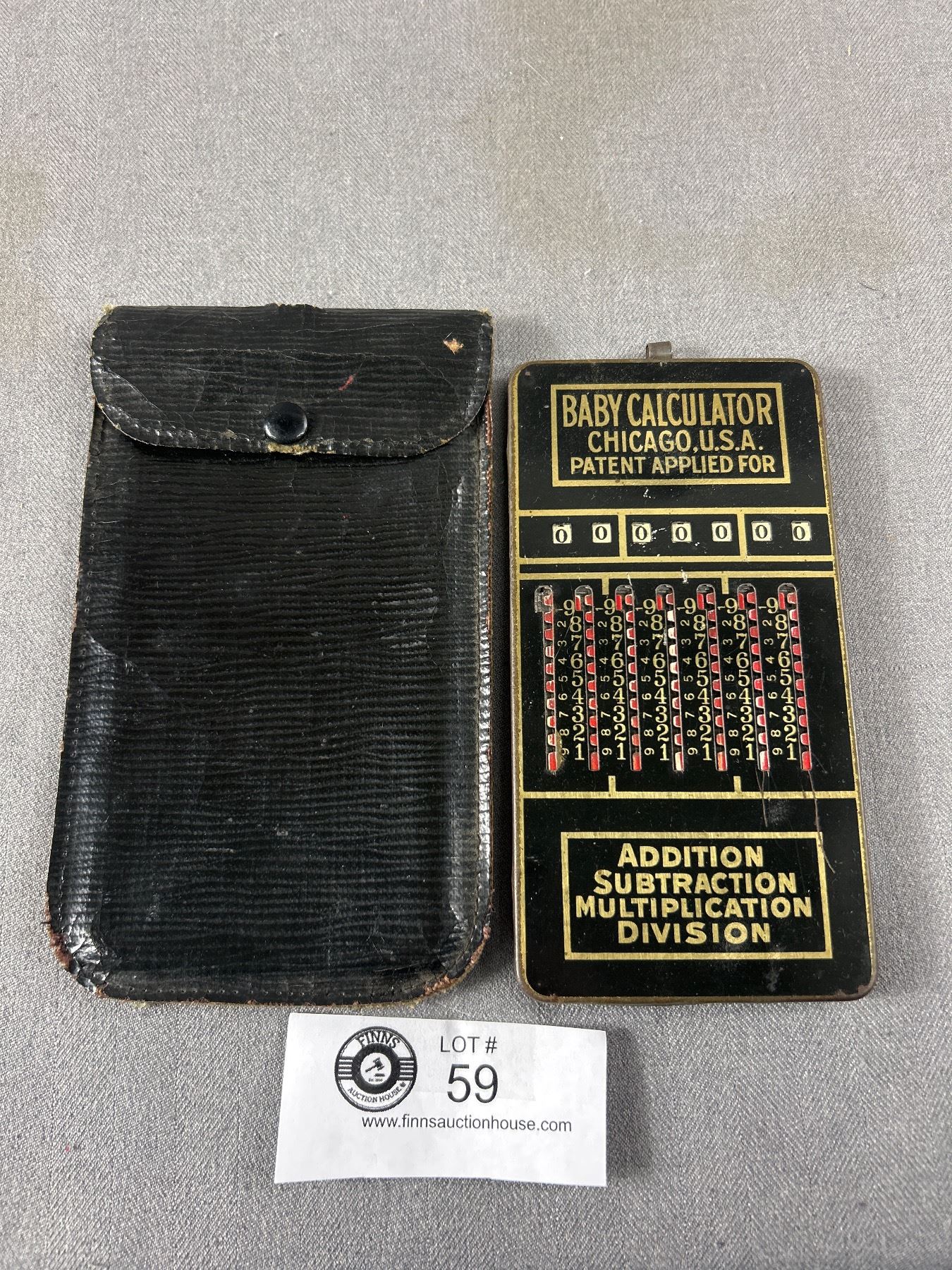 Rare 1930's Tin Litho Baby Calculator w/ Original Wallet