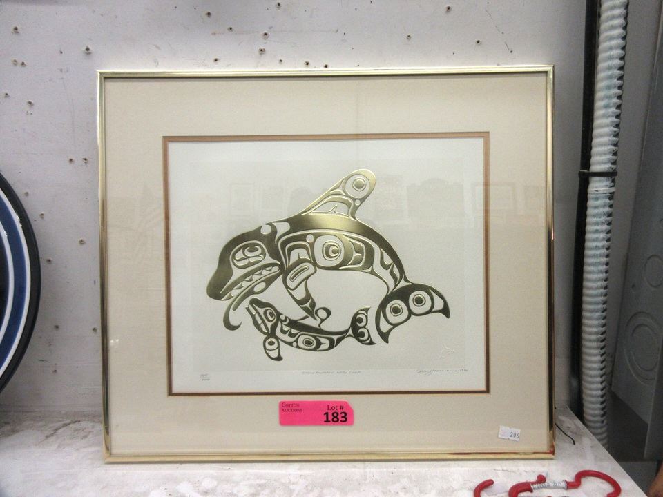 Gold Embossed "Killer Whale with Calf". #705/1000 with signed certificate of authenticity. Hand signed, titled and dated. 18" x 16" framed.