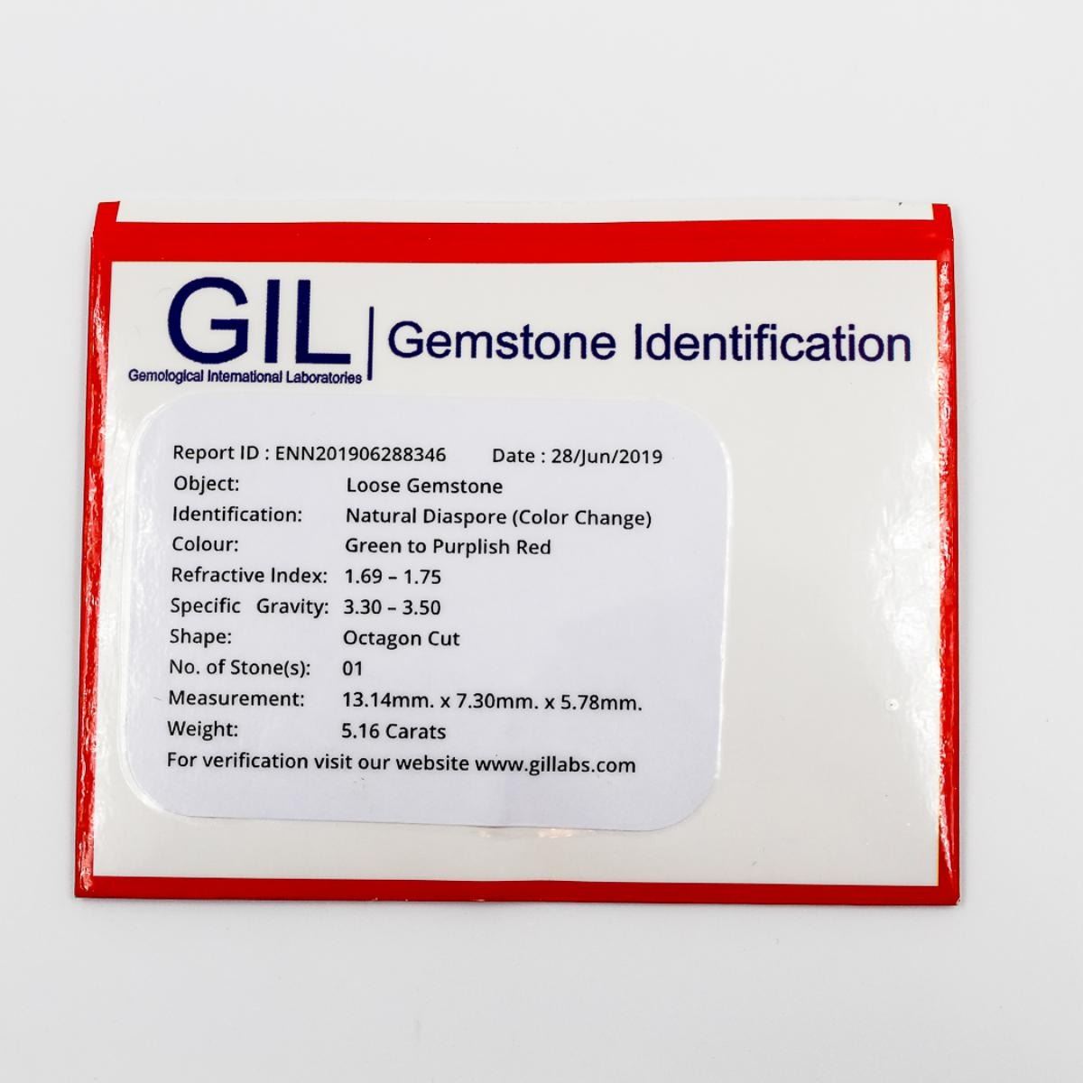 Beautiful Rare 5.16 Ct Certified Natural Color Change Diaspore. This Natural Unheated Diaspore Is A Fine Emerald Cut Measuring 13.14 x 7.30 x 5.78 mm.Color change diaspore is an extremely rare gemstone-quality form of aluminum oxide hydroxide. Color change diaspore is extremely rare and as its descriptive name suggests, it has a unique ability to change color under different lighting conditions. Under natural light, most appear green with flashes of yellow, and under incandescent lighting, most stones will appear pink or champagne in color. When exposed to subdued lighting (candlelight), a light pinkish-orange to raspberry-red color can often be seen.Origin:Turkey. It is hard to find this quality in this larger size. Don't miss this one.