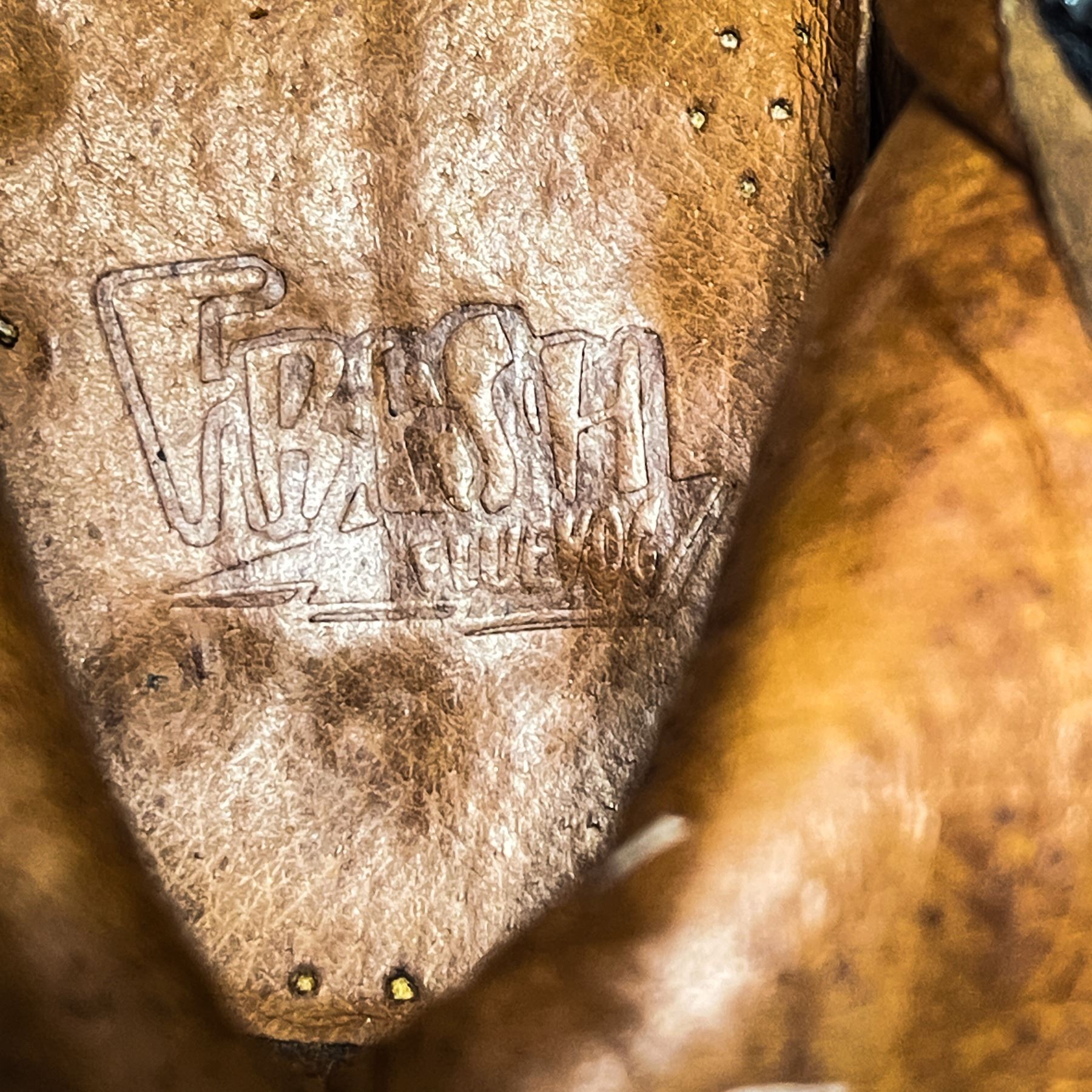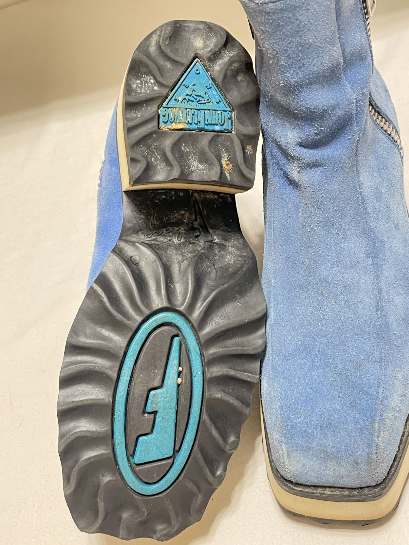 Exceptionally rare early pair of John Fluevog “Fresh Fluevog” platform boots, featuring soft blue suede uppers, chunky sculpted soles, and distinctive double front zippers. These vintage boots embody Fluevog’s avant-garde design roots with bold proportions and unmistakable craftsmanship. The heavy tread soles display the early Fluevog logo and mountain triangle mark, indicating one of the brand’s earlier production eras. Marked size 10, they showcase moderate wear consistent with age, retaining excellent structure and integrity.