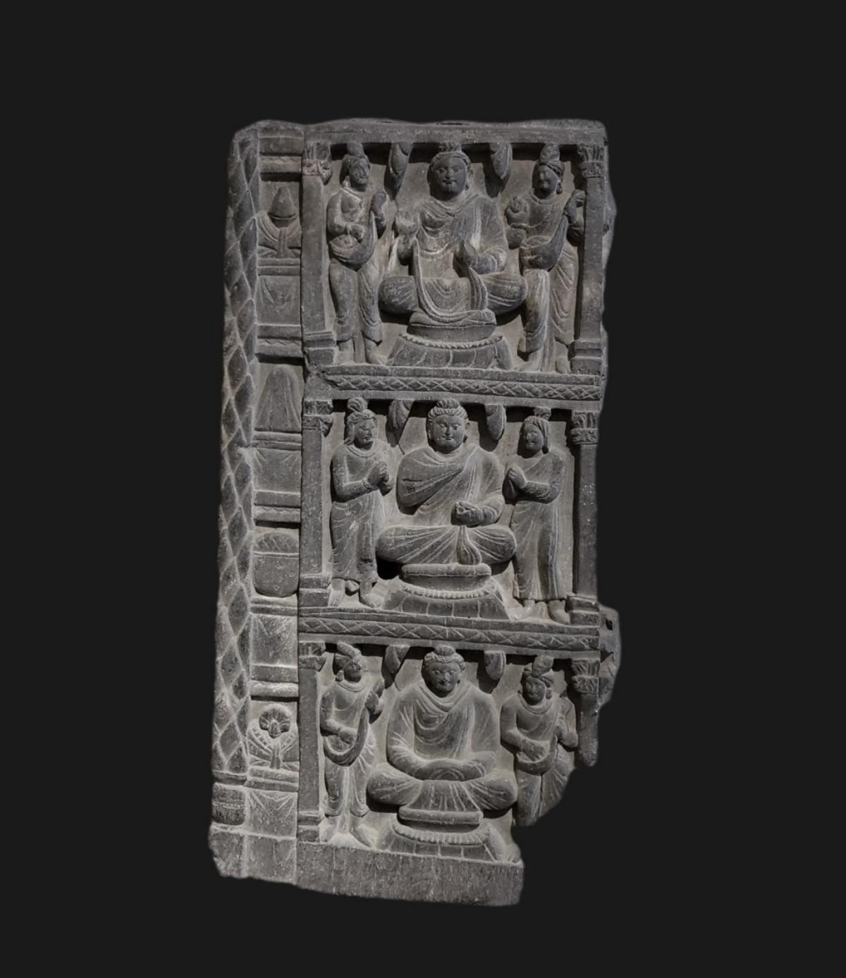 Gandhara sculptures refer to a distinctive style of ancient Buddhist art that flourished in the Gandhara region, located in present-day Pakistan and Afghanistan, during the first few centuries CE. These sculptures are a remarkable fusion of Hellenistic and Indian artistic traditions, reflecting the cultural exchange between the Greco-Roman world and the Indian subcontinent.Gandhara sculptures primarily depict Buddhist themes, particularly the life and teachings of the Buddha. The statues often depict the Buddha in human form, sitting or standing, in postures such as the meditative pose or the teaching gesture. These sculptures exhibit a strong influence from the classical Greek art of the Hellenistic period, characterized by realistic human forms, idealized facial features, and flowing drapery. These sculptures were not limited to religious contexts alone; they were also used to adorn monastic complexes, stupas, and other architectural structures. Today, the Gandhara sculptures are regarded as important historical and artistic treasures. Many of these sculptures can be found in museums around the world, including the Peshawar Museum in Pakistan, the National Museum in Delhi, India, and the British Museum in London. They serve as a tangible link to a fascinating period of cultural exchange and artistic fusion between the East and the West.Material: Grey SchistSize: 67 cm