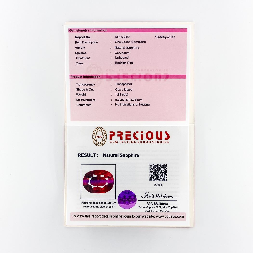 Gorgeous Rare Un-Heated Certified 1.89 Ct. Red dish/Pink Sapphire.This natural red sapphie is a fine oval cut measuring 7.85 x 6.43 x 3.73 mm. Eye clean. Ready to mount.Please see certification for further details