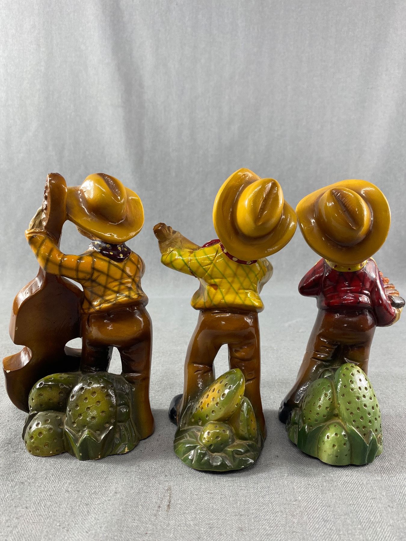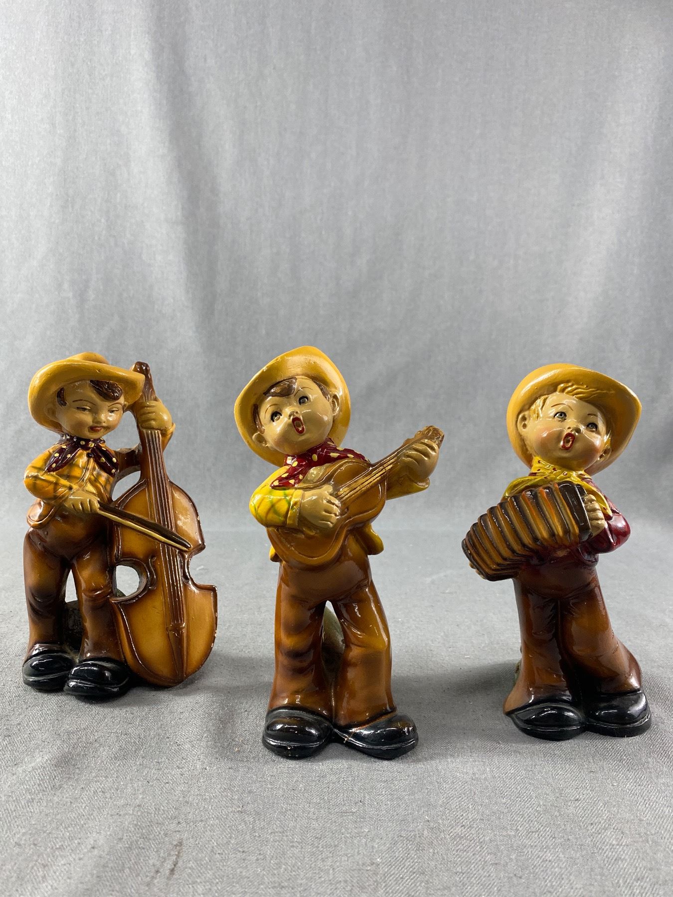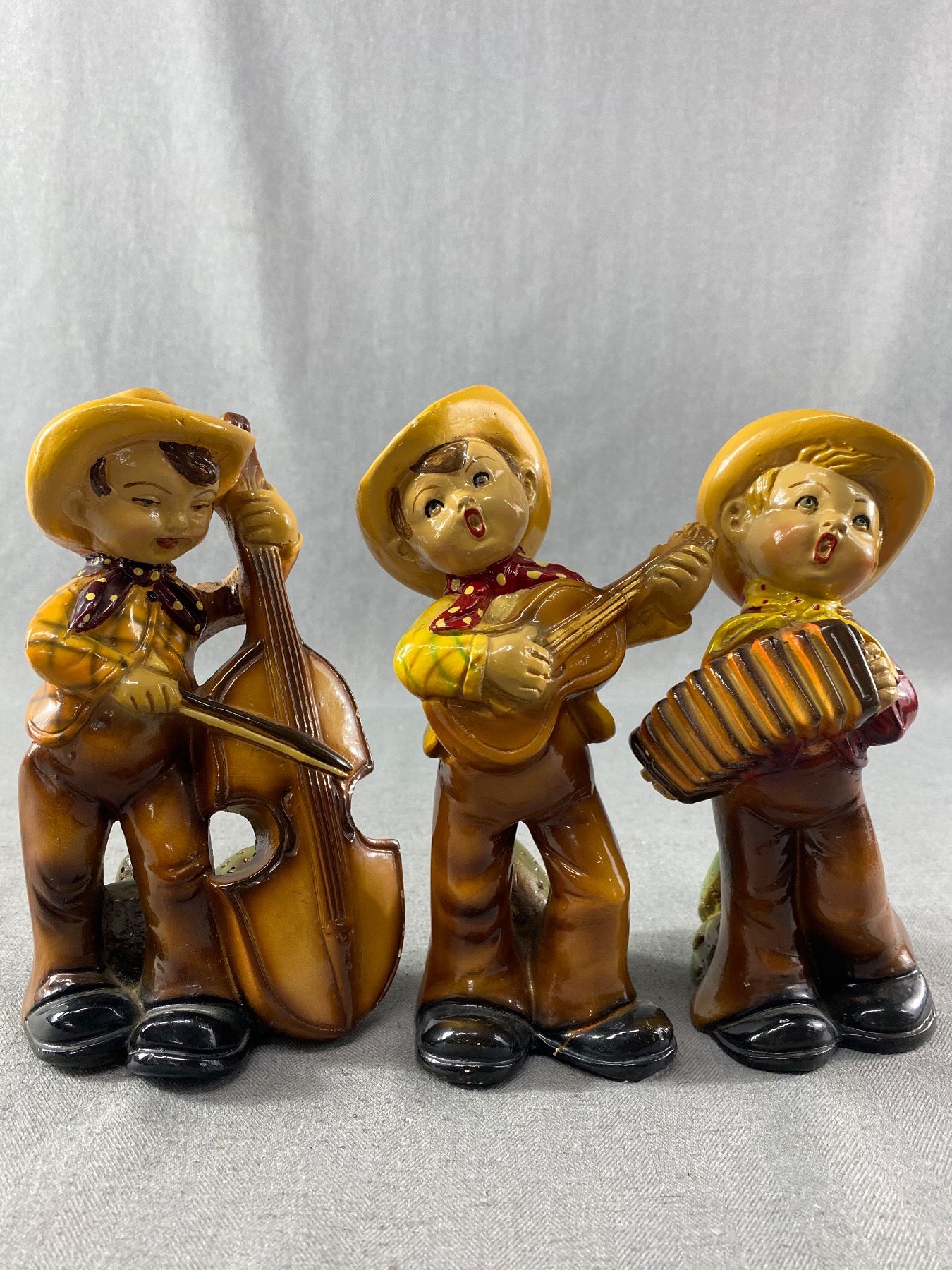 Rare Vintage Hand Painted Devon Ware Little Cowboy Musicians - Made By Kahame. Approx. 8" H (early repair on one arm)