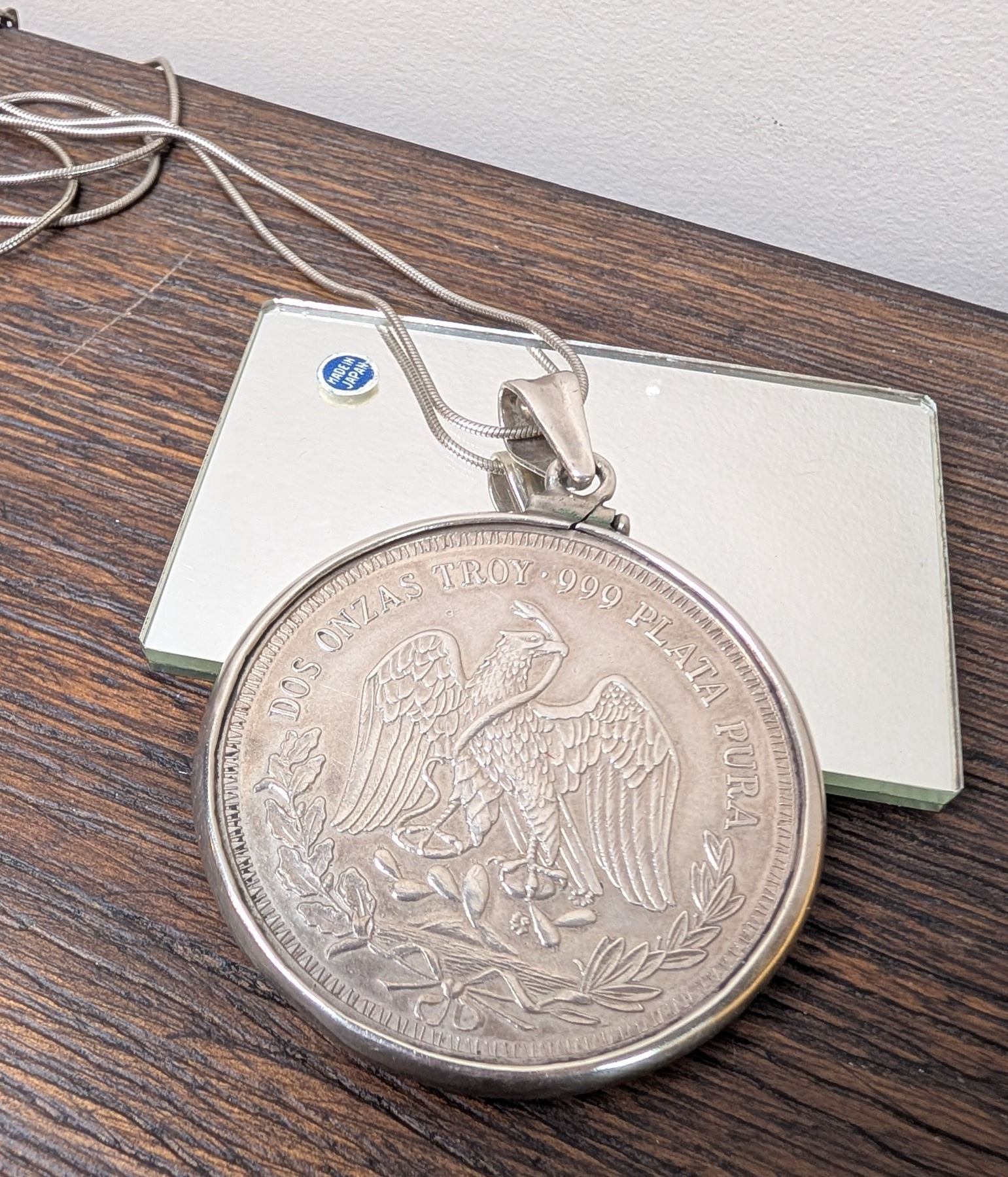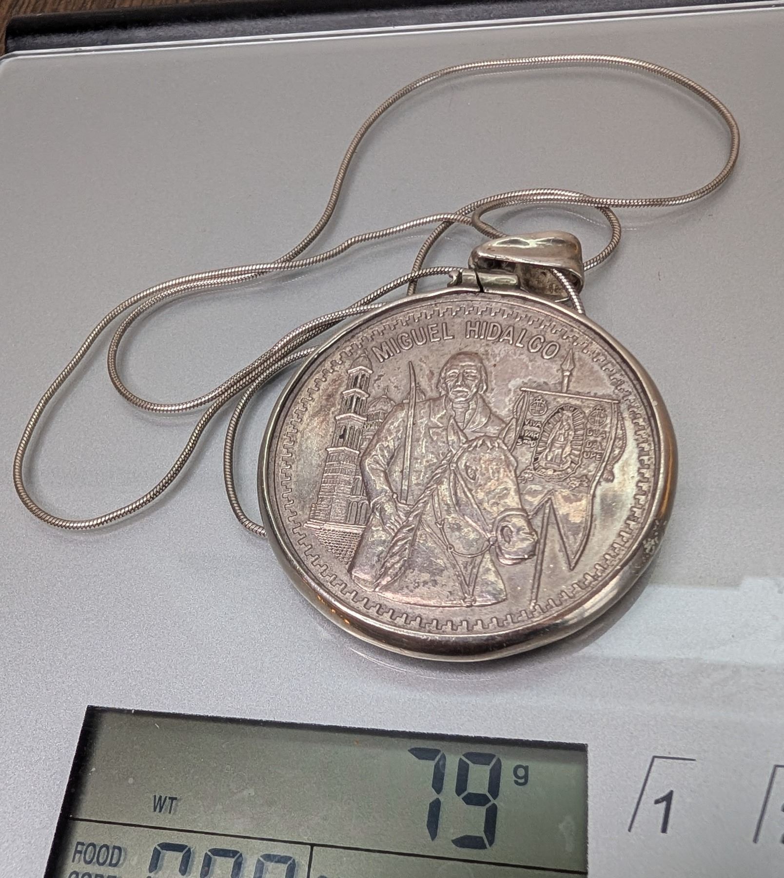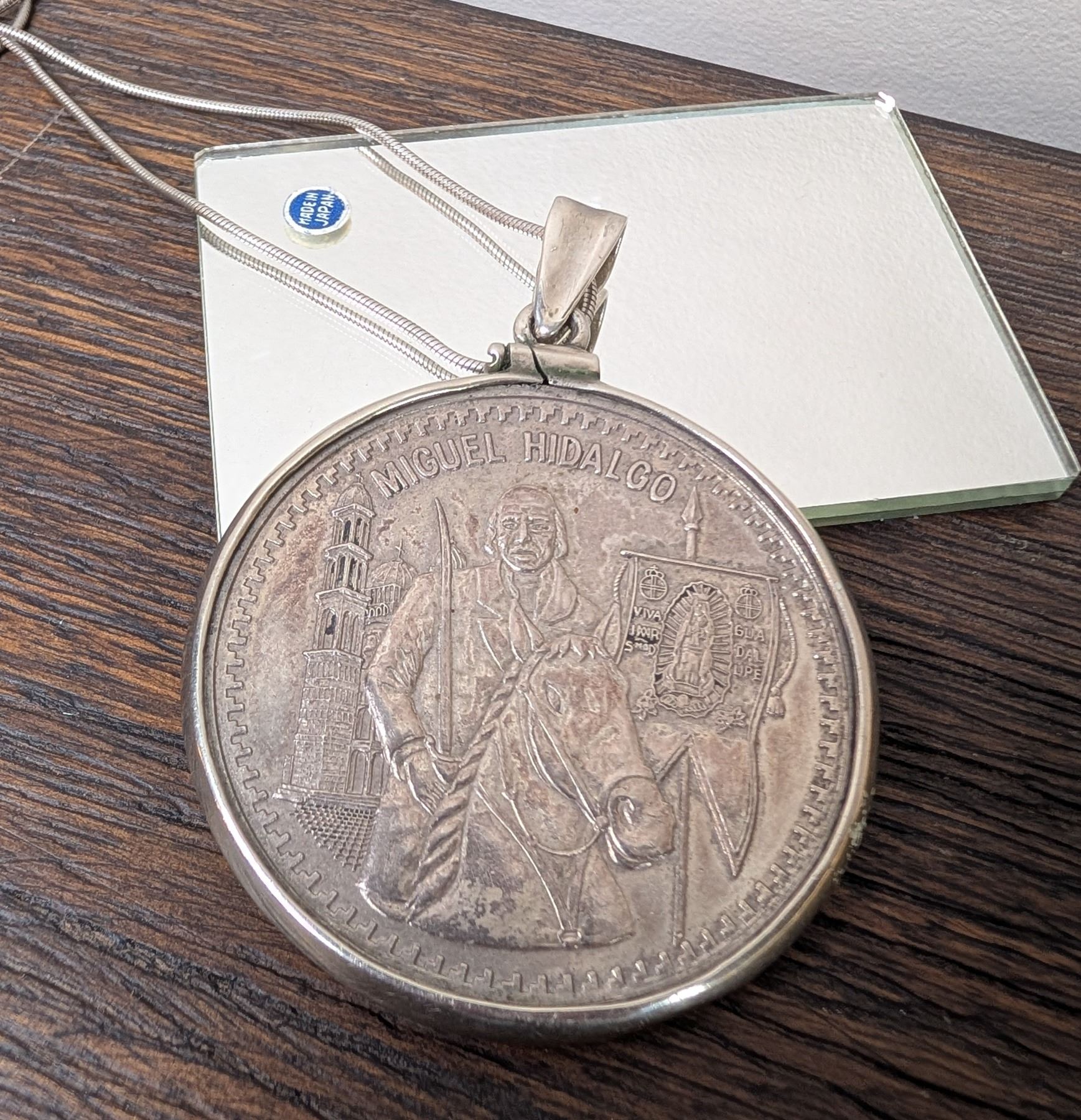 Rare Vintage MIGUEL HIDALGO 2 Ounces .999 Silver Round coin converted to pendant with chain