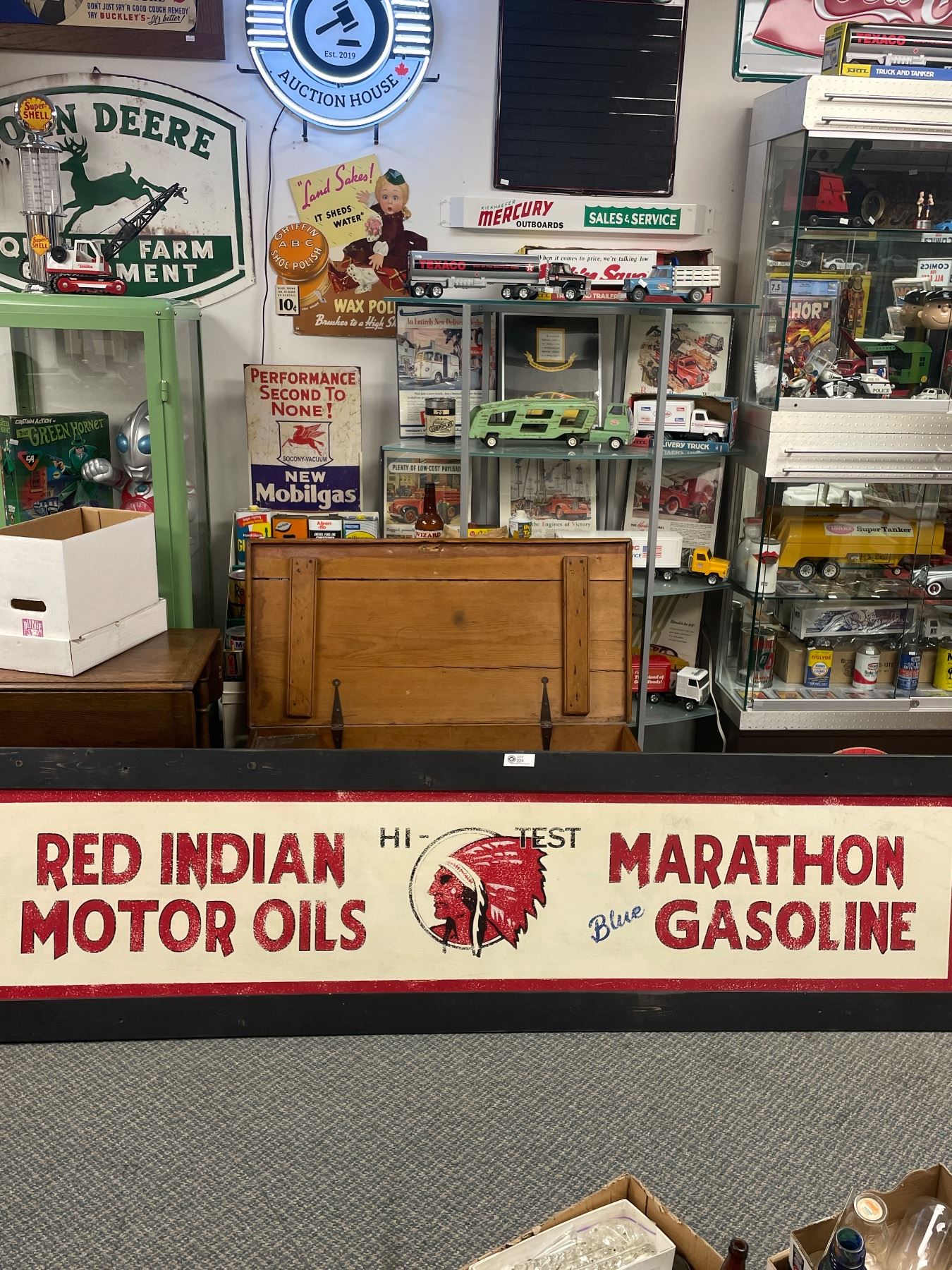 Red Indian Motor Oils Blue Marathon Gasoline Sign, Custom Made. 92" L x 24 1/2" H